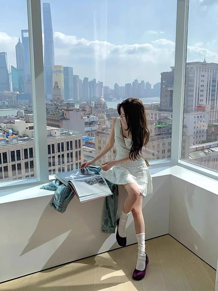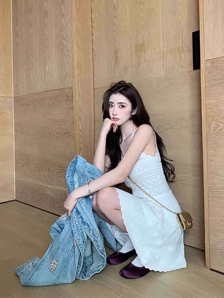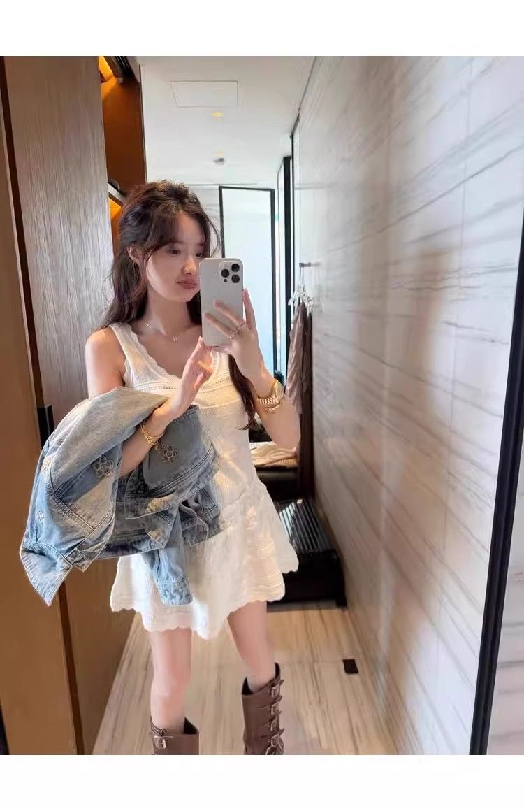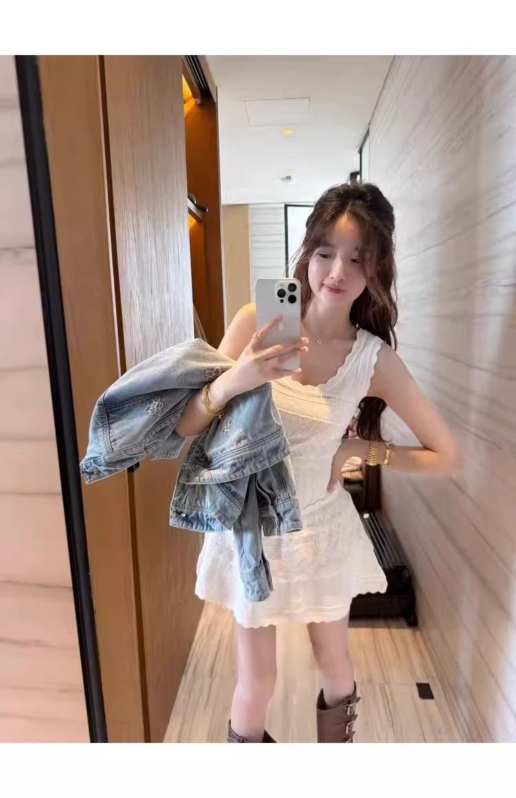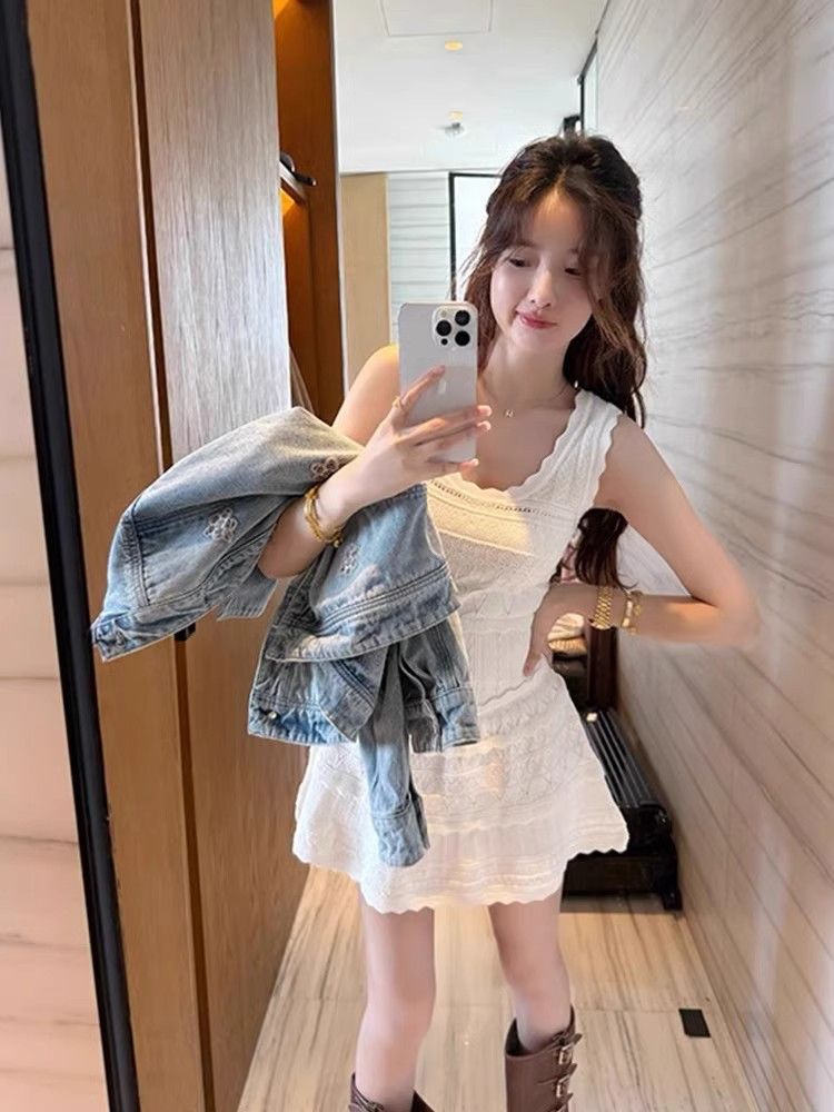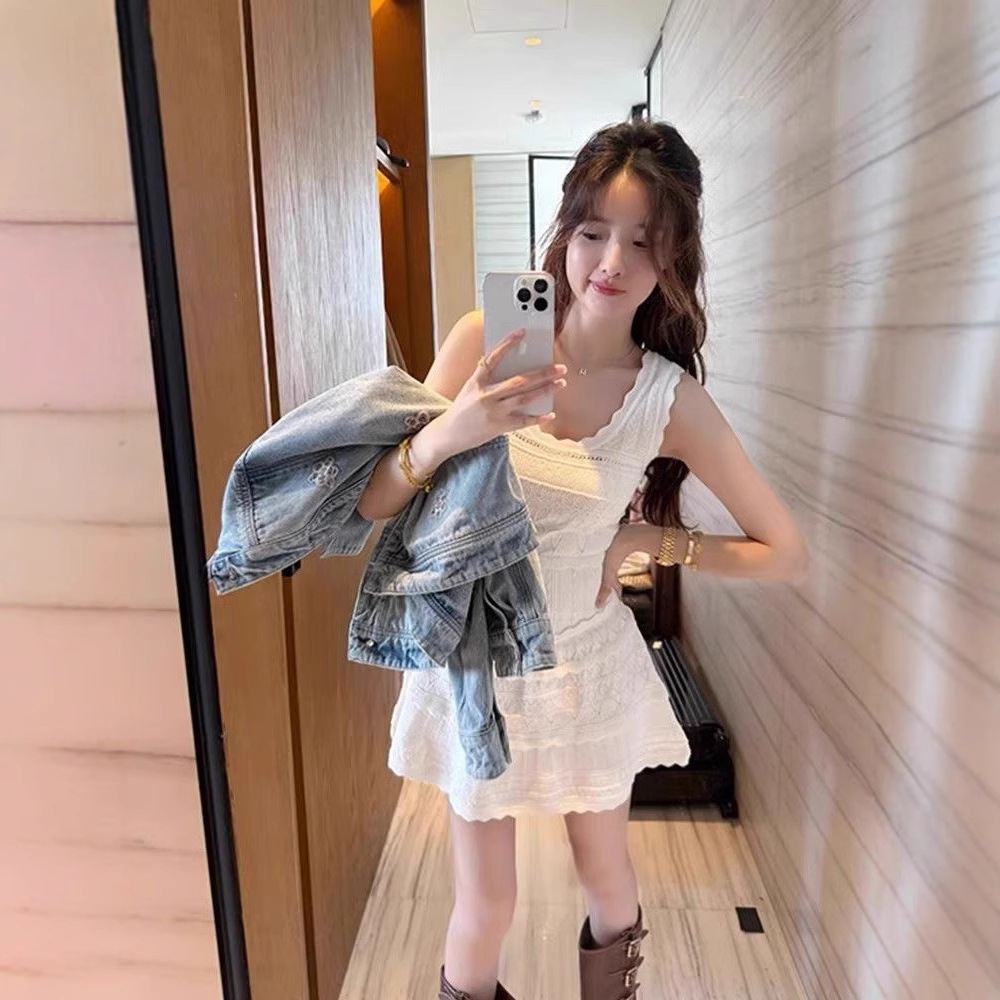 여름 프랑스 스타일 우아한 화이트 레이스 U 넥 섹시 할로우 민소매 니트 조끼 원피스 여성 A 라인 작은 우산 스커트스토어 가기