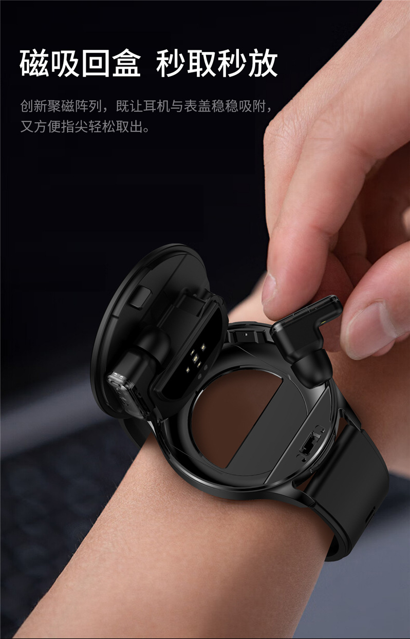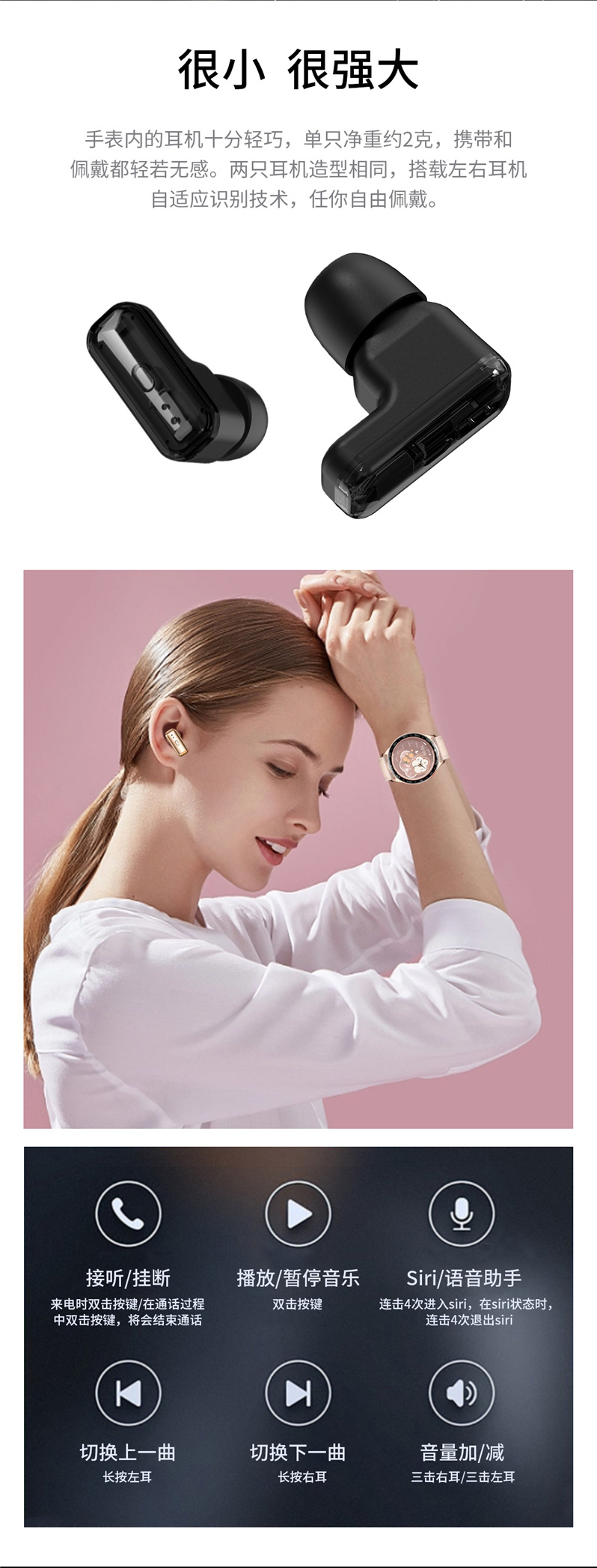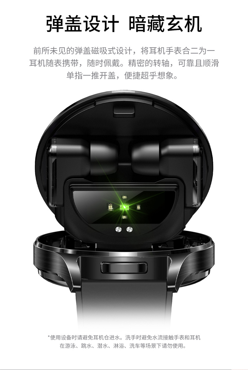 全入耳式佩戴,无痛舒适。金属工艺,完美音质,带柄设计,双向降噪,通话更清晰,采用稳定中科蓝讯(AB5656A2)高品质稳定双发不分主从,超强信号空旷地区蓝牙信号可达25米,穿墙可达15米,内置5.0双蓝牙,HIFI 9D音质,触摸传感器,AI语音 SIRI唤醒。耳机放入手表仓收纳即充电,随取随用,放于手表仓便于收纳,耳机收纳于手表即充电。