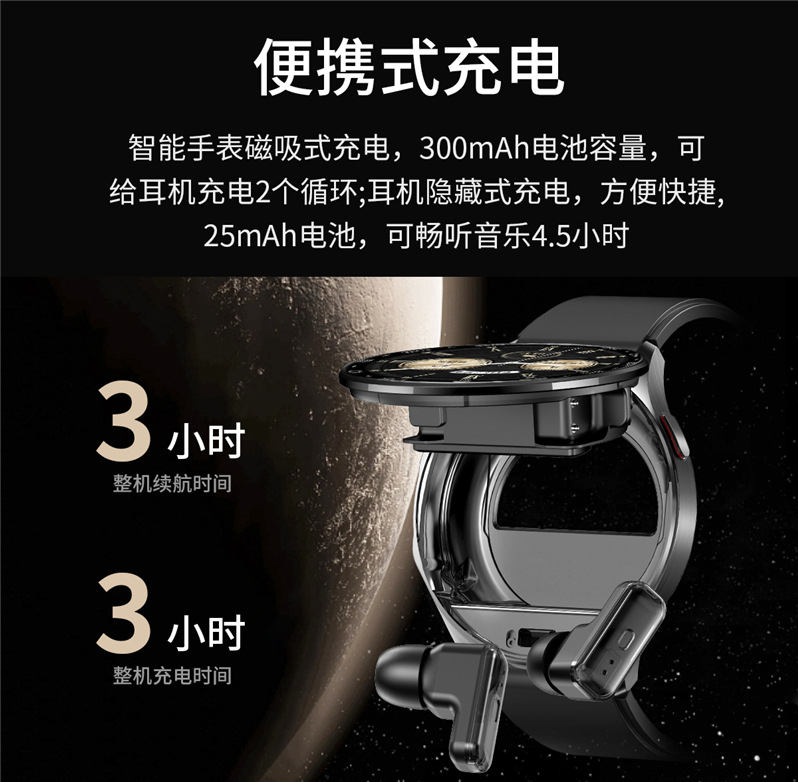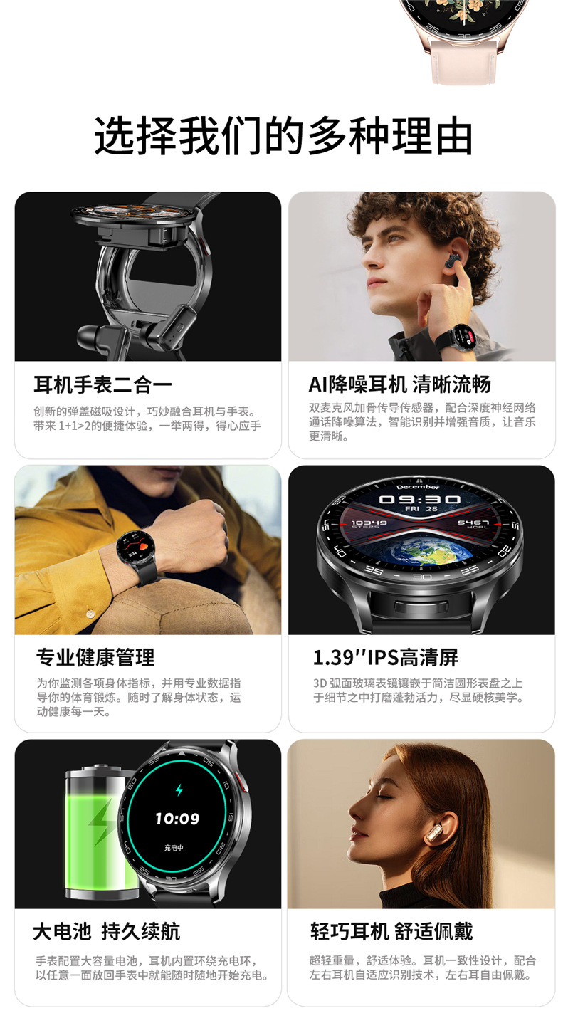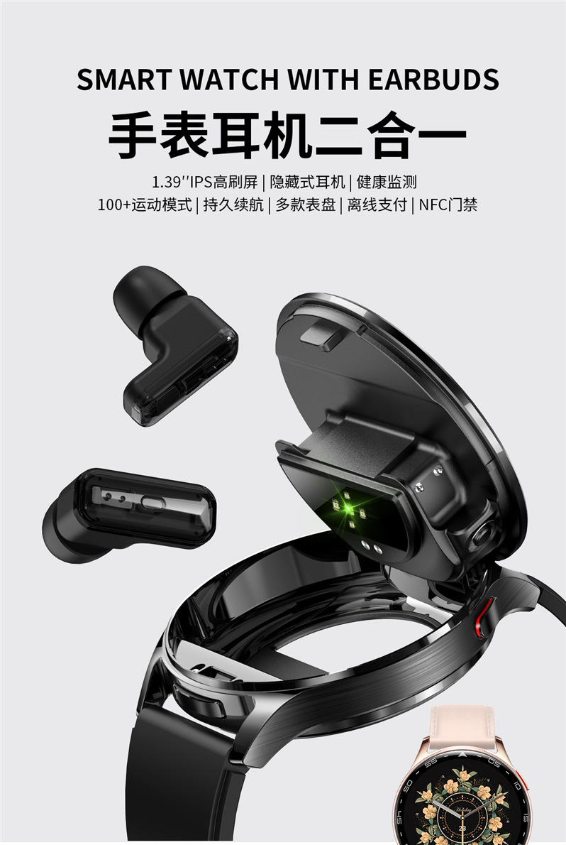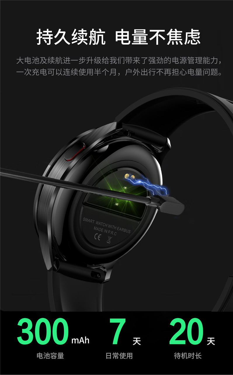 全入耳式佩戴,无痛舒适。金属工艺,完美音质,带柄设计,双向降噪,通话更清晰,采用稳定中科蓝讯(AB5656A2)高品质稳定双发不分主从,超强信号空旷地区蓝牙信号可达25米,穿墙可达15米,内置5.0双蓝牙,HIFI 9D音质,触摸传感器,AI语音 SIRI唤醒。耳机放入手表仓收纳即充电,随取随用,放于手表仓便于收纳,耳机收纳于手表即充电。
