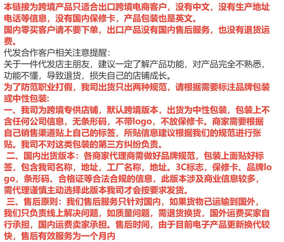下单即客户默认,如因为语言问题造成退货运费由客人自行承担,感谢您的配合!