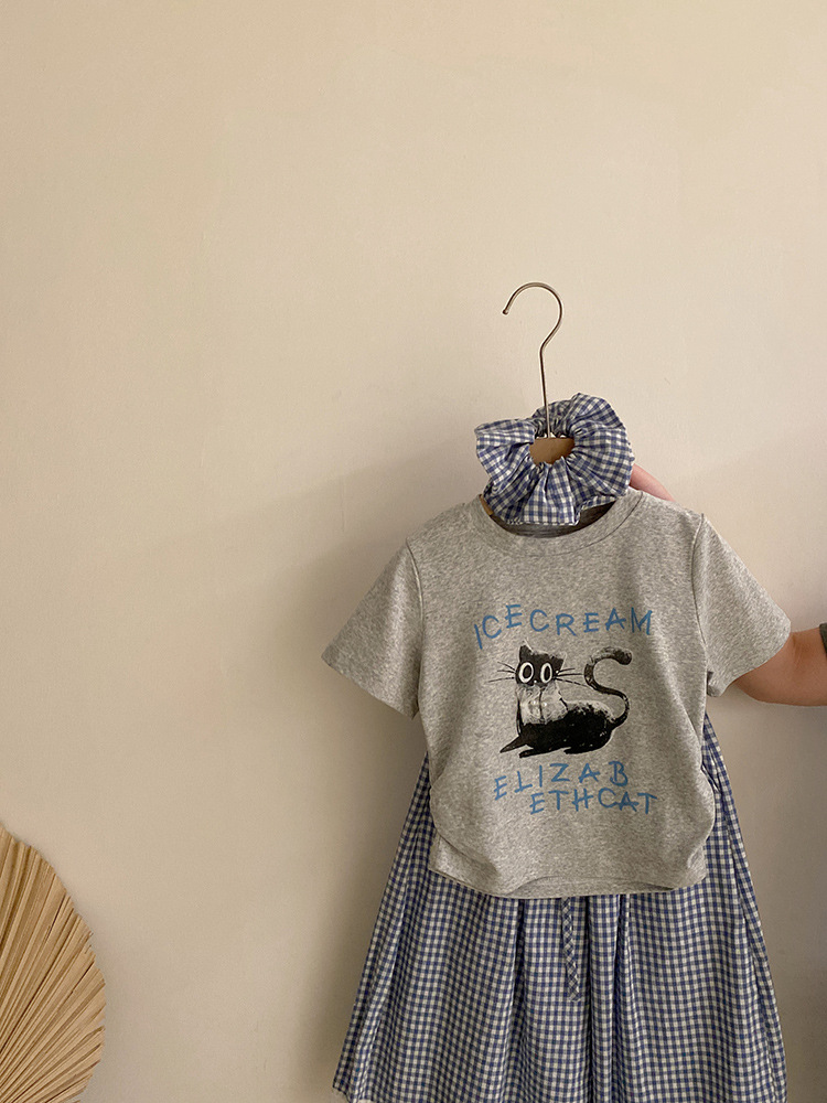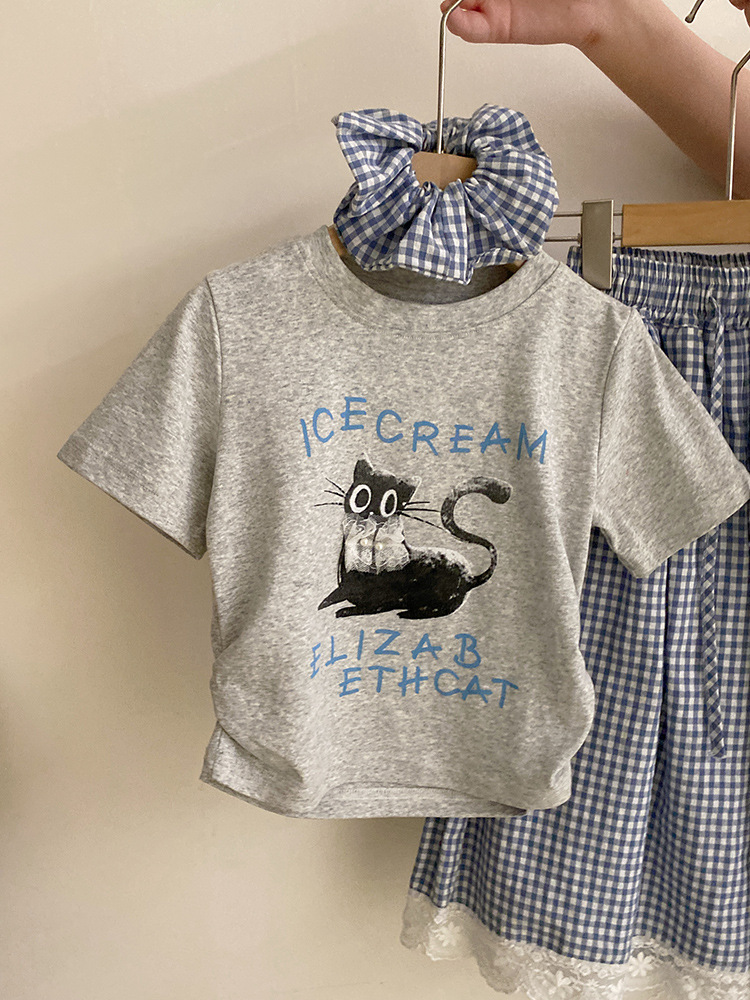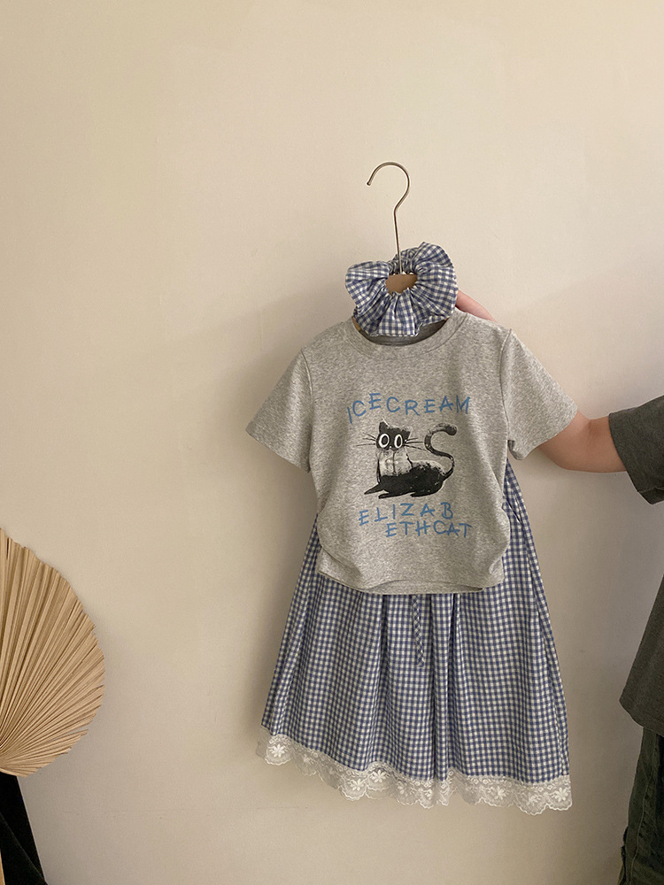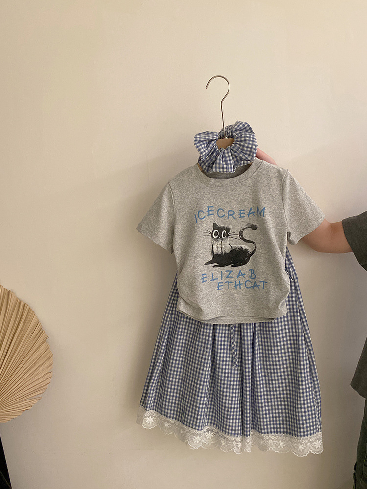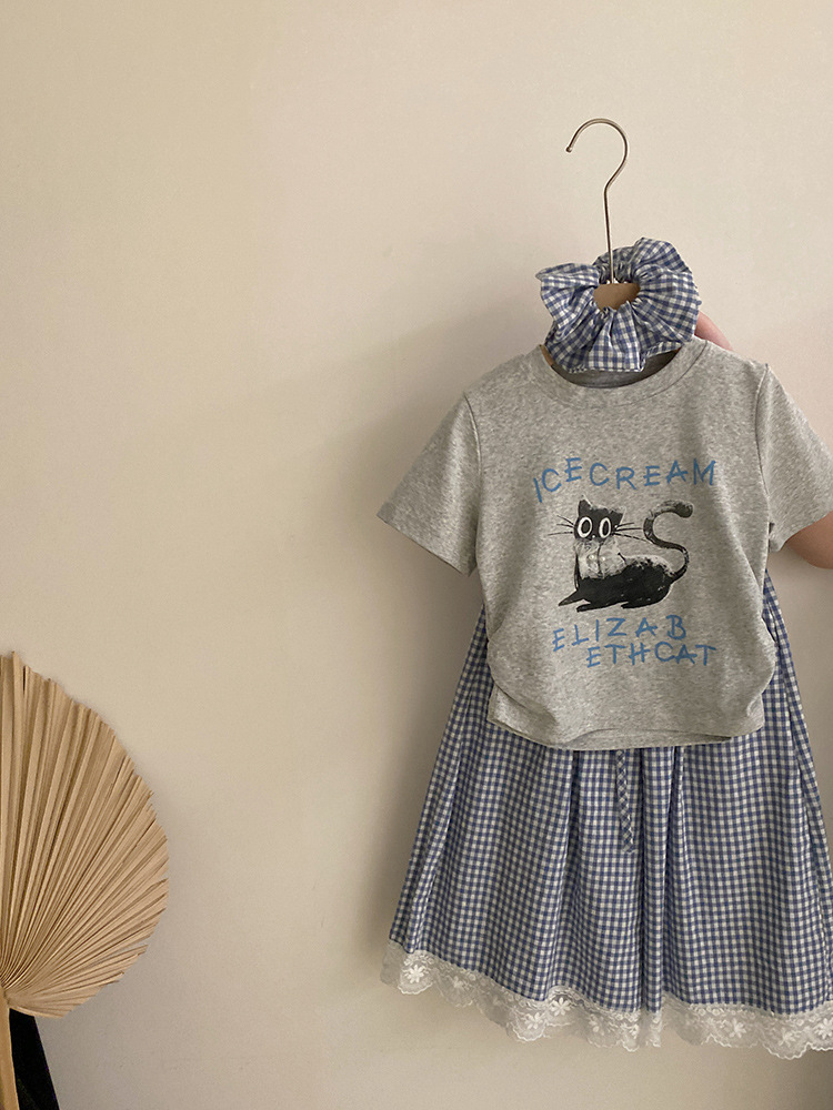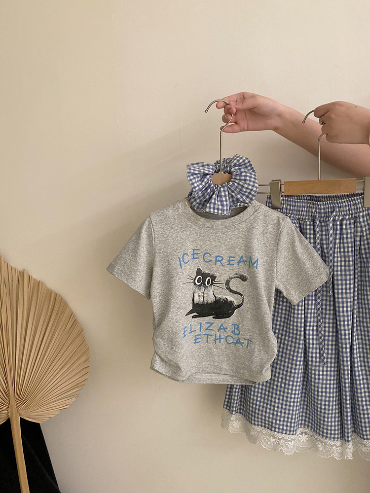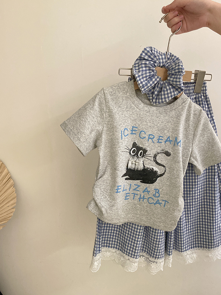 걸스 여름 한국식 캐주얼 반팔 티셔츠 얇은 체크 무늬 바지 세트 중 · 빅 키즈 소녀 서양식 투피스 세트