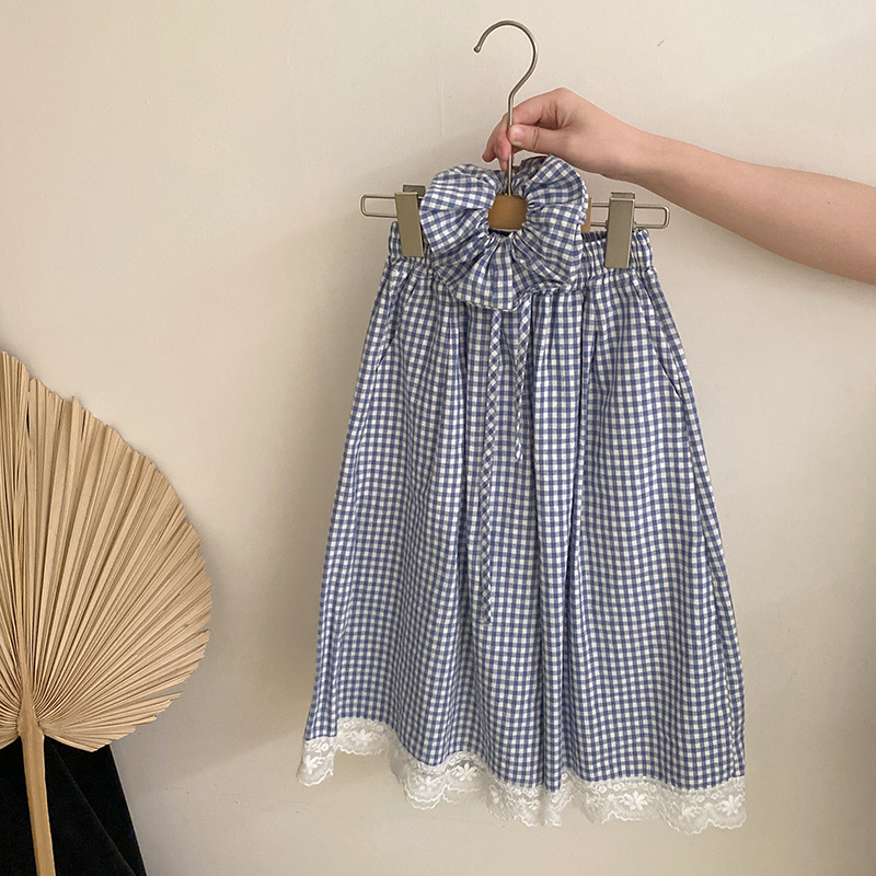 걸스 여름 한국식 캐주얼 반팔 티셔츠 얇은 체크 무늬 바지 세트 중 · 빅 키즈 소녀 서양식 투피스 세트스토어 가기