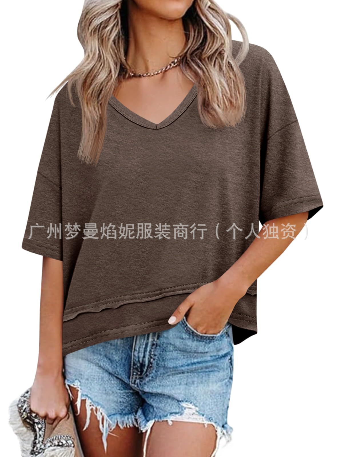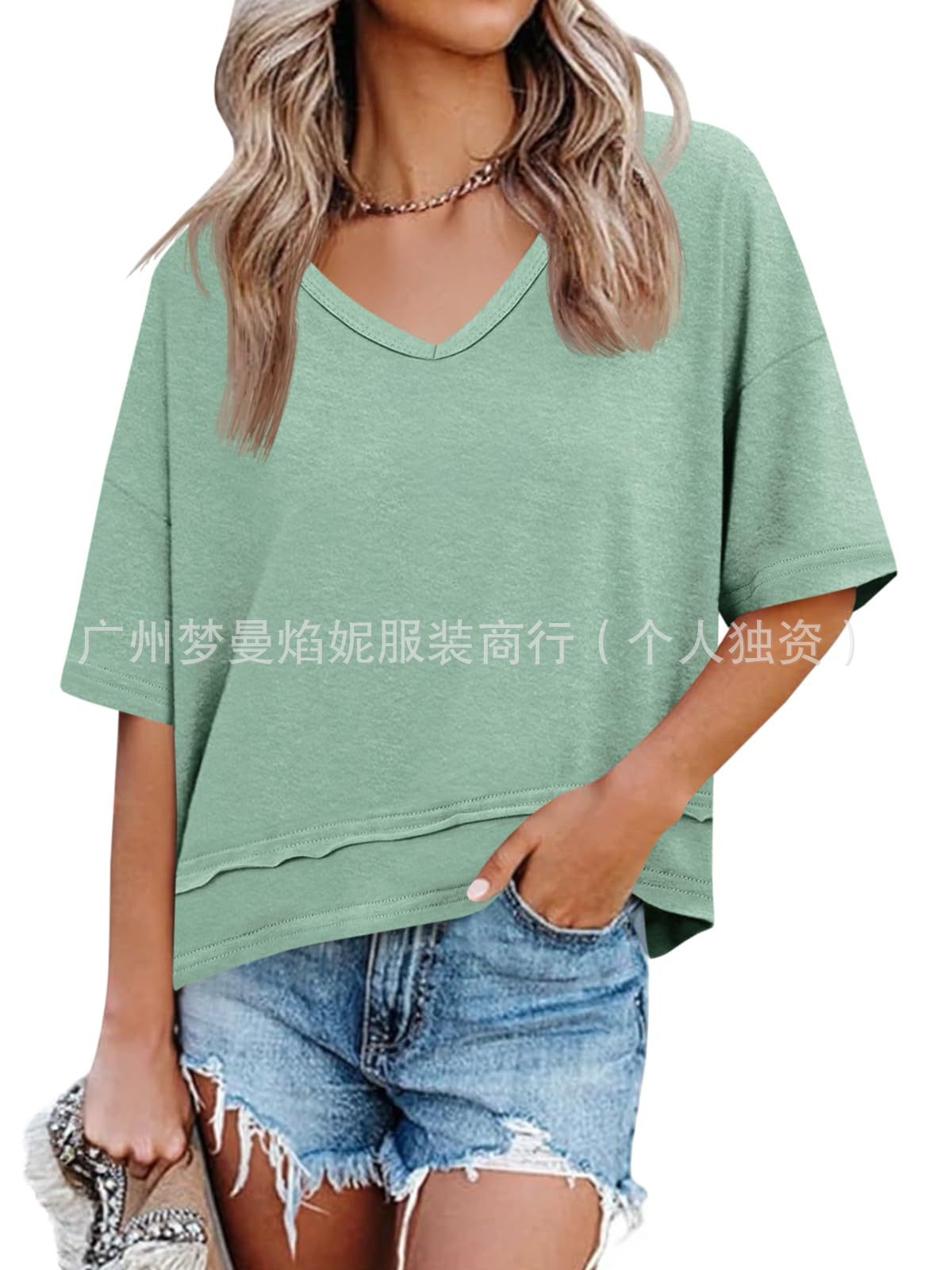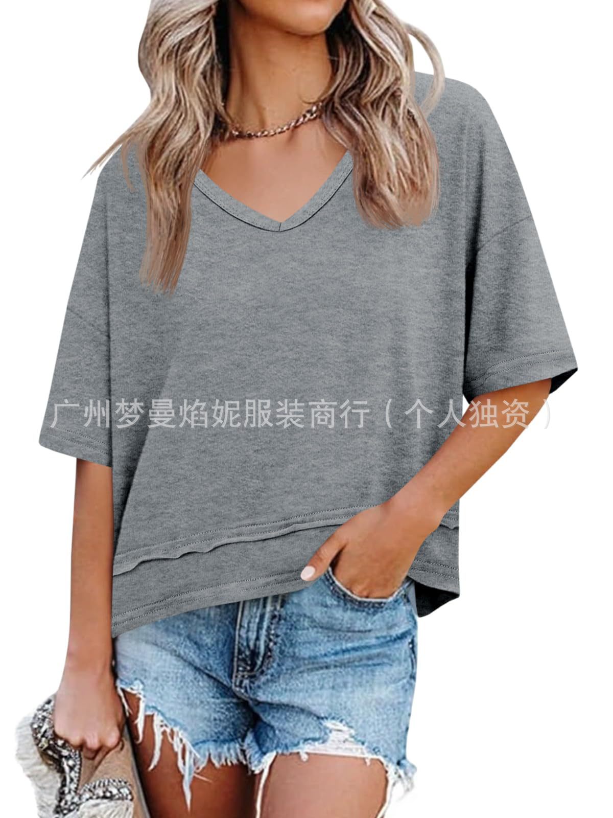 2025 Amazon 크로스보더 유럽과 미국의 새로운 여성 의류 캐주얼 기질 디자인 솔리드 컬러 반팔 v 넥 티셔츠 탑 여성스토어 가기