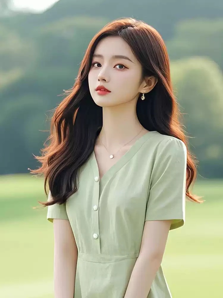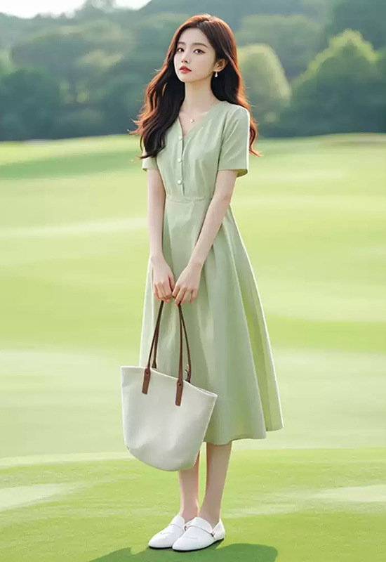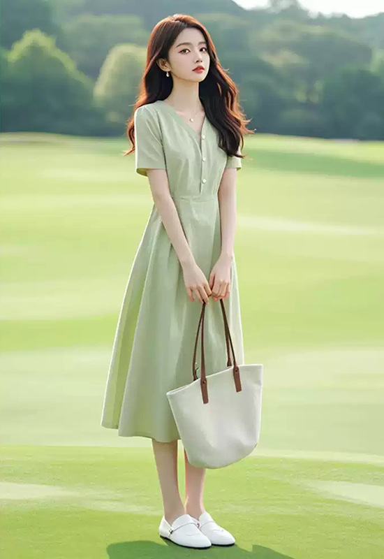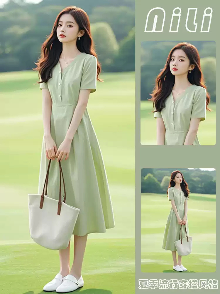 여름 새로운 약간의 뚱뚱한 소녀 서양식 연령 감소 커버 팔 낚시 데이트 휴일 스타일 미니멀리스트 그린 원피스