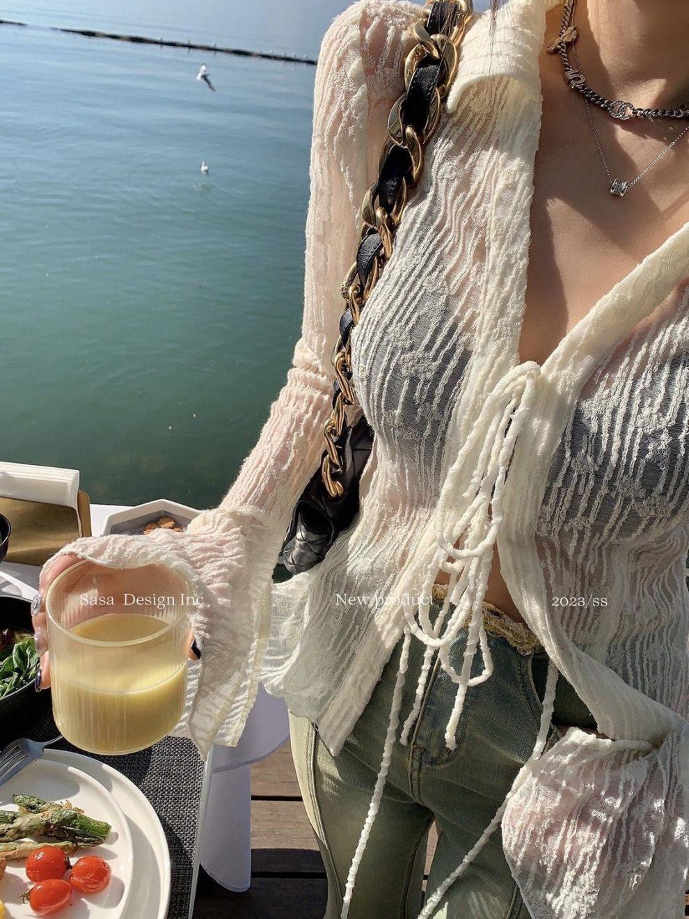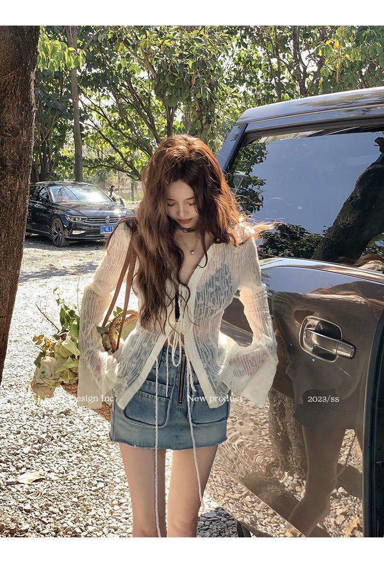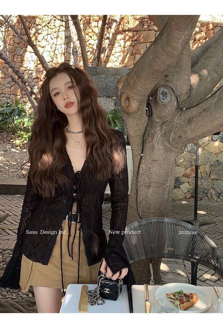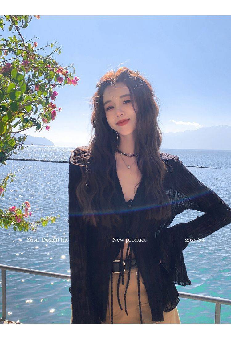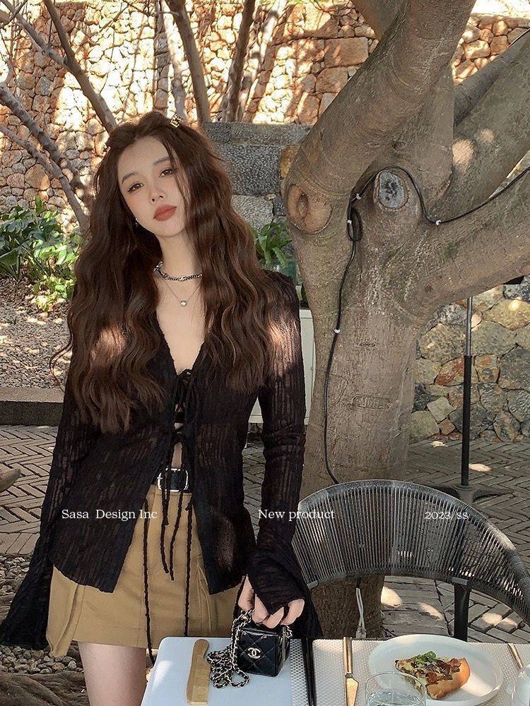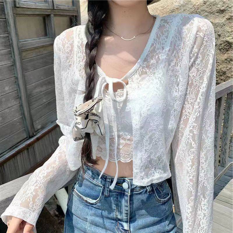 프랑스 스타일 V-Neck 레이스 셔츠 여성의 봄과 여름 얇은 슬림 우아한 순수한 욕망 스타일 성격 뜨거운 소녀 시폰 카디건 탑