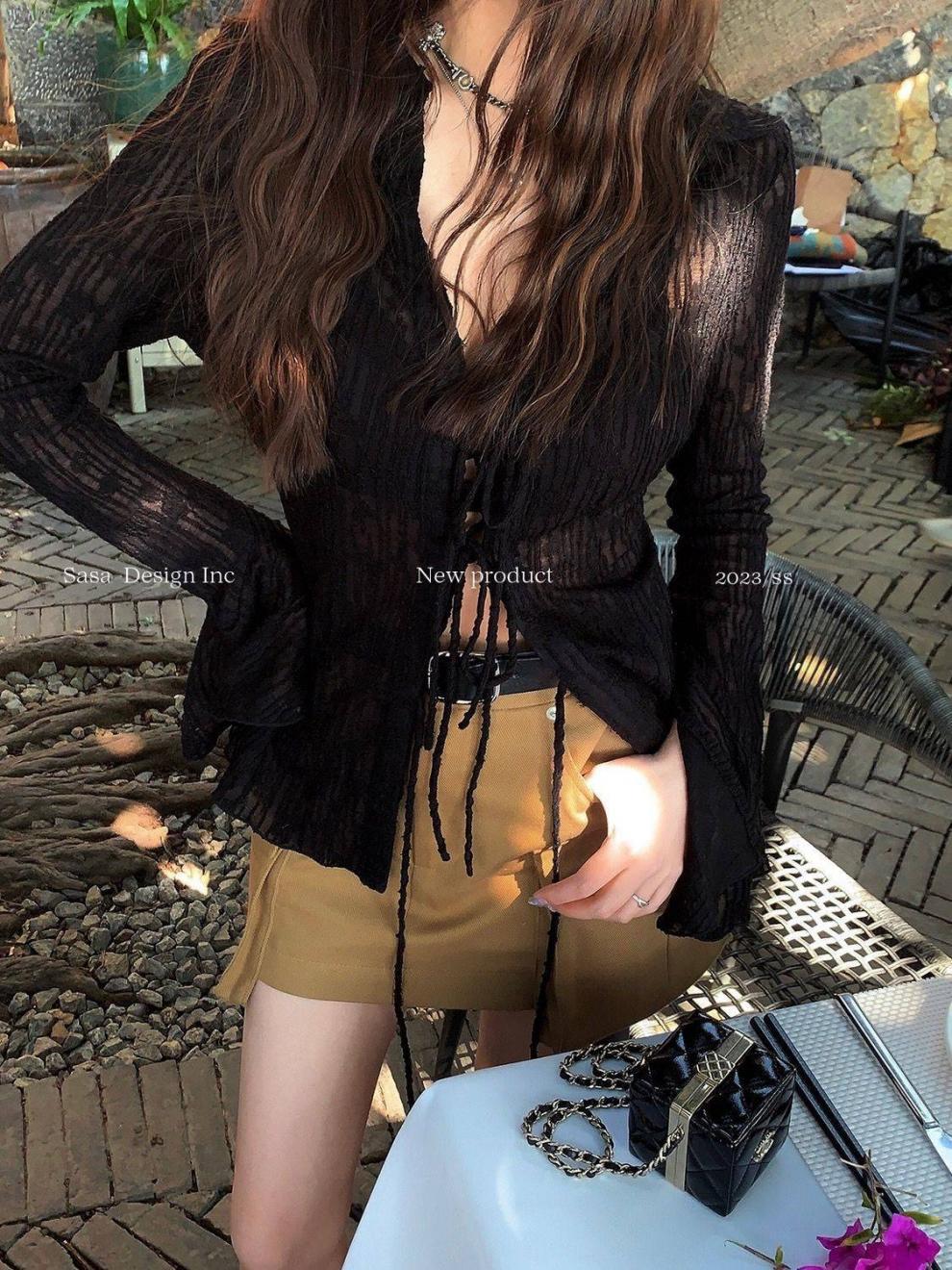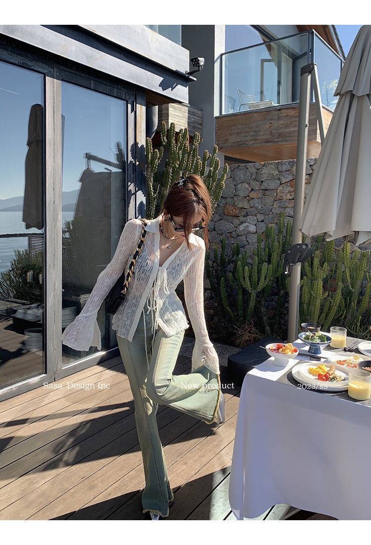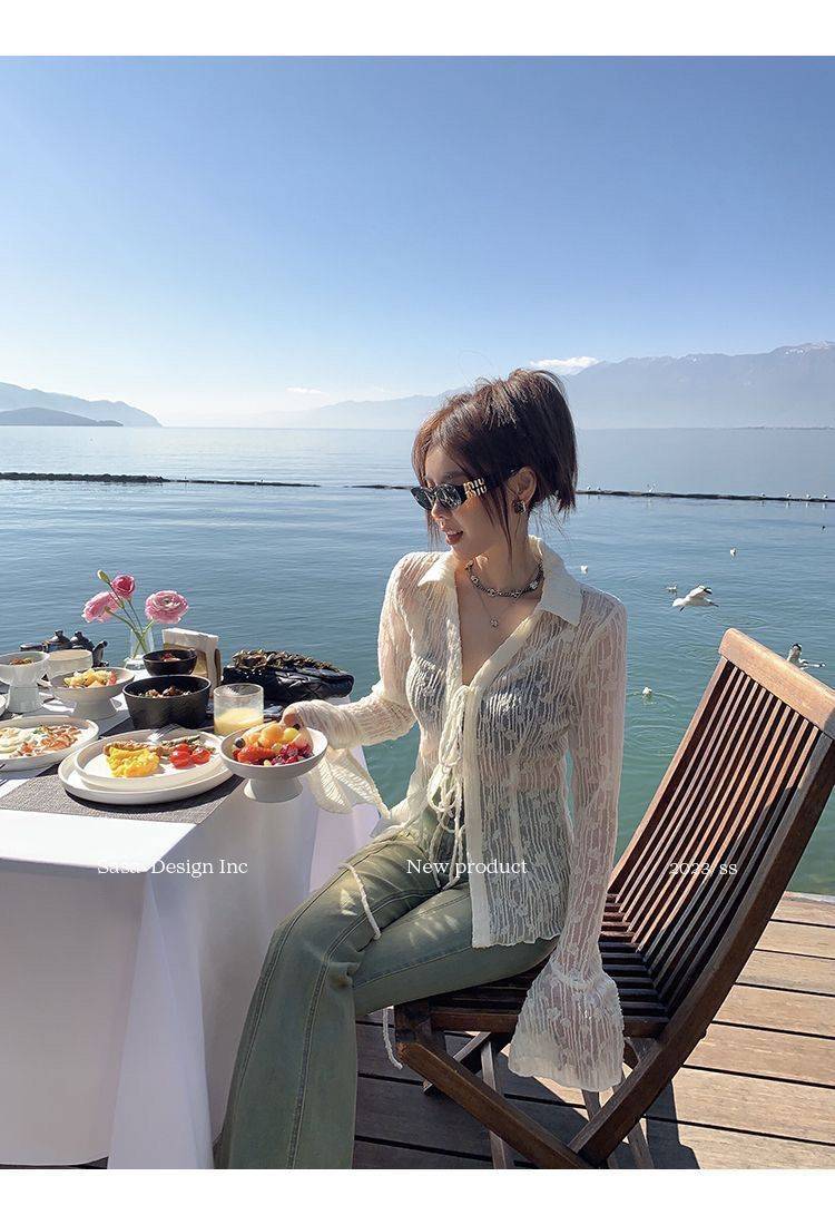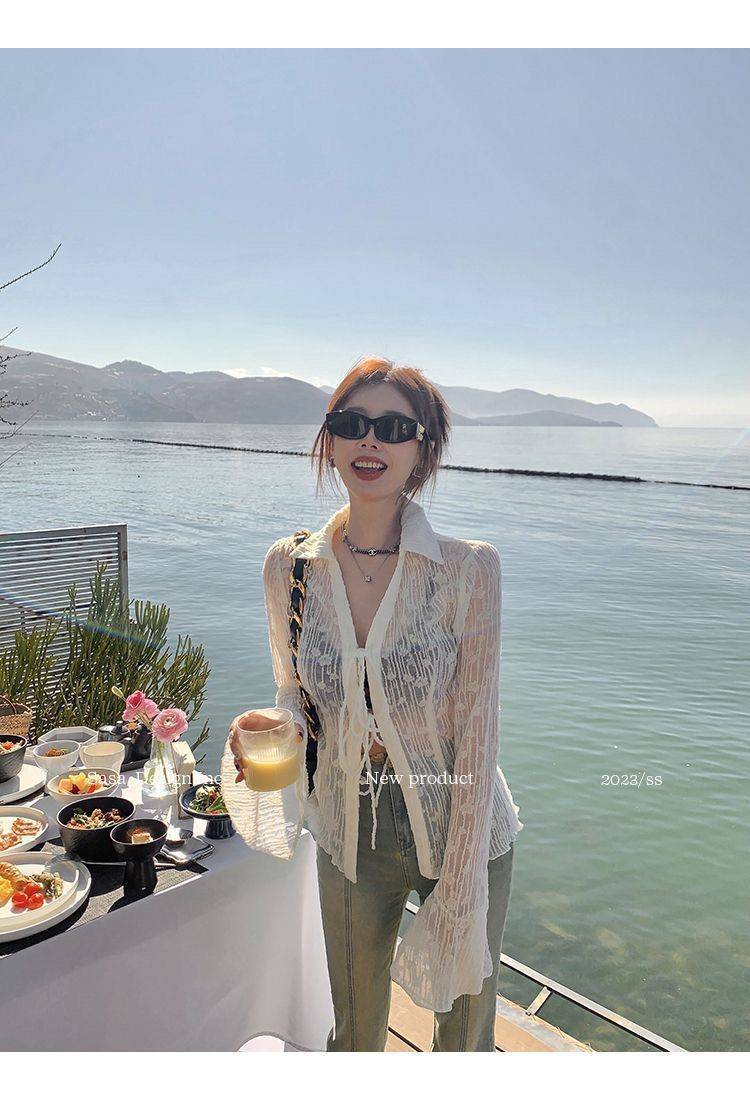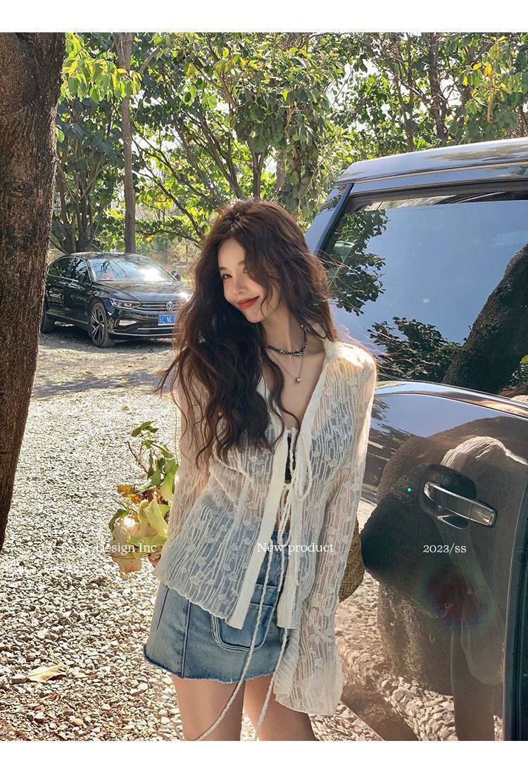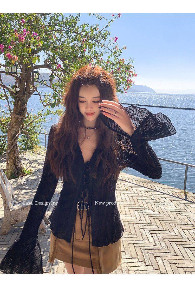 프랑스 스타일 V-Neck 레이스 셔츠 여성의 봄과 여름 얇은 슬림 우아한 순수한 욕망 스타일 성격 뜨거운 소녀 시폰 카디건 탑
