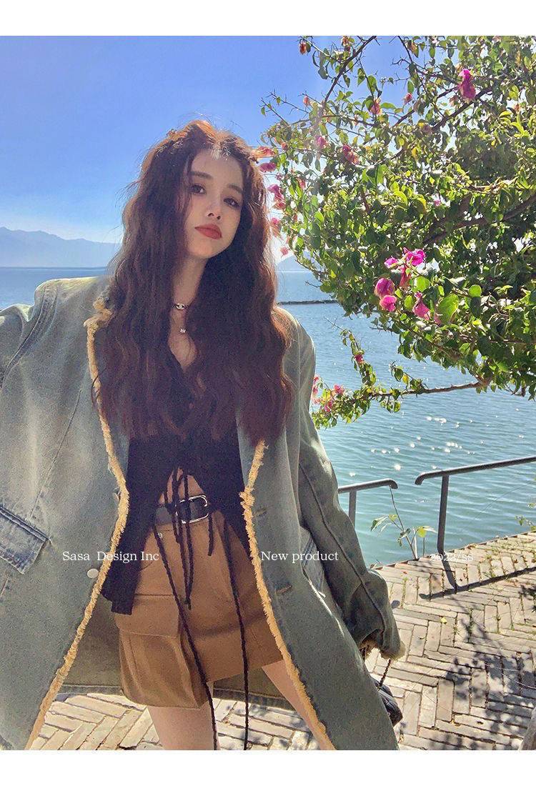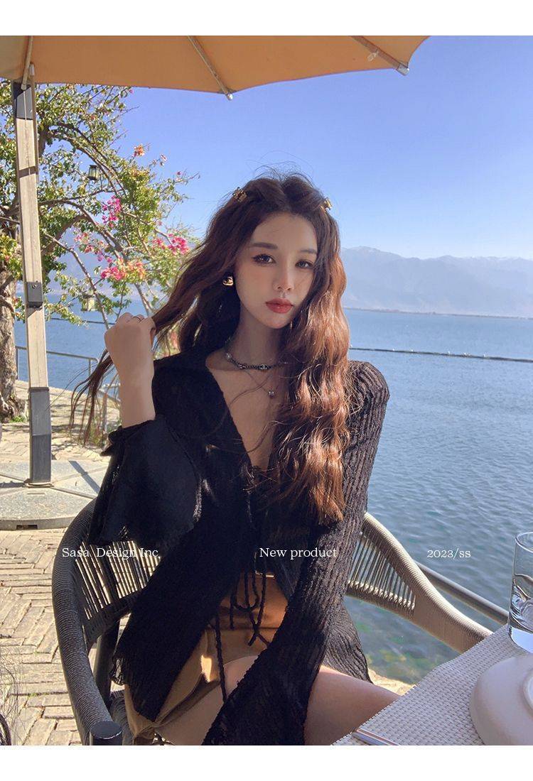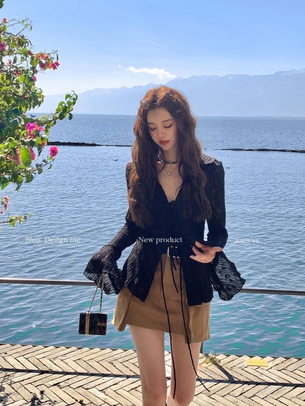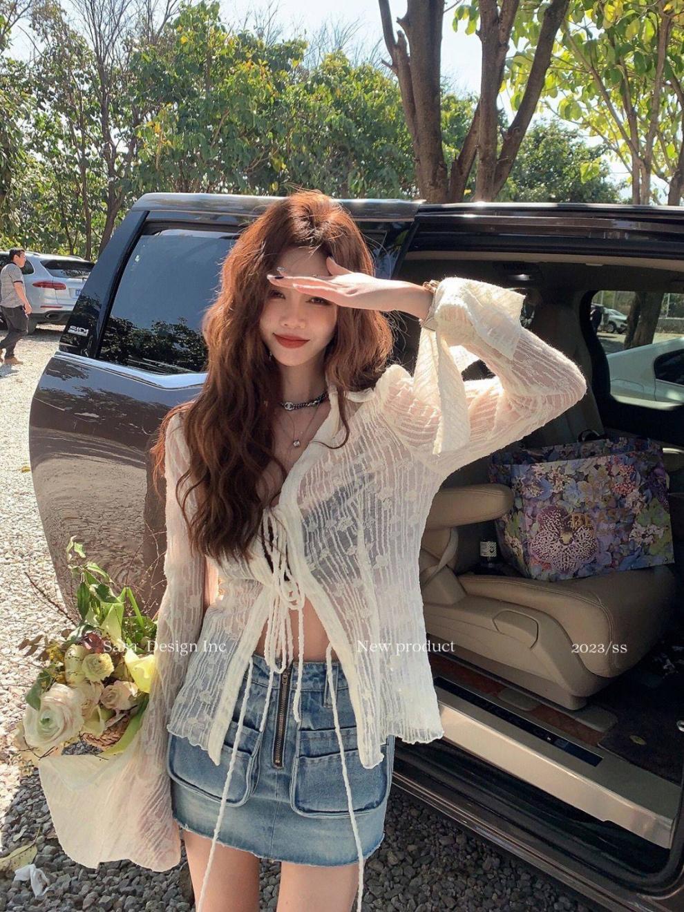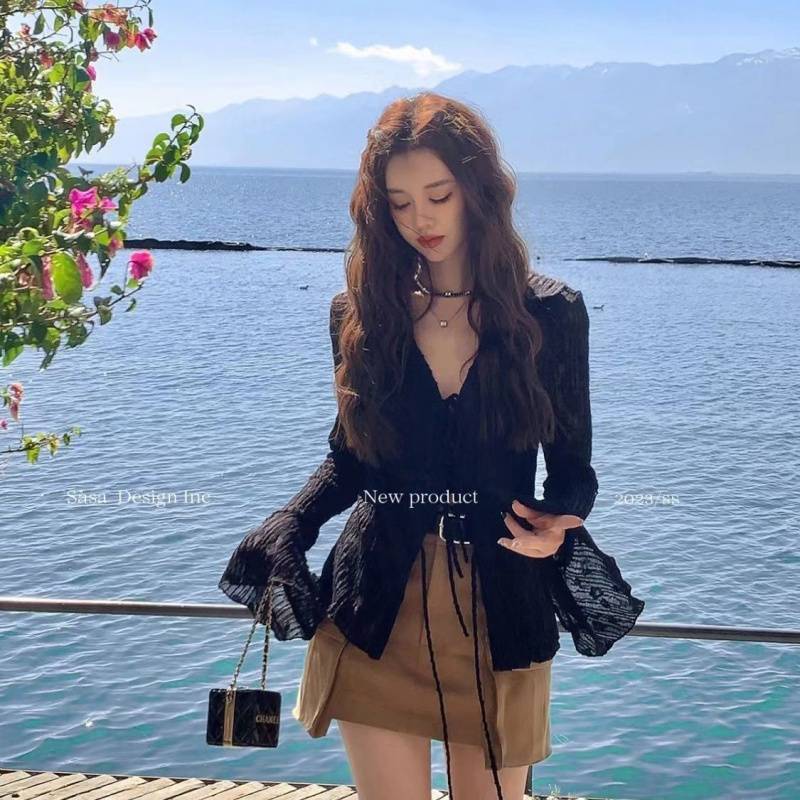 프랑스 스타일 V-Neck 레이스 셔츠 여성의 봄과 여름 얇은 슬림 우아한 순수한 욕망 스타일 성격 뜨거운 소녀 시폰 카디건 탑