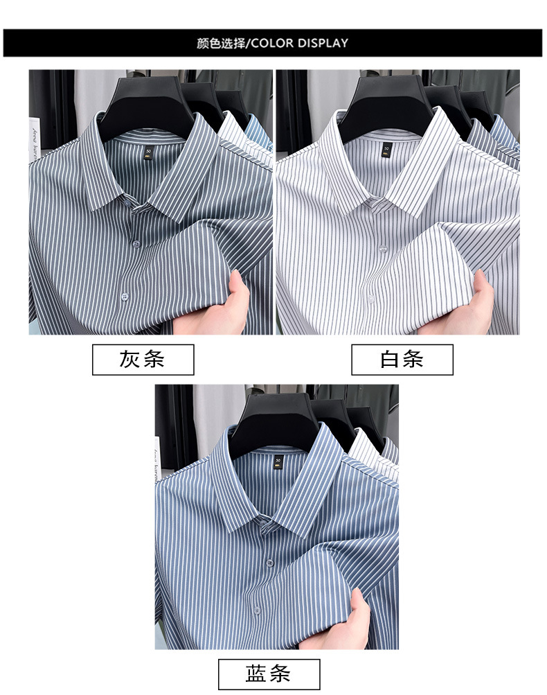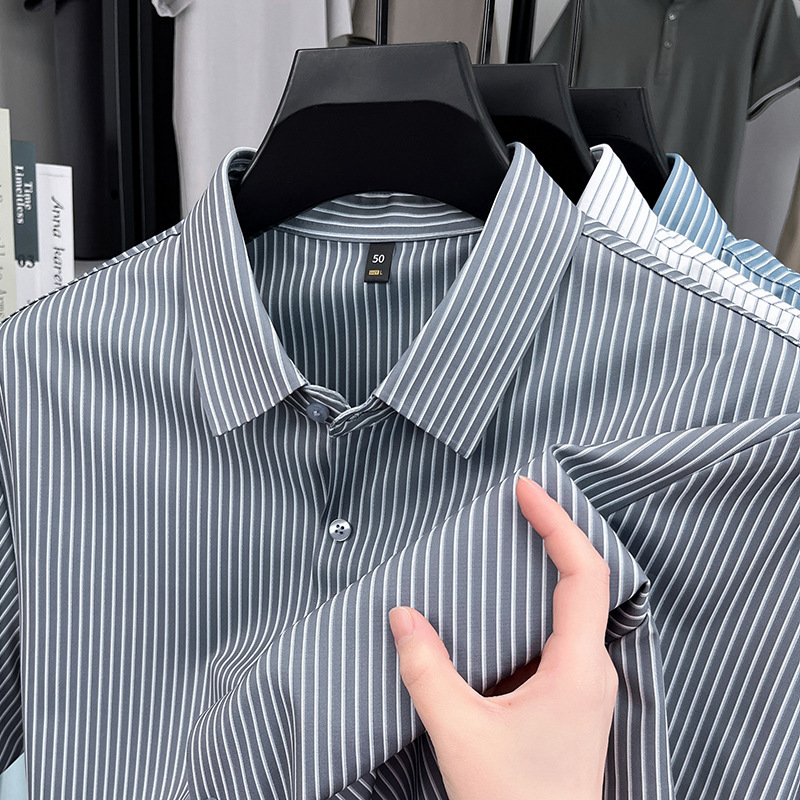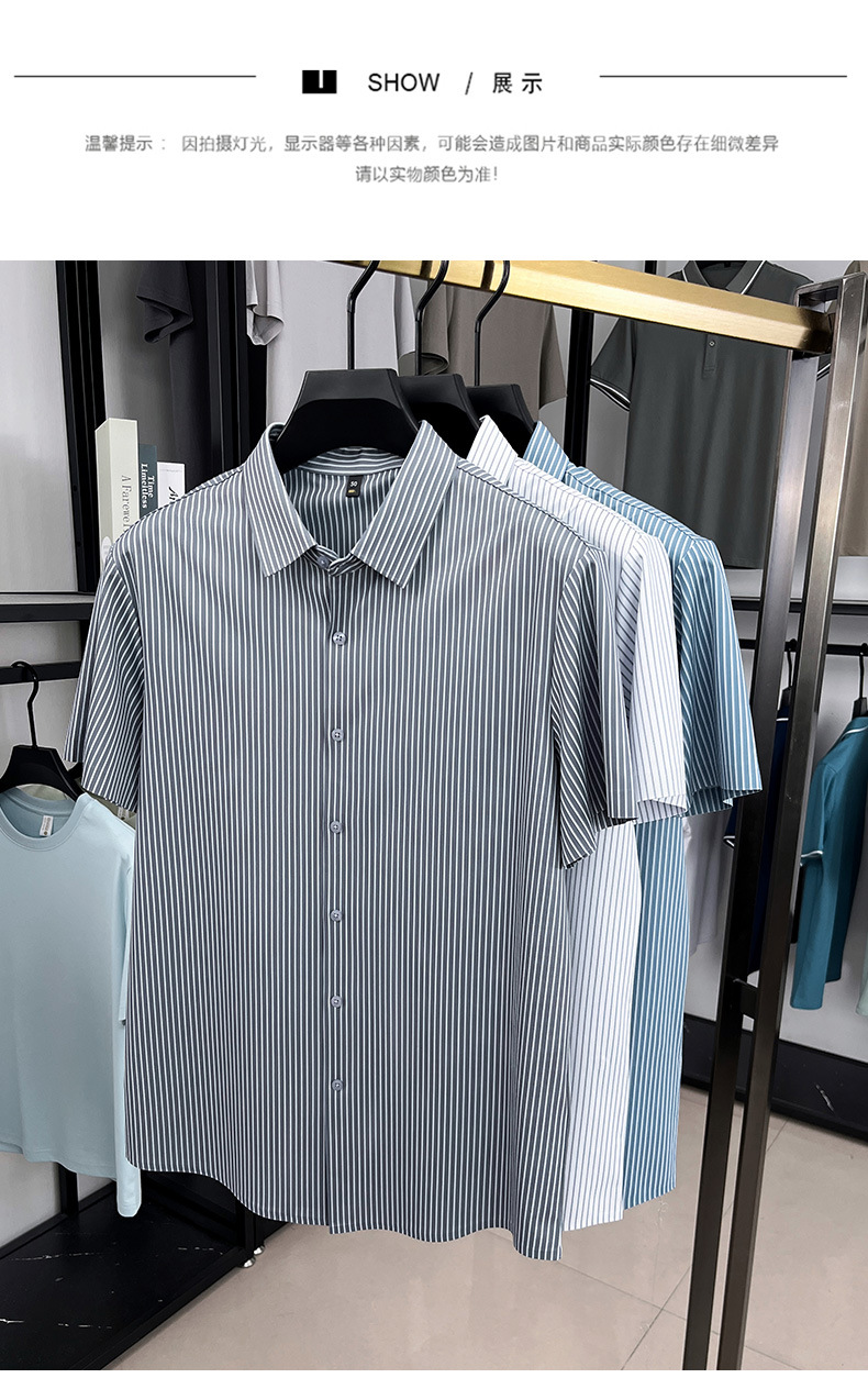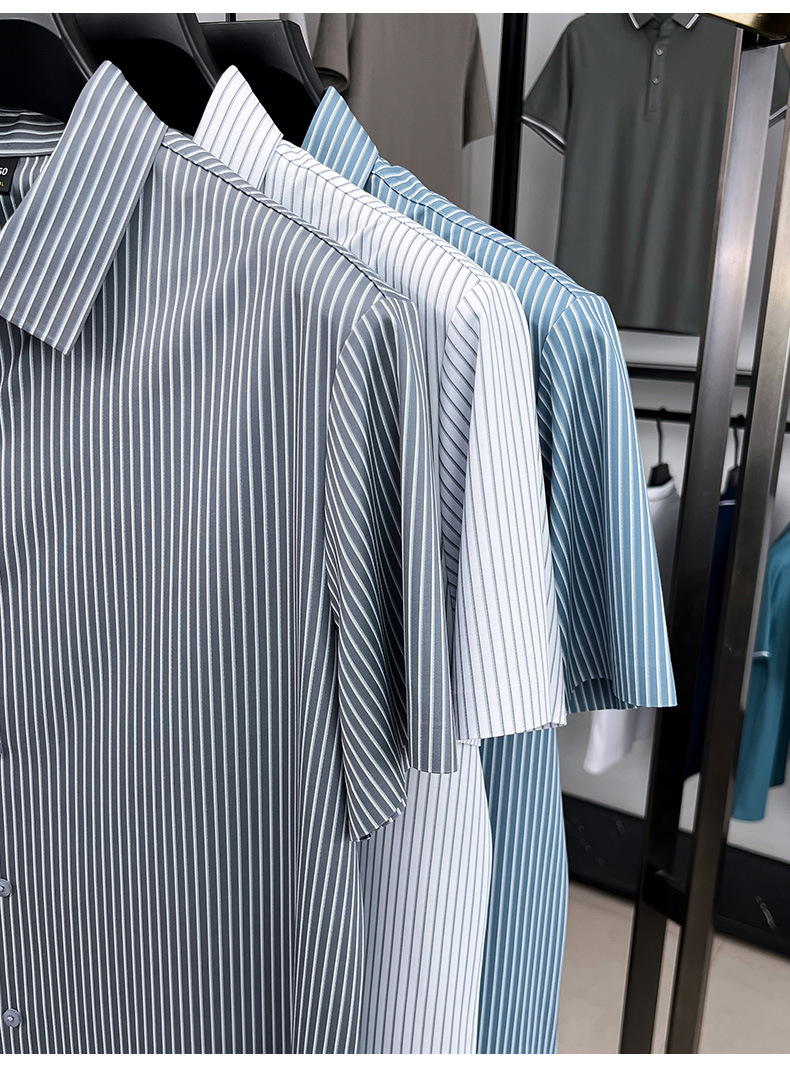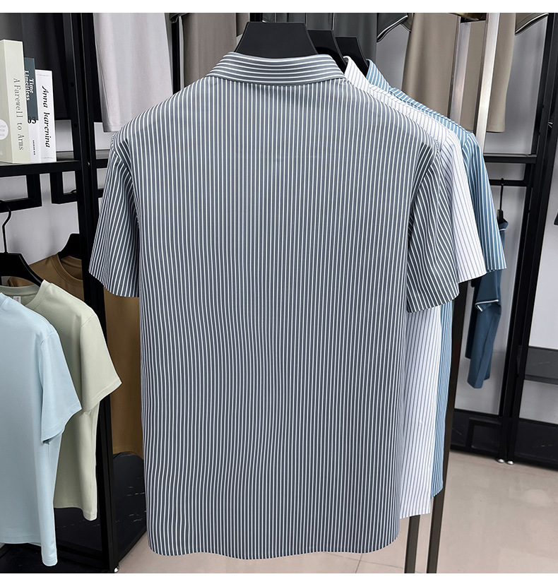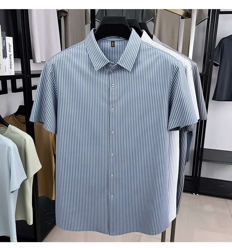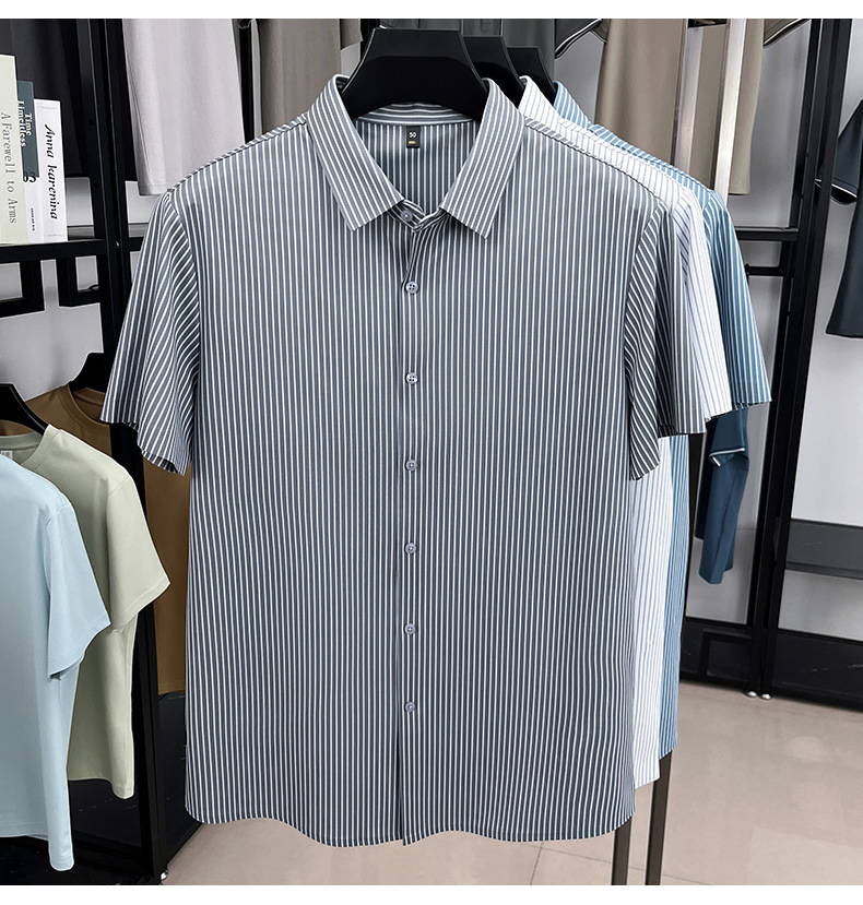 중년 라이트 컬러 스트라이프 반소매 여름 아빠의 추적없는 줄무늬 셔츠 2025 반소매 셔츠 남성용 셔츠 아이스 실크스토어 가기