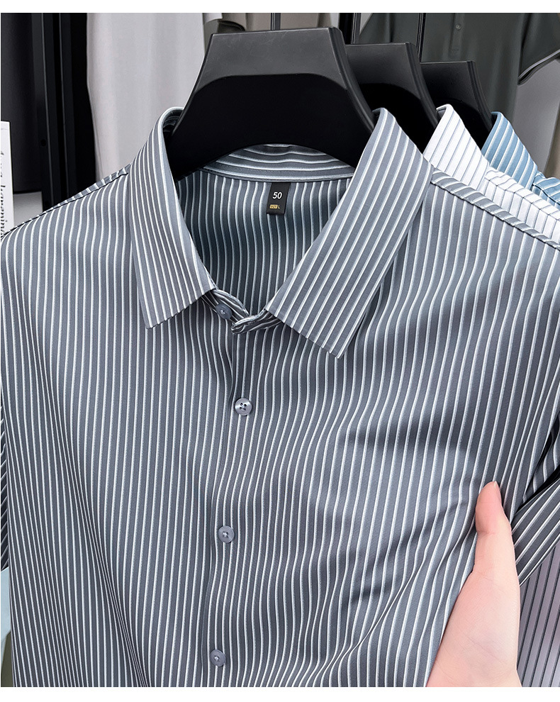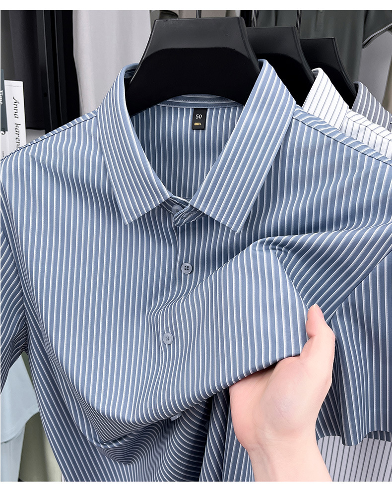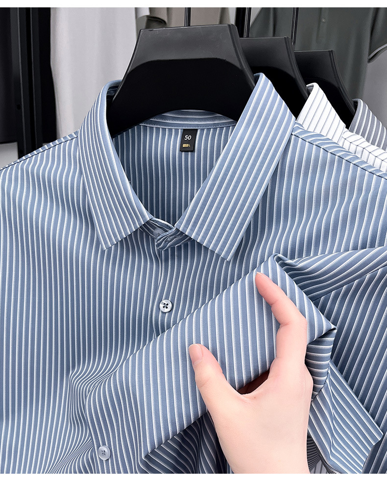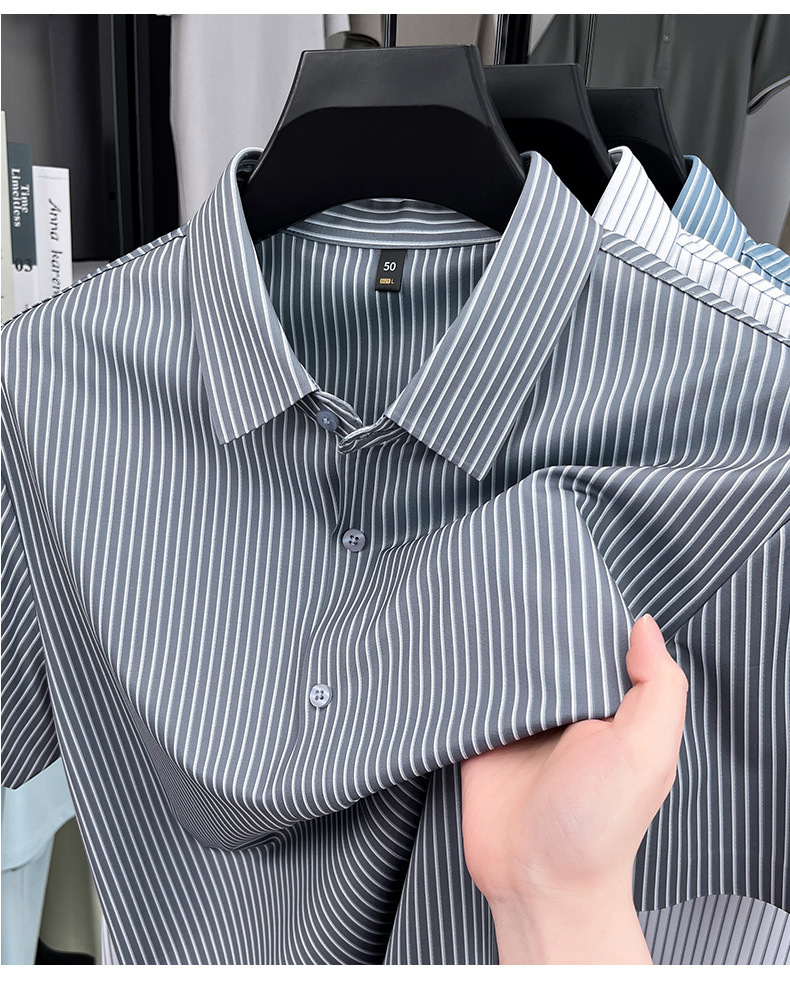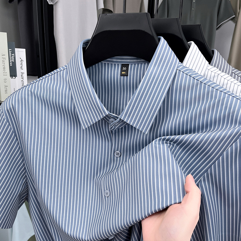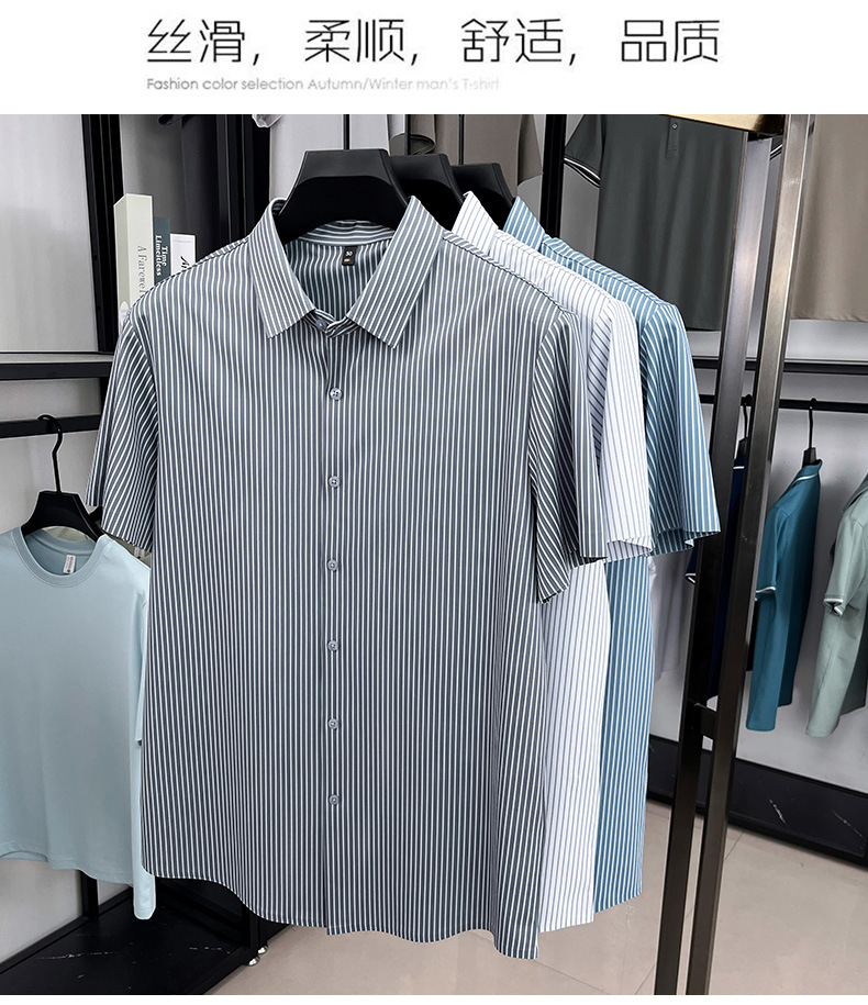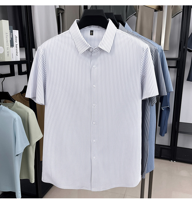 중년 라이트 컬러 스트라이프 반소매 여름 아빠의 추적없는 줄무늬 셔츠 2025 반소매 셔츠 남성용 셔츠 아이스 실크