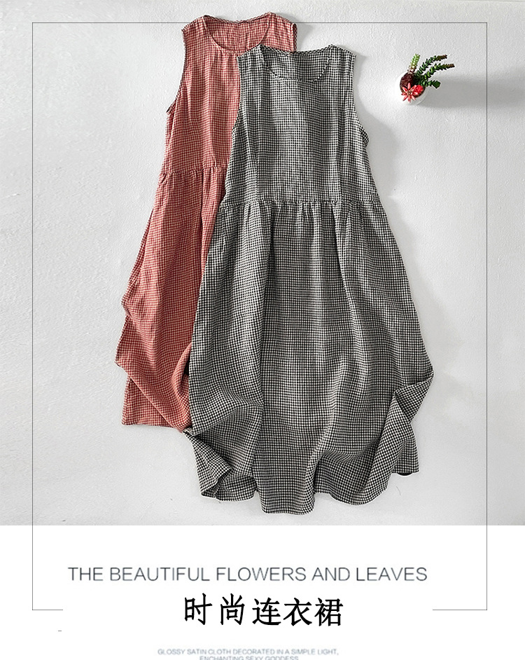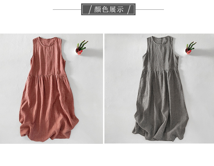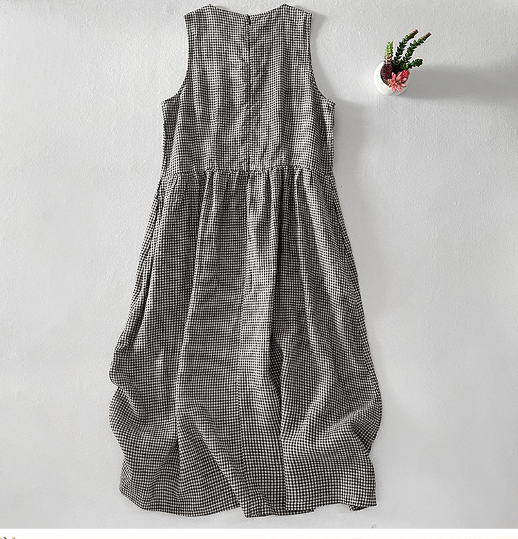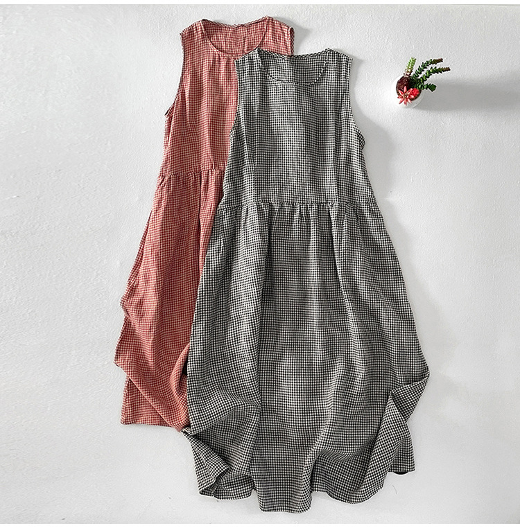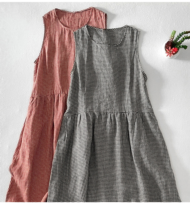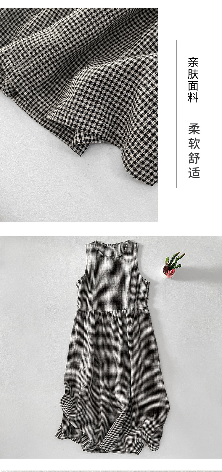 Real Shot 2025 여름 신작 코튼 린넨 대형 격자 무늬 민소매 탱크 탑 루즈 캐주얼 드레스스토어 가기