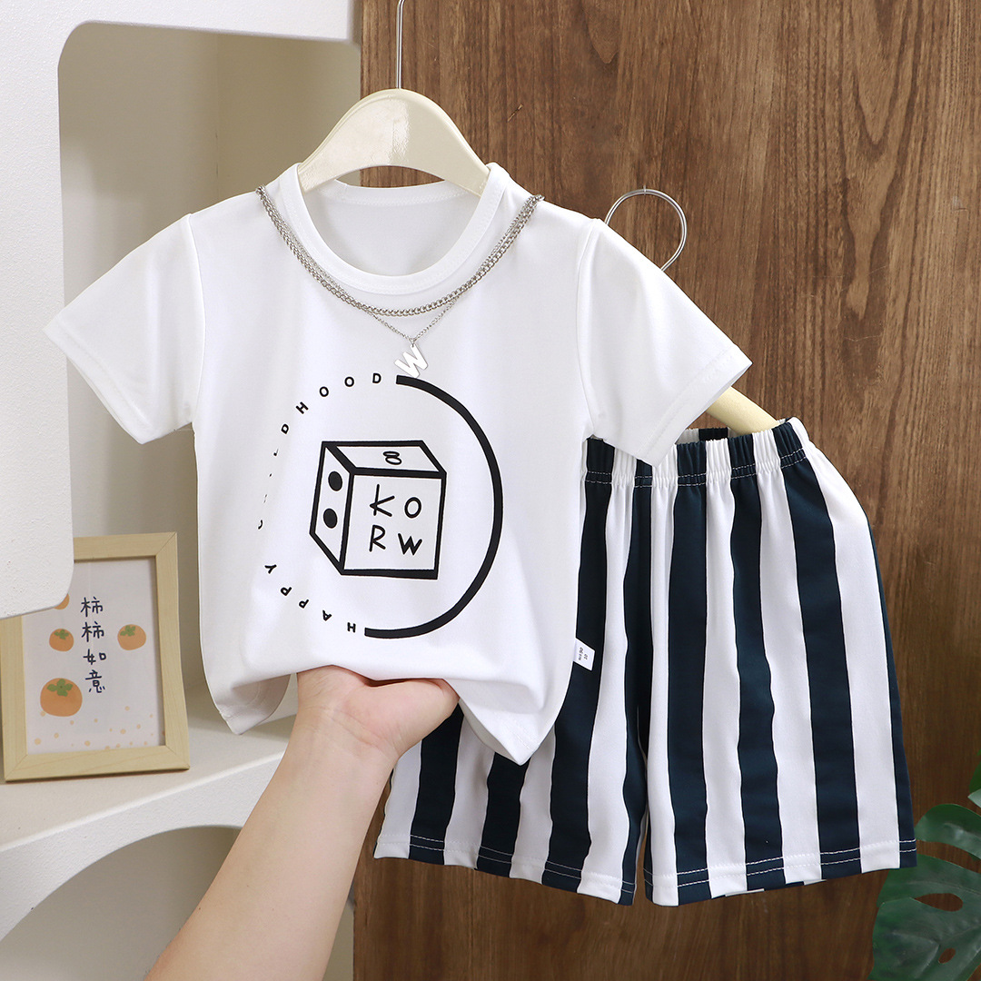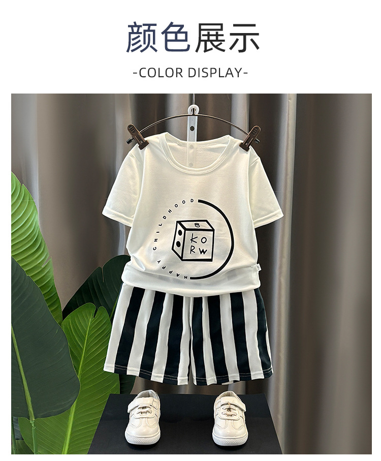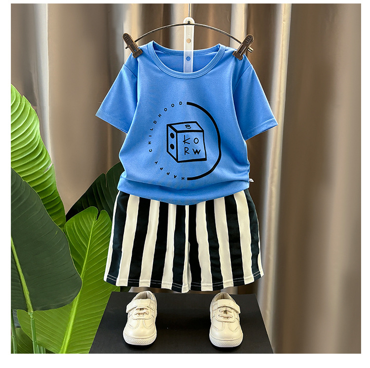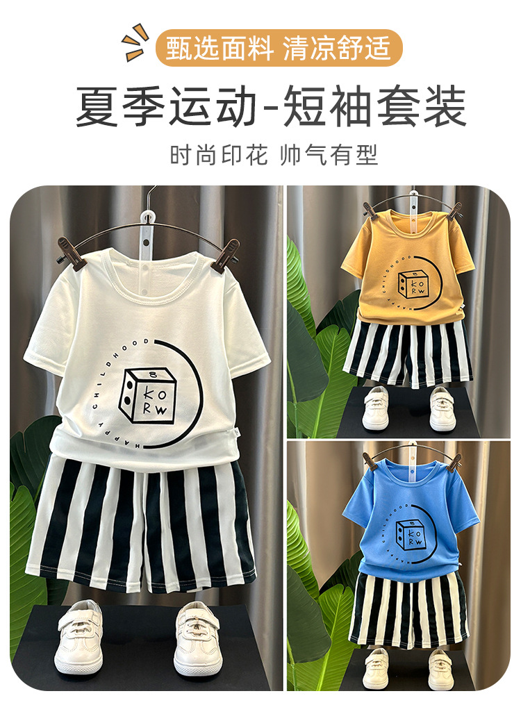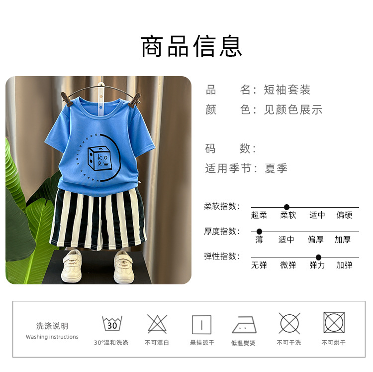 2025 새로운 여름 어린이 반팔 세트 캐주얼 소년 소녀 라운드 넥 만화 티셔츠 소년 반바지 투피스 세트스토어 가기