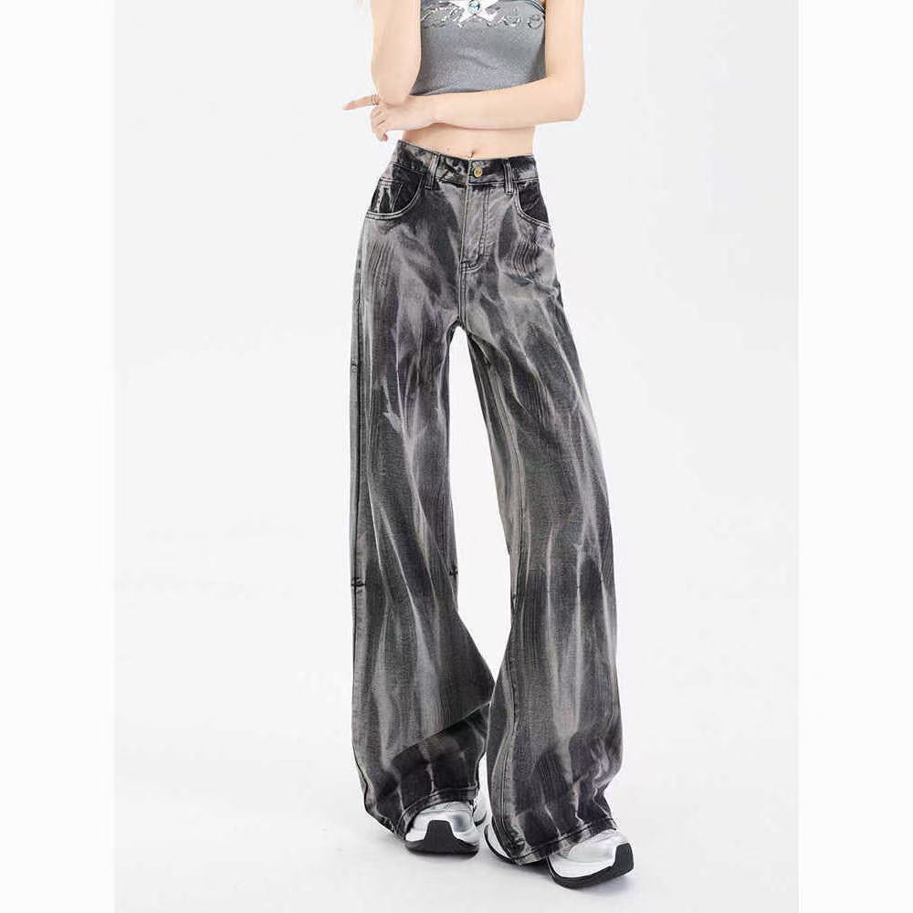 여름 골판지 타이-염료 높은 허리 넓은 다리 청바지 여성의 2025 작은 그라디언트 얇은 청바지 디자인 감각스토어 가기