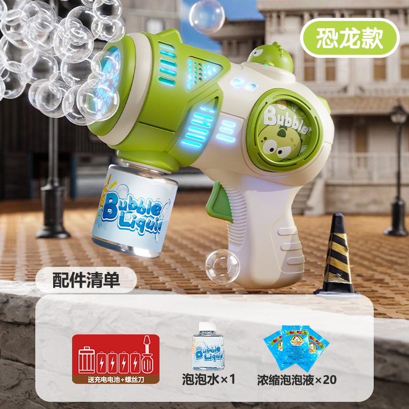 • 공룡 버블건 [충전식 버전]에는 버블수 1병 + 농축액 20팩이 포함되어 있습니다.