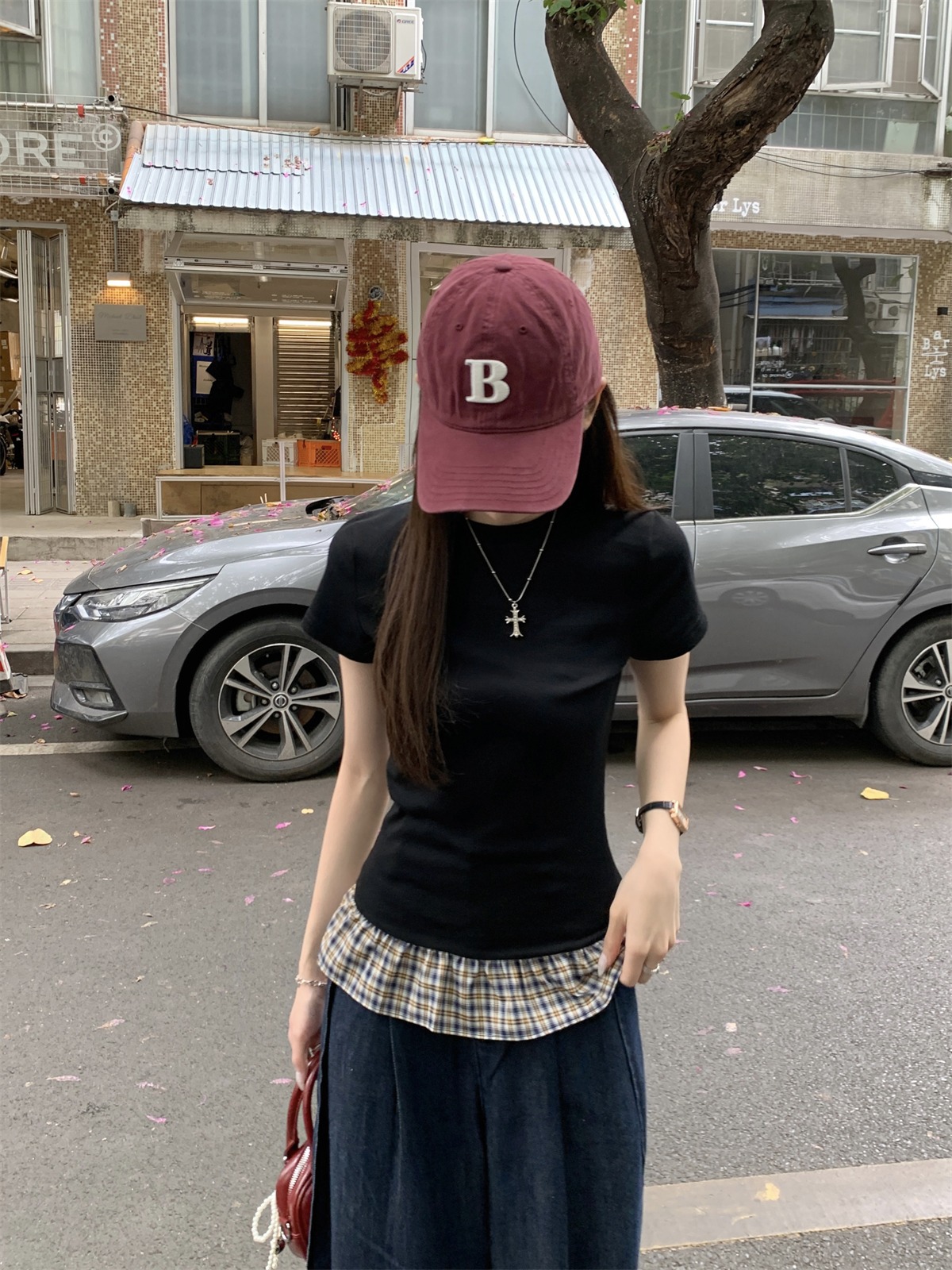국경 간 패션 빈티지 콘트라스트 격자 무늬 스티칭 어깨 반팔 티셔츠 여성용 여름 슬림 핏 세련된 바토밍 최고 여성 T-조수