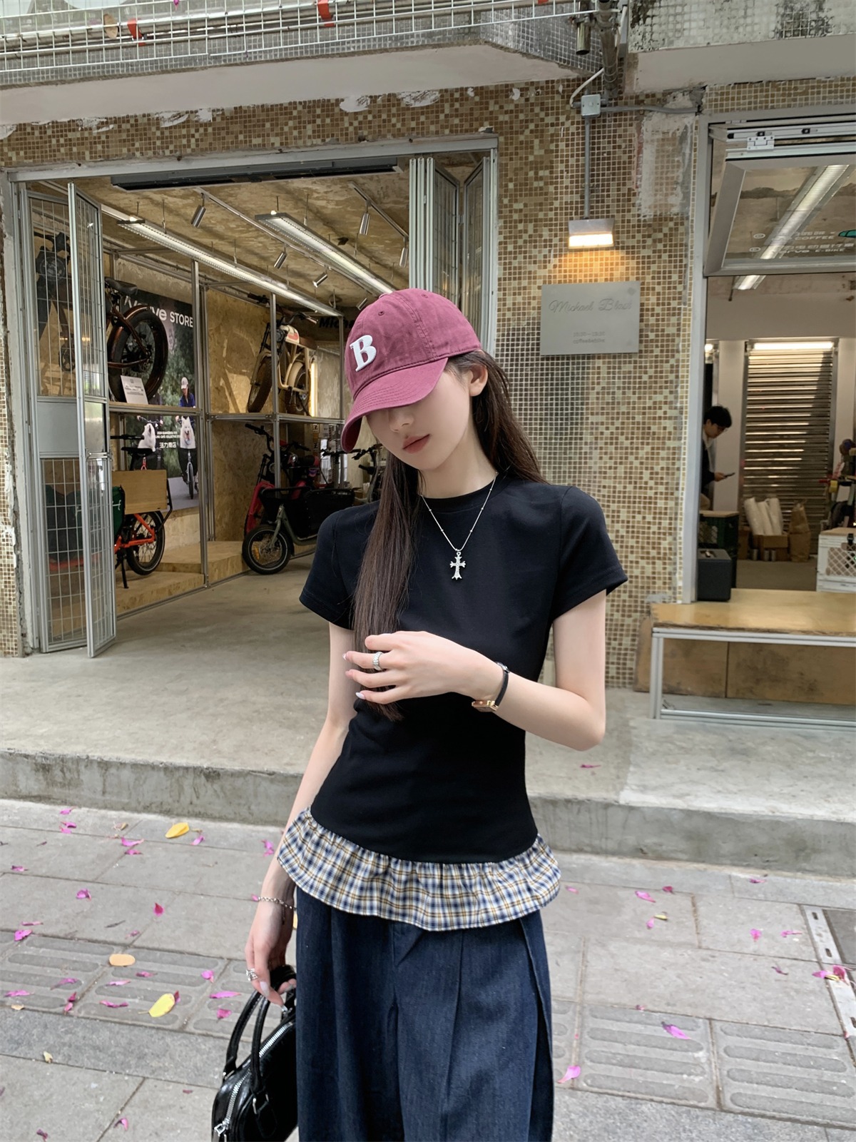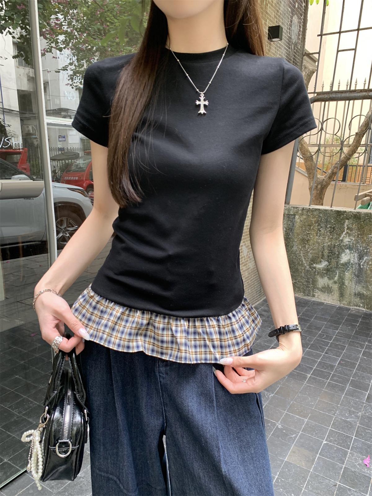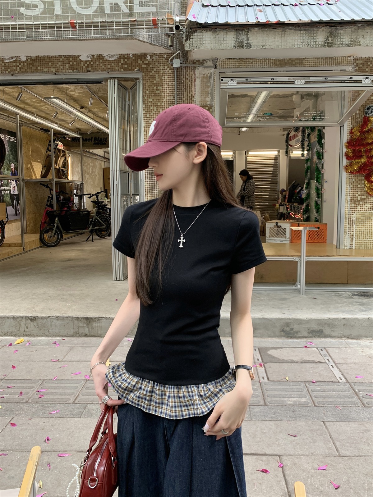 국경 간 패션 빈티지 콘트라스트 격자 무늬 스티칭 어깨 반팔 티셔츠 여성용 여름 슬림 핏 세련된 바토밍 최고 여성 T-조수스토어 가기