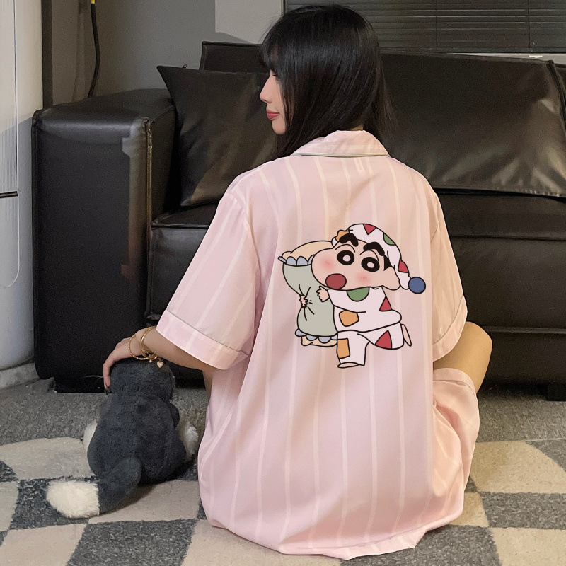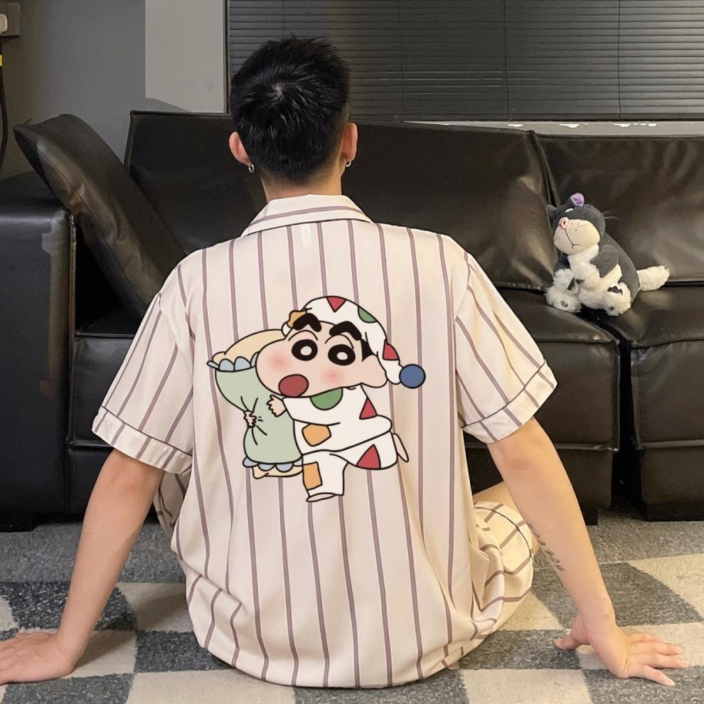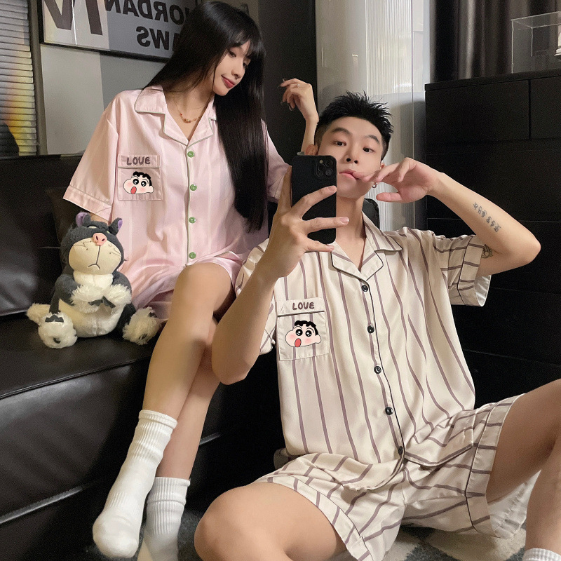 커플 잠옷 여성 여름 줄무늬 귀여운 만화 크레용 신짱 얼음 실크 남성 여름 홈웨어 세트스토어 가기