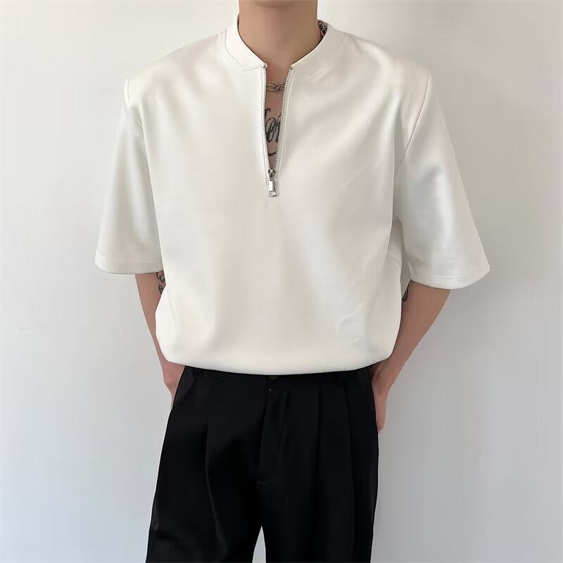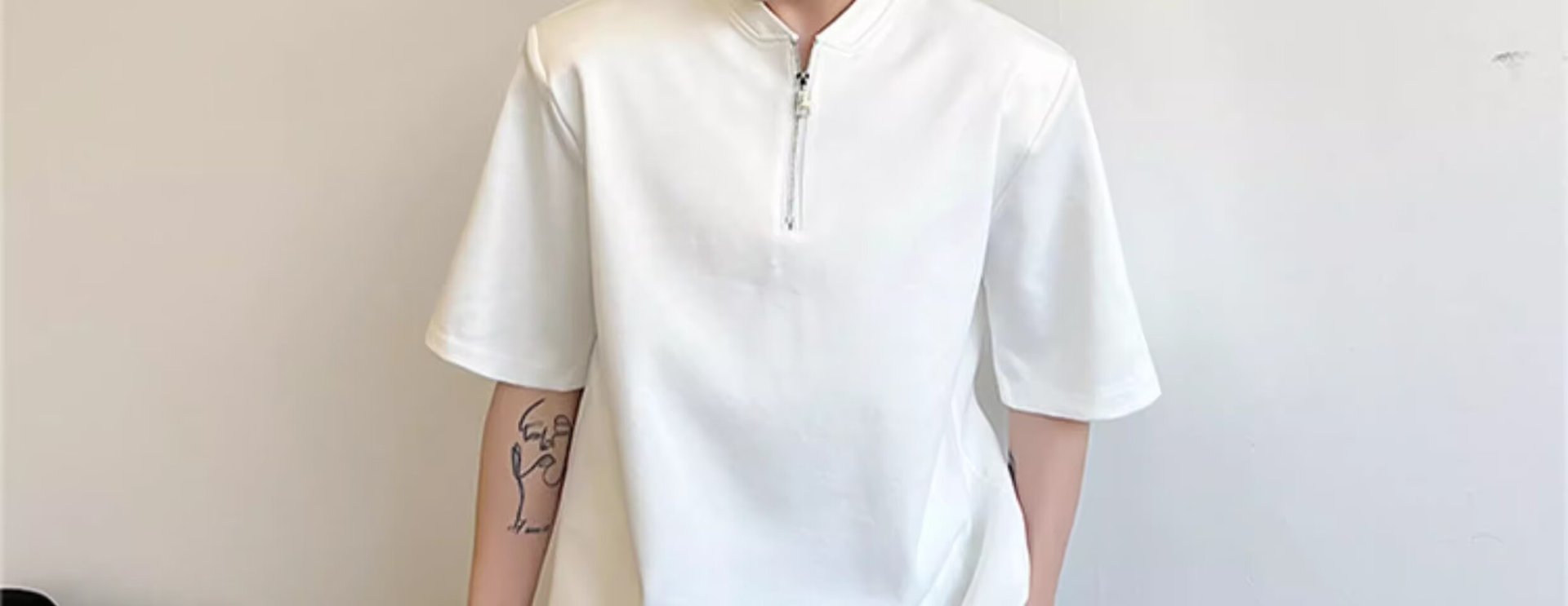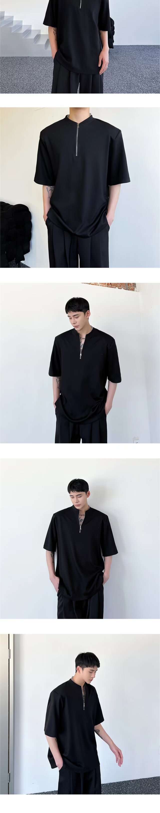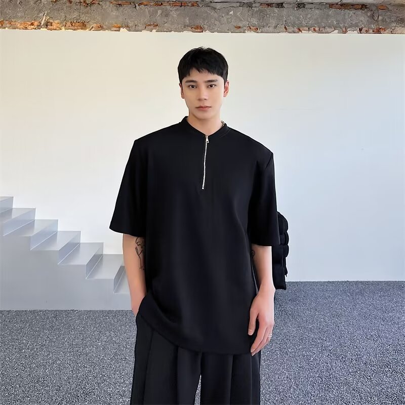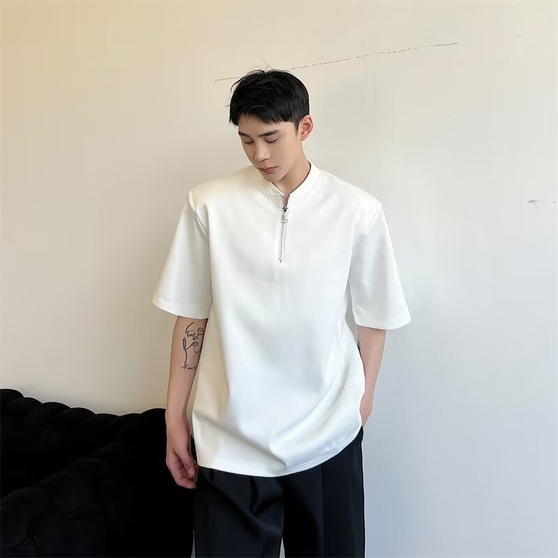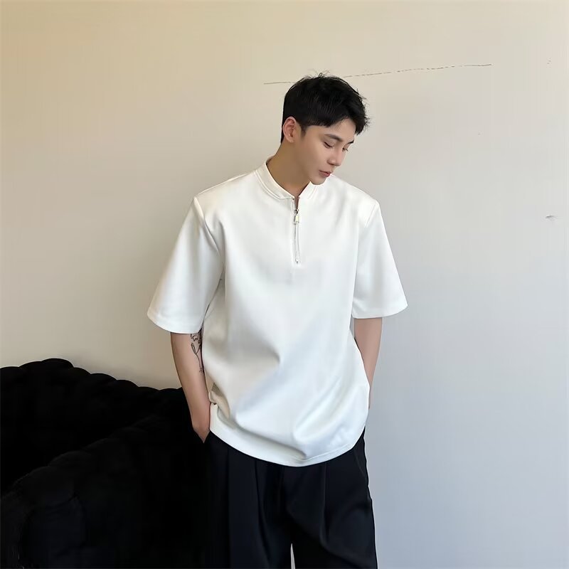 가벼운 성숙한 스타일 남성용 어깨 패드 티셔츠 남성용 헤어 스타일리스트 트렌디 브랜드 헤비 웨이트 반팔 내부 작은 목 반소매 베이스 셔츠