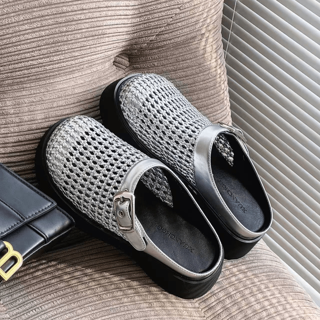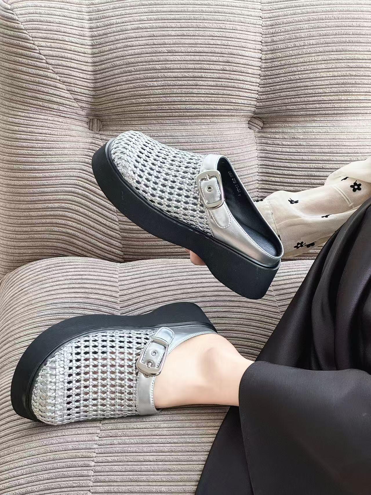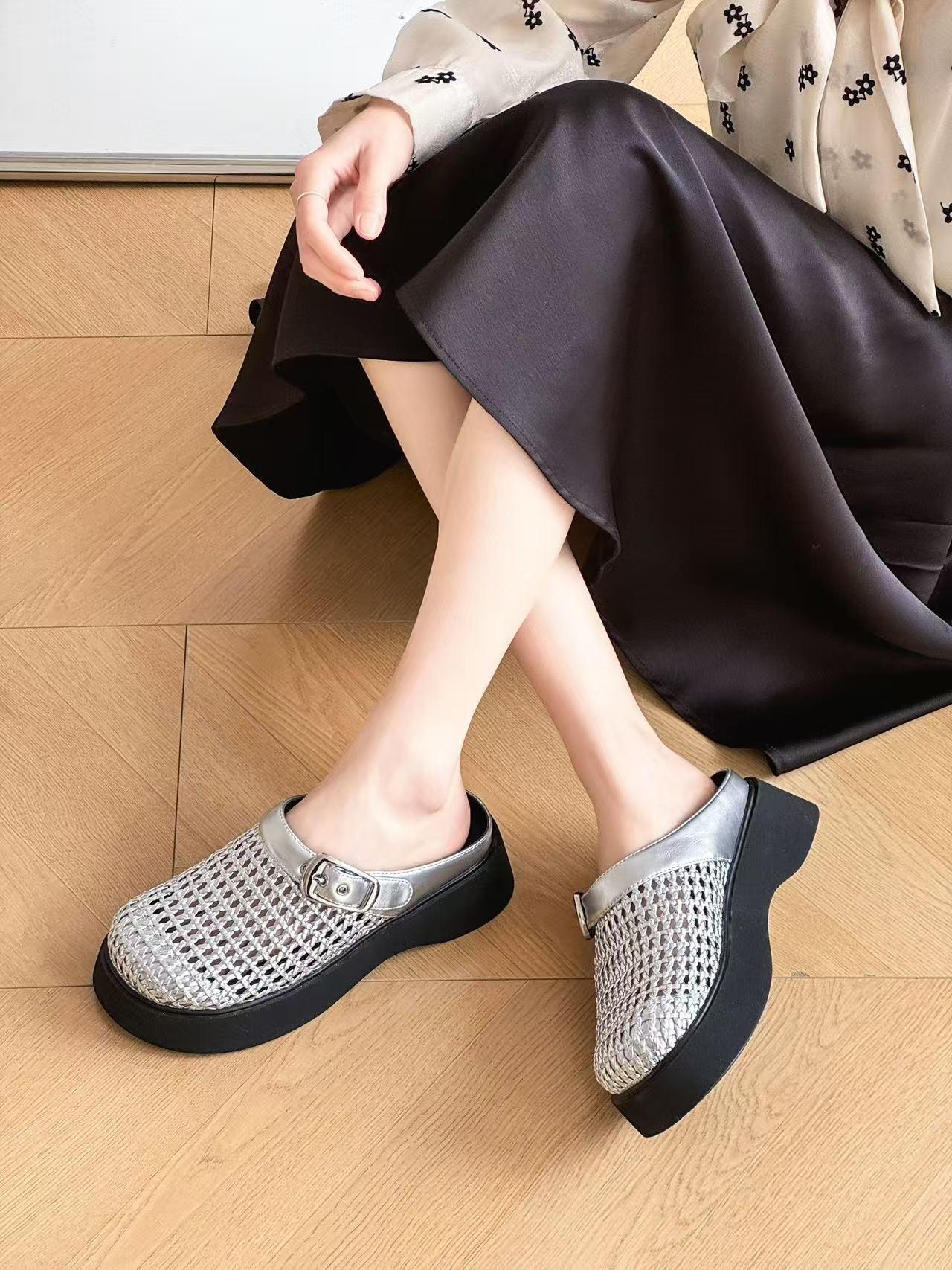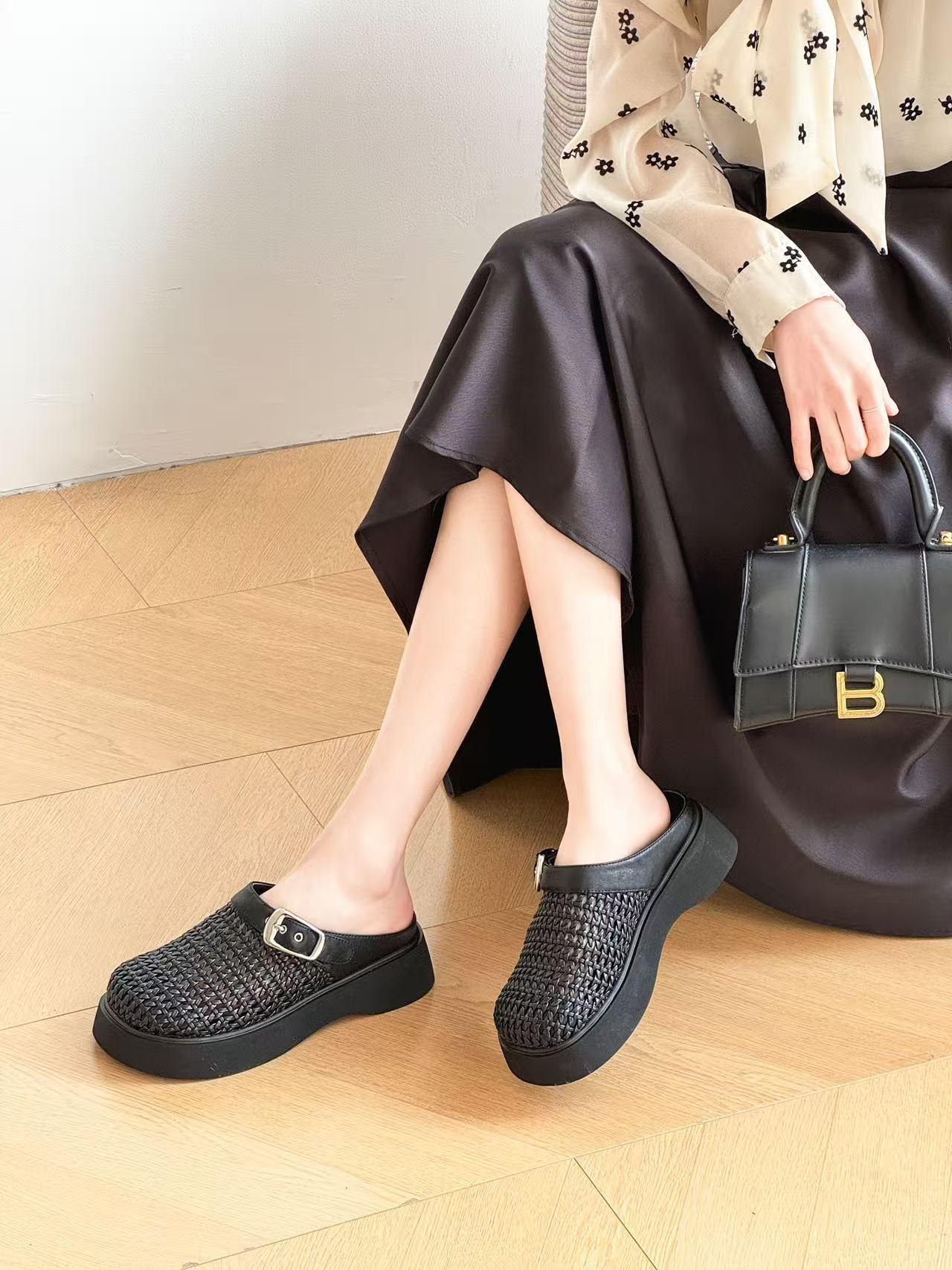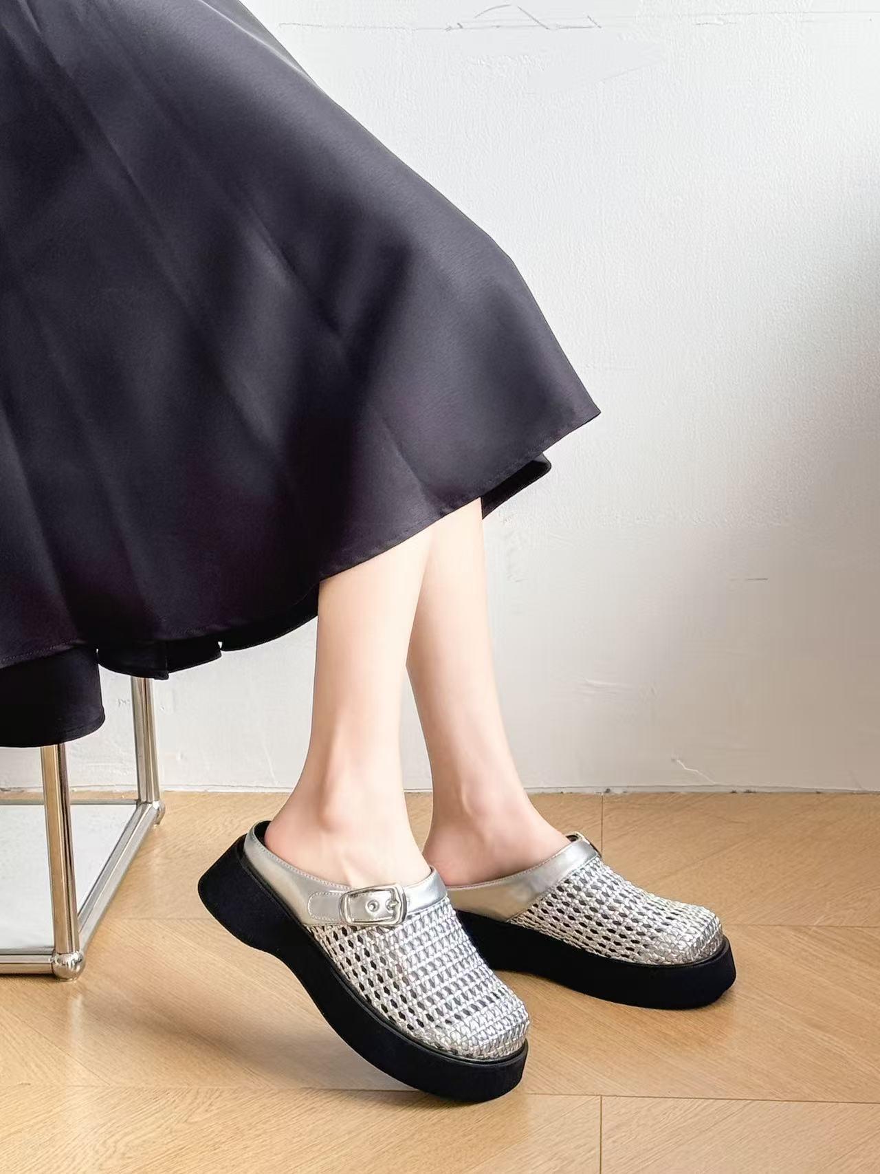 2025 년 여름 새로운 빈티지 짠 바오터우 슬리퍼 아우터웨어 정품 가죽 슬립온 두꺼운 밑바닥 할로우 홀 샌들스토어 가기