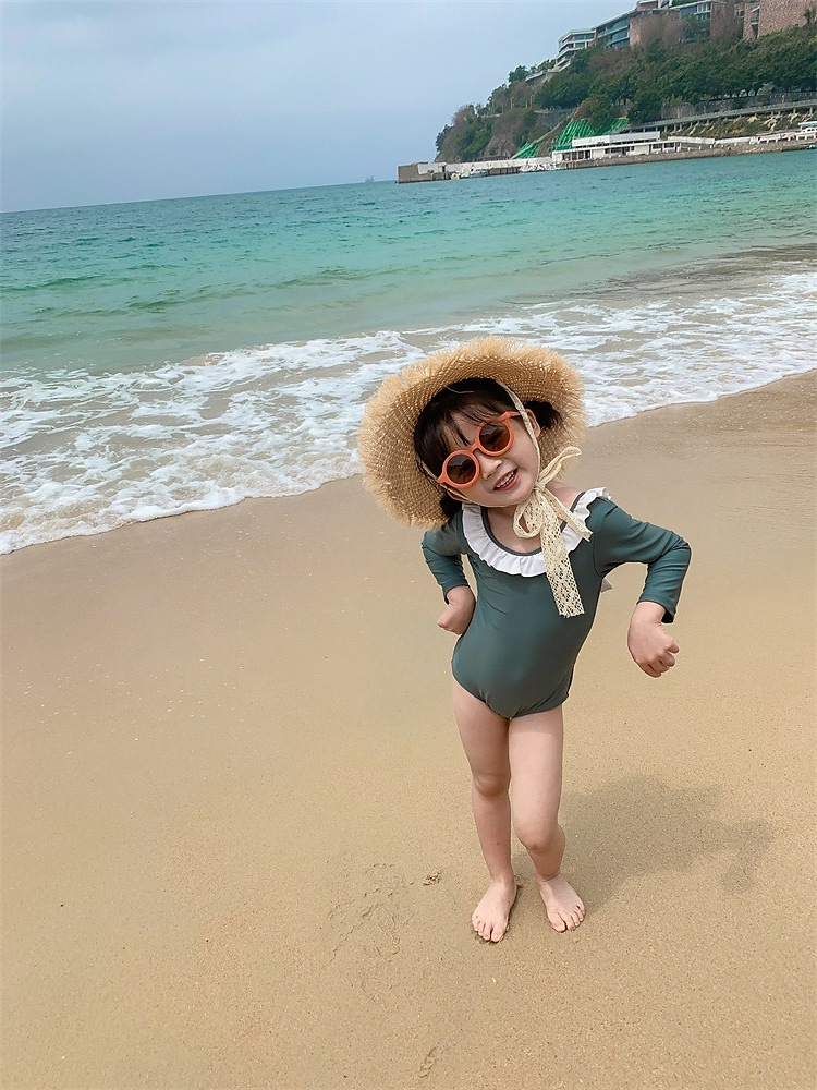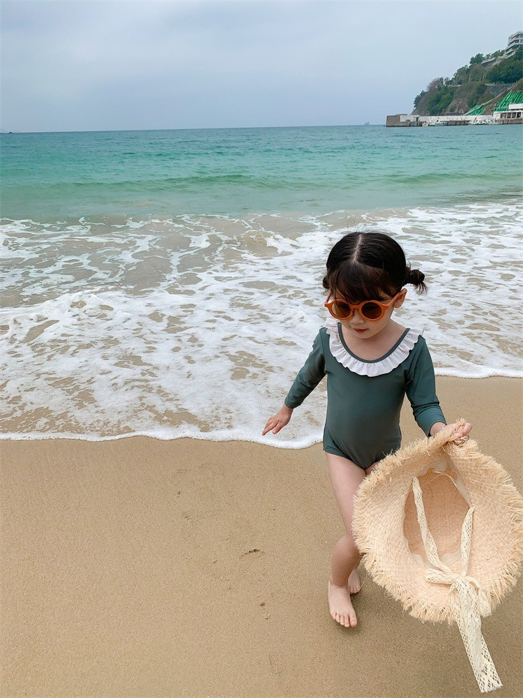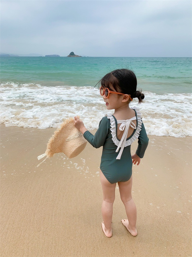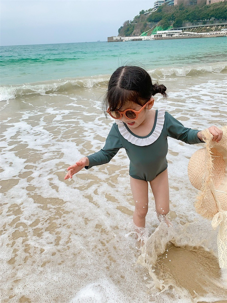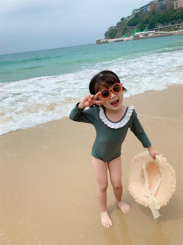 여자 선스크린 수영복 세련된 명암 인형 칼라 아기 소녀의 긴 소매 허리 바캉스 수영복스토어 가기