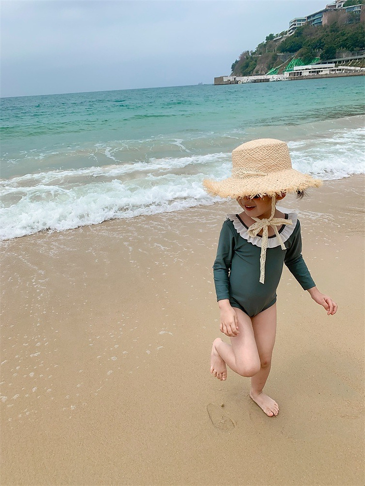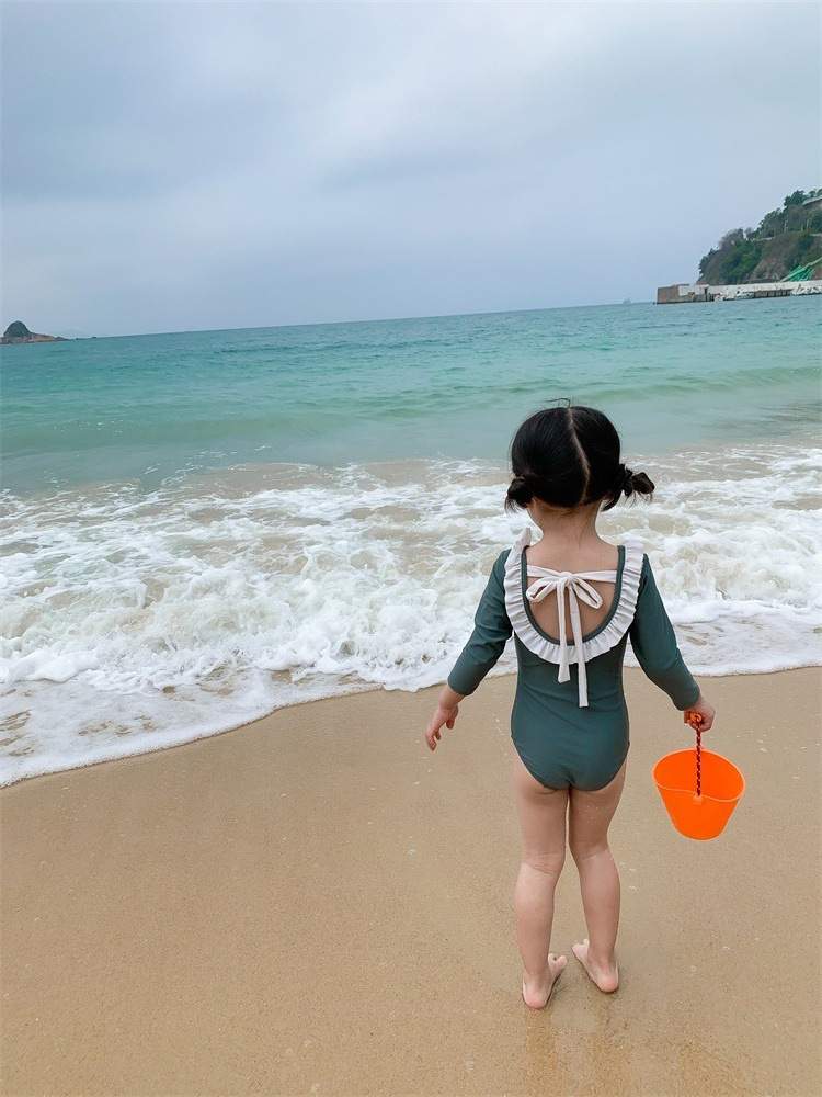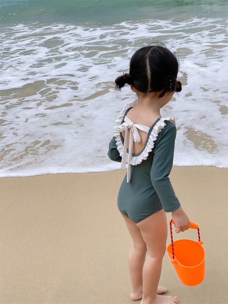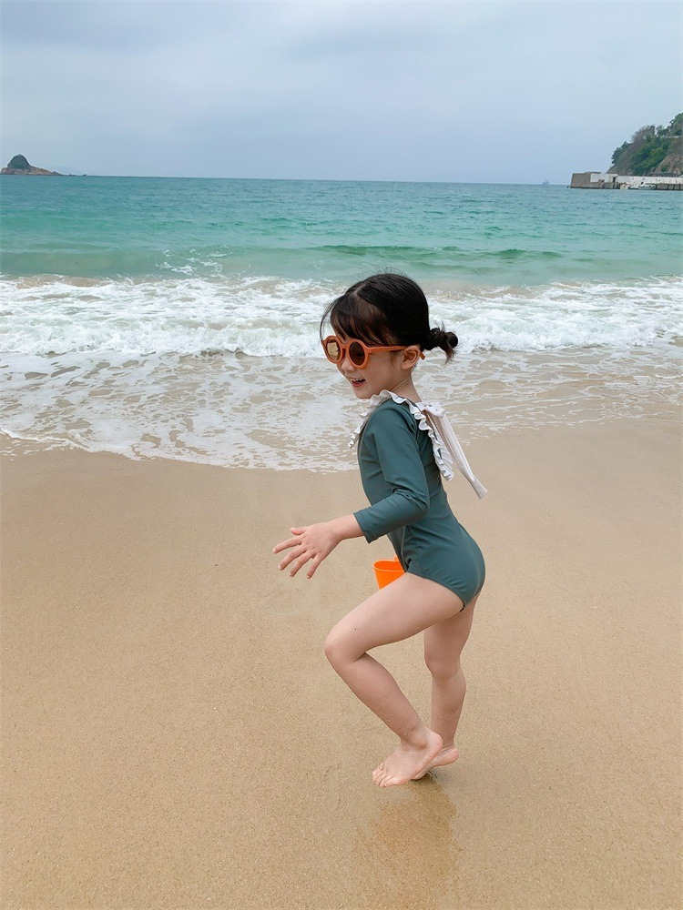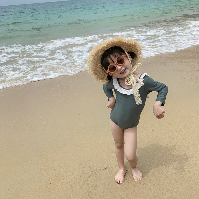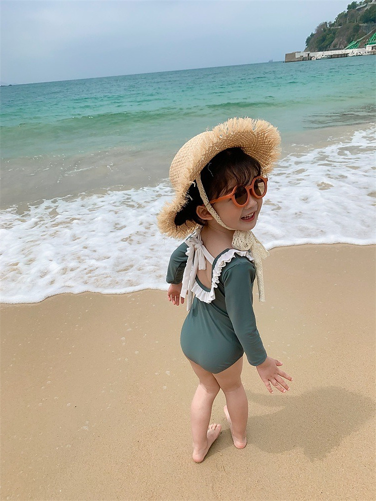 여자 선스크린 수영복 세련된 명암 인형 칼라 아기 소녀의 긴 소매 허리 바캉스 수영복스토어 가기