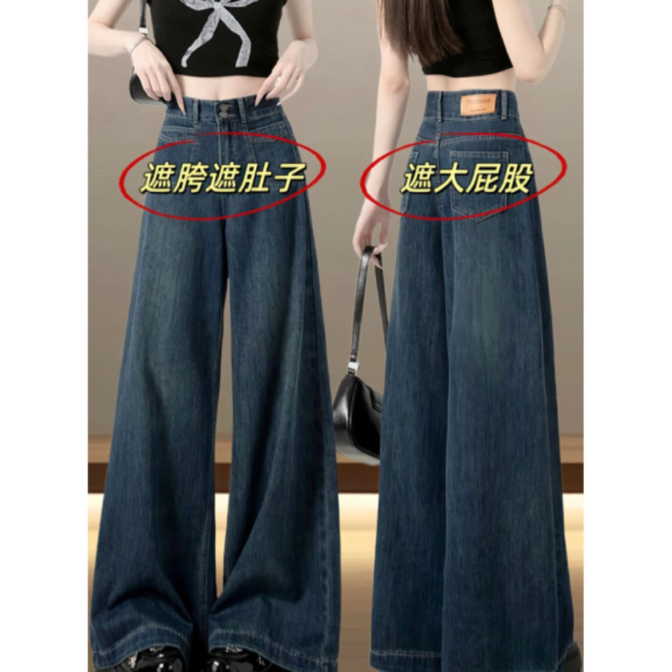 라이트 블루 높은 허리 넓은 다리 청바지 여성의 2025 년 여름 새로운 배 모양의 몸 슬리밍 엉덩이 덮음 드래그 바지