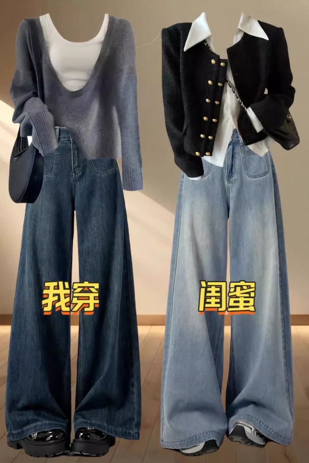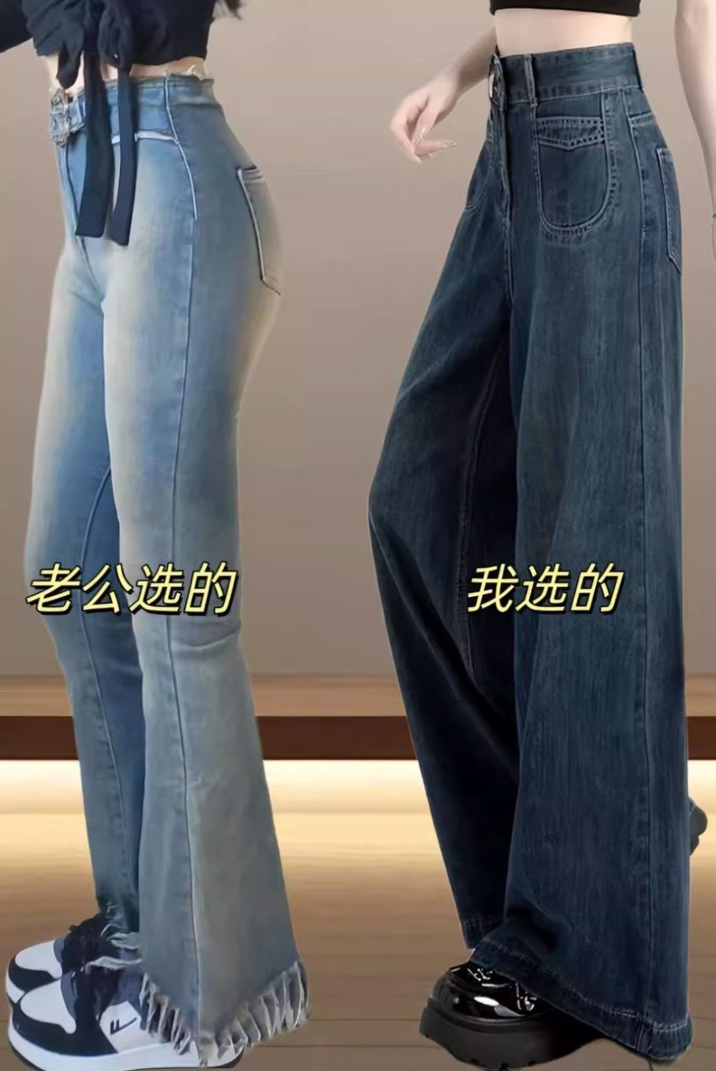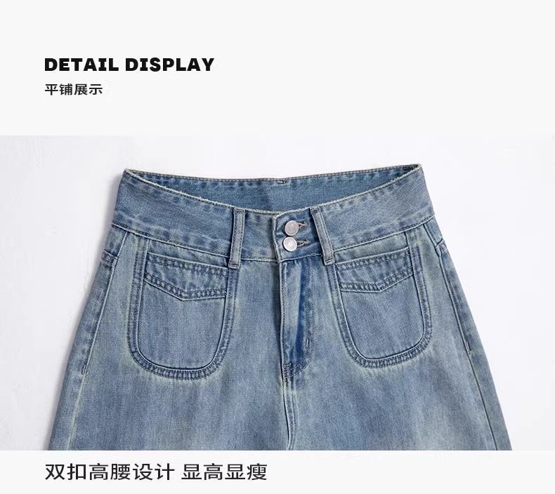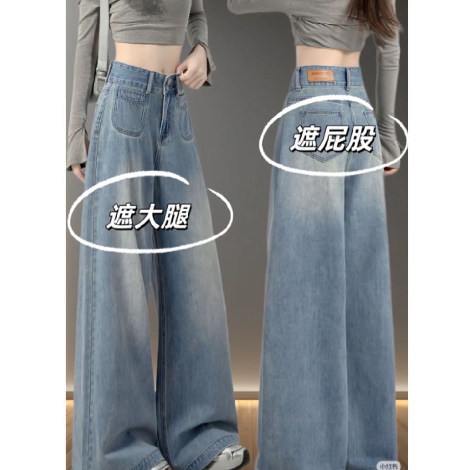 라이트 블루 높은 허리 넓은 다리 청바지 여성의 2025 년 여름 새로운 배 모양의 몸 슬리밍 엉덩이 덮음 드래그 바지스토어 가기