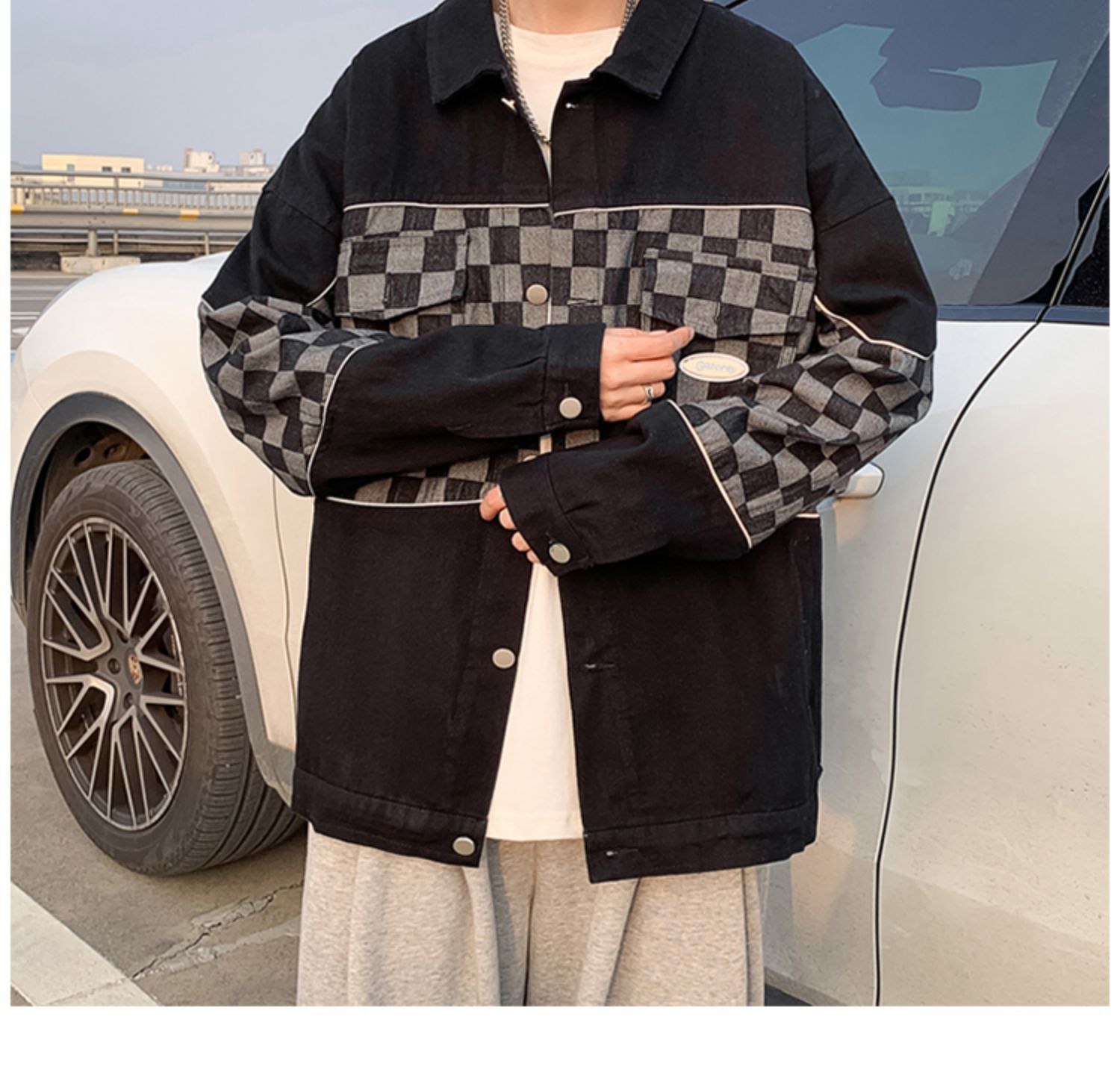 체커보드 스플라이스 데님 재킷 남성 일본 트렌디 브랜드 핸섬 루즈 캐주얼 커플 남성 워크 재킷 탑스토어 가기