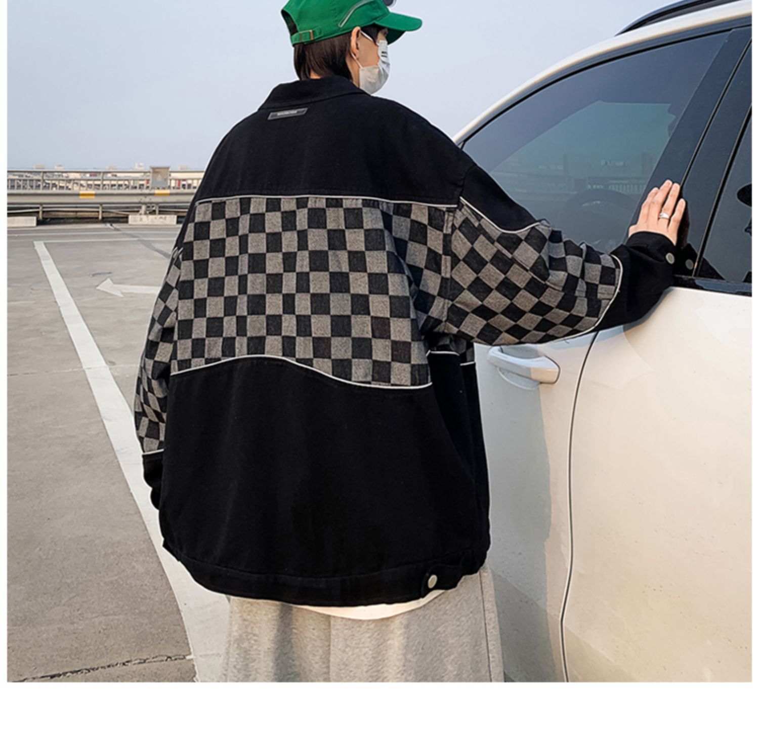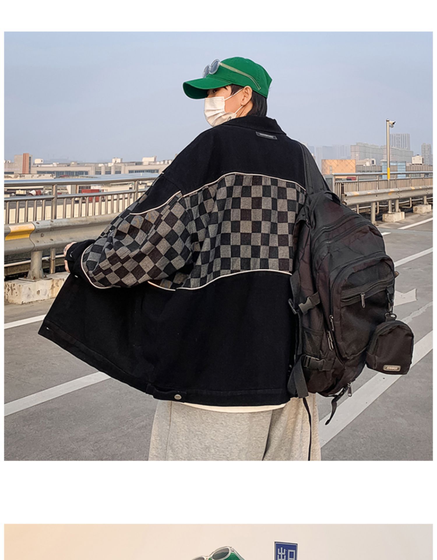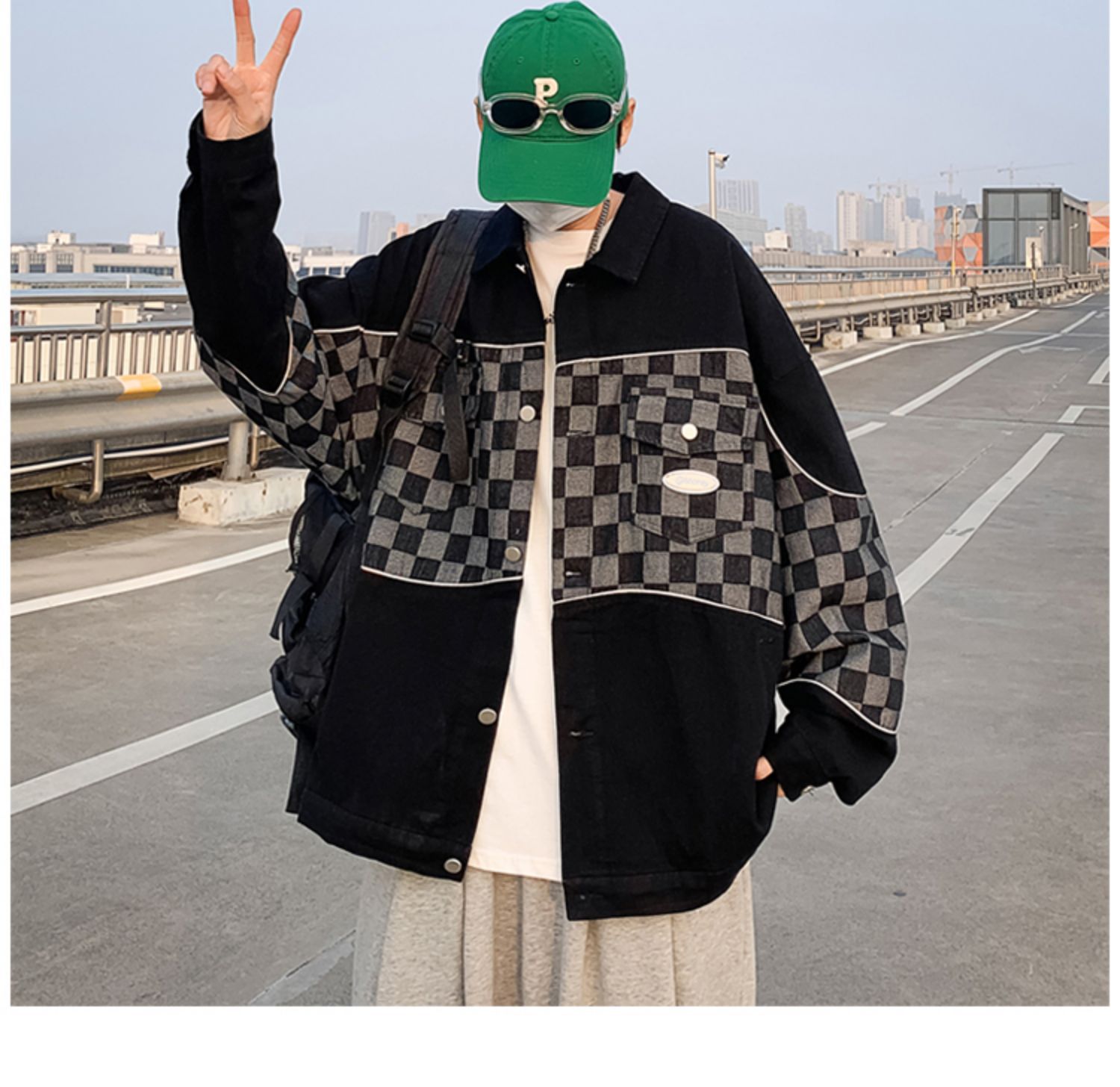 棋盘格拼接牛仔外套男日系潮牌痞帅宽松休闲情侣男装工装夹克上衣