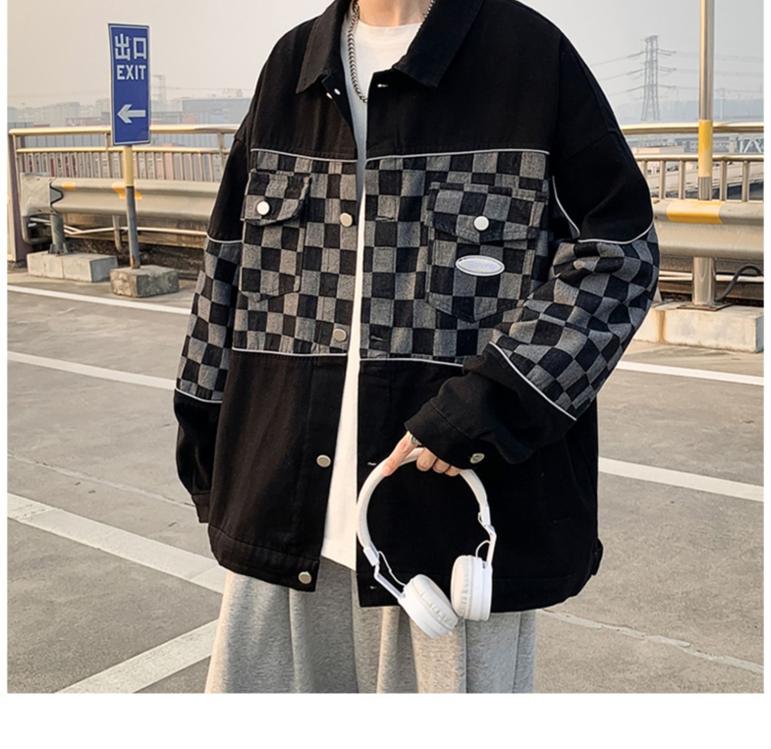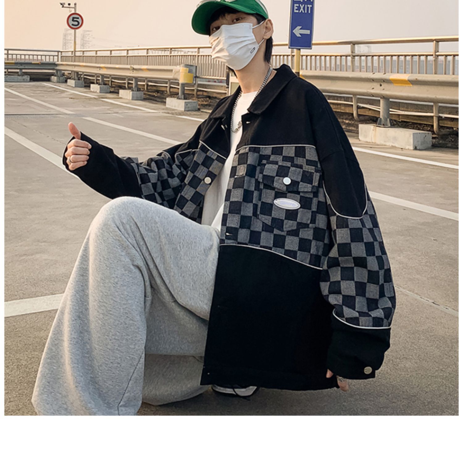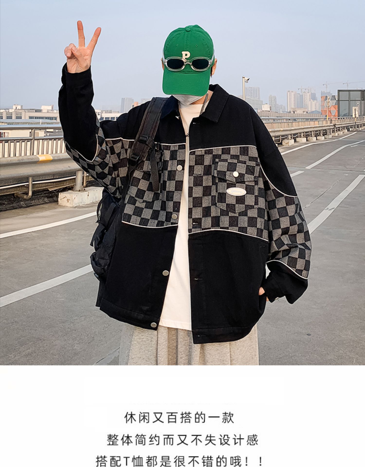 棋盘格拼接牛仔外套男日系潮牌痞帅宽松休闲情侣男装工装夹克上衣