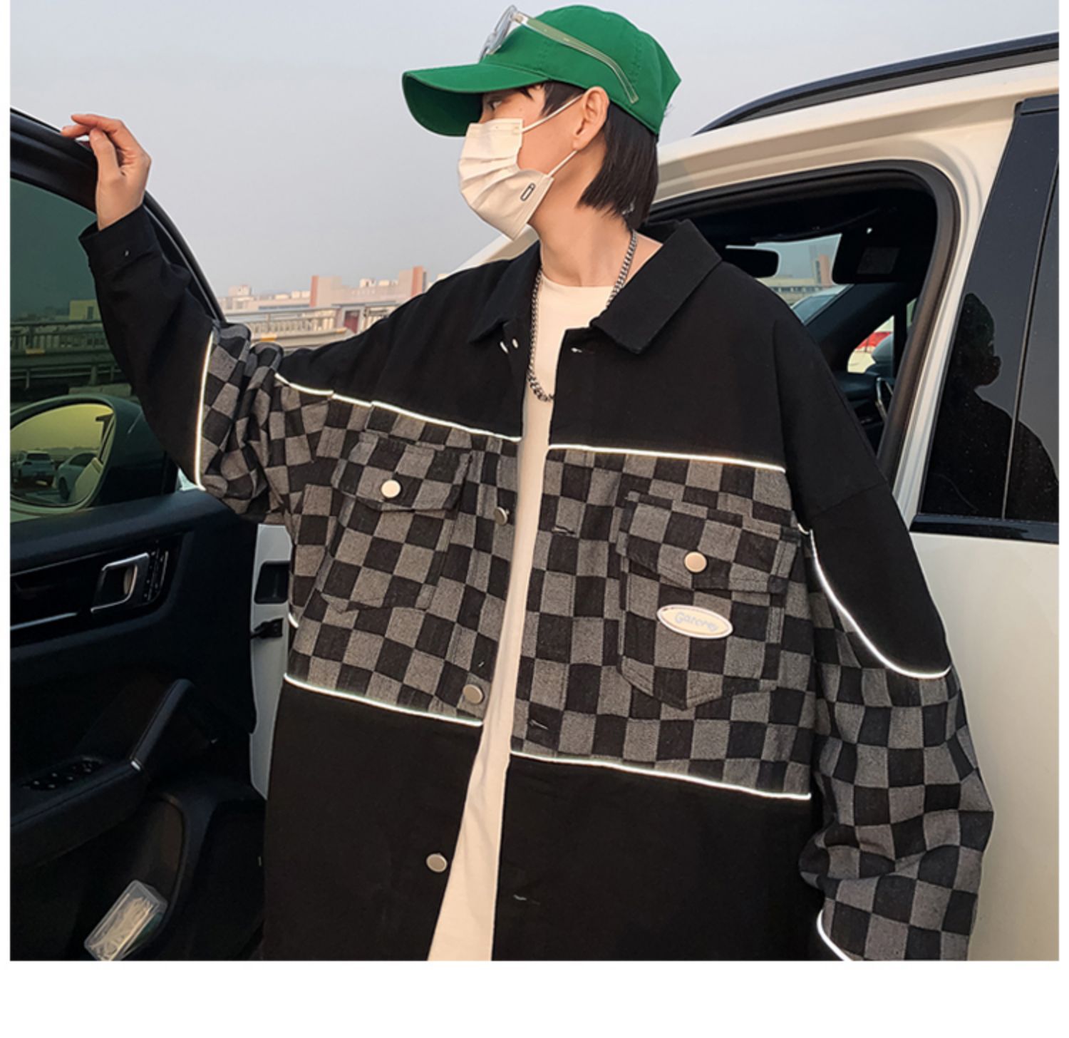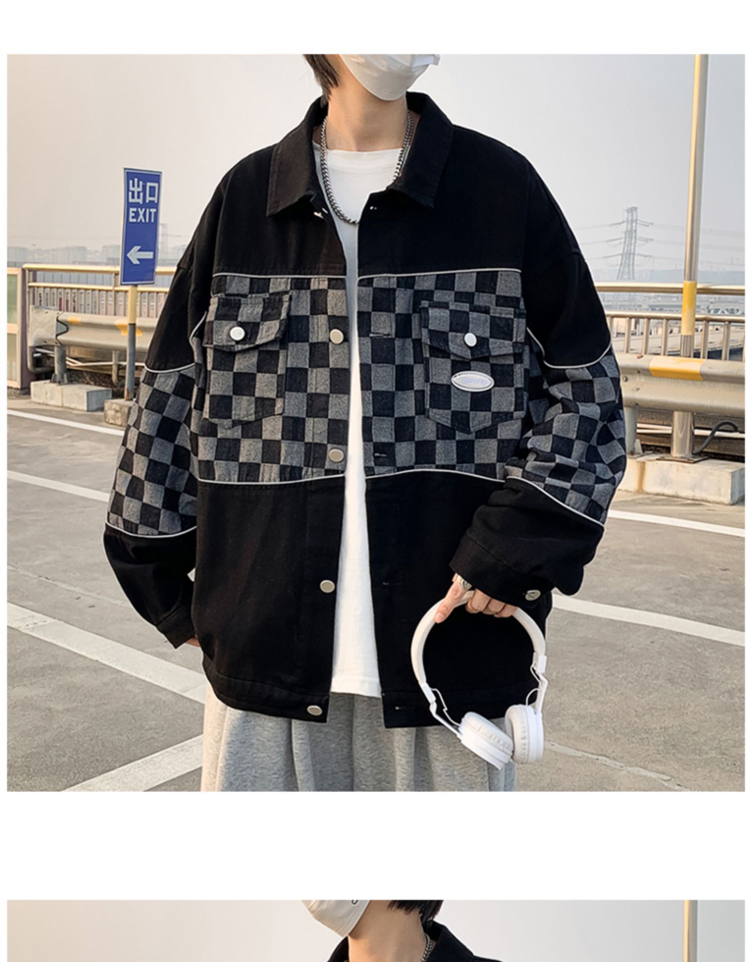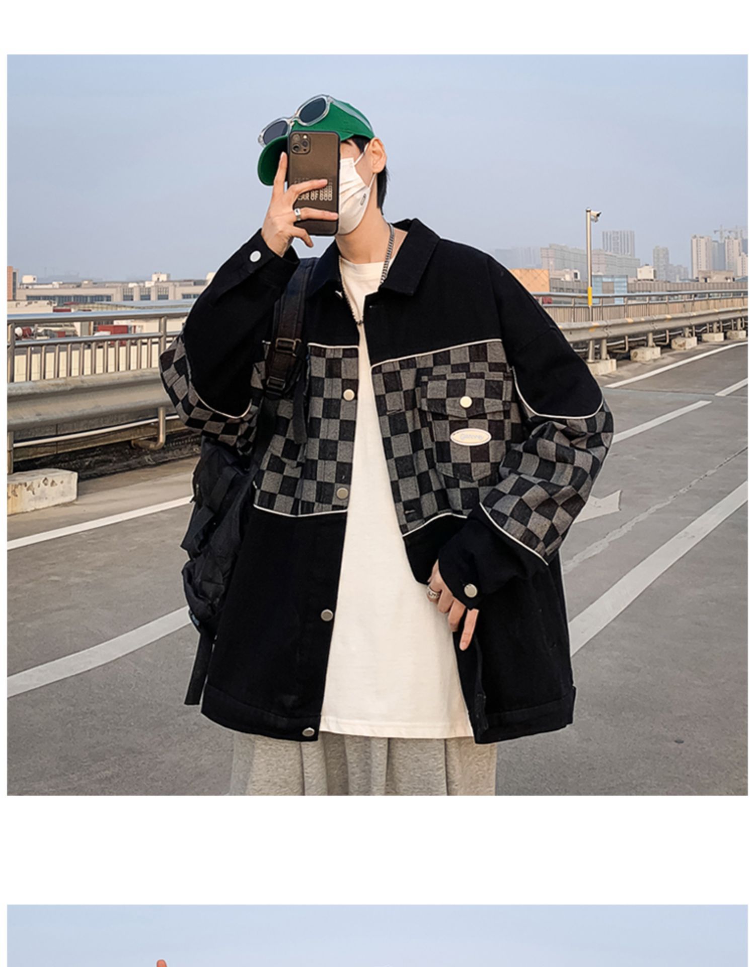 체커보드 스플라이스 데님 재킷 남성 일본 트렌디 브랜드 핸섬 루즈 캐주얼 커플 남성 워크 재킷 탑