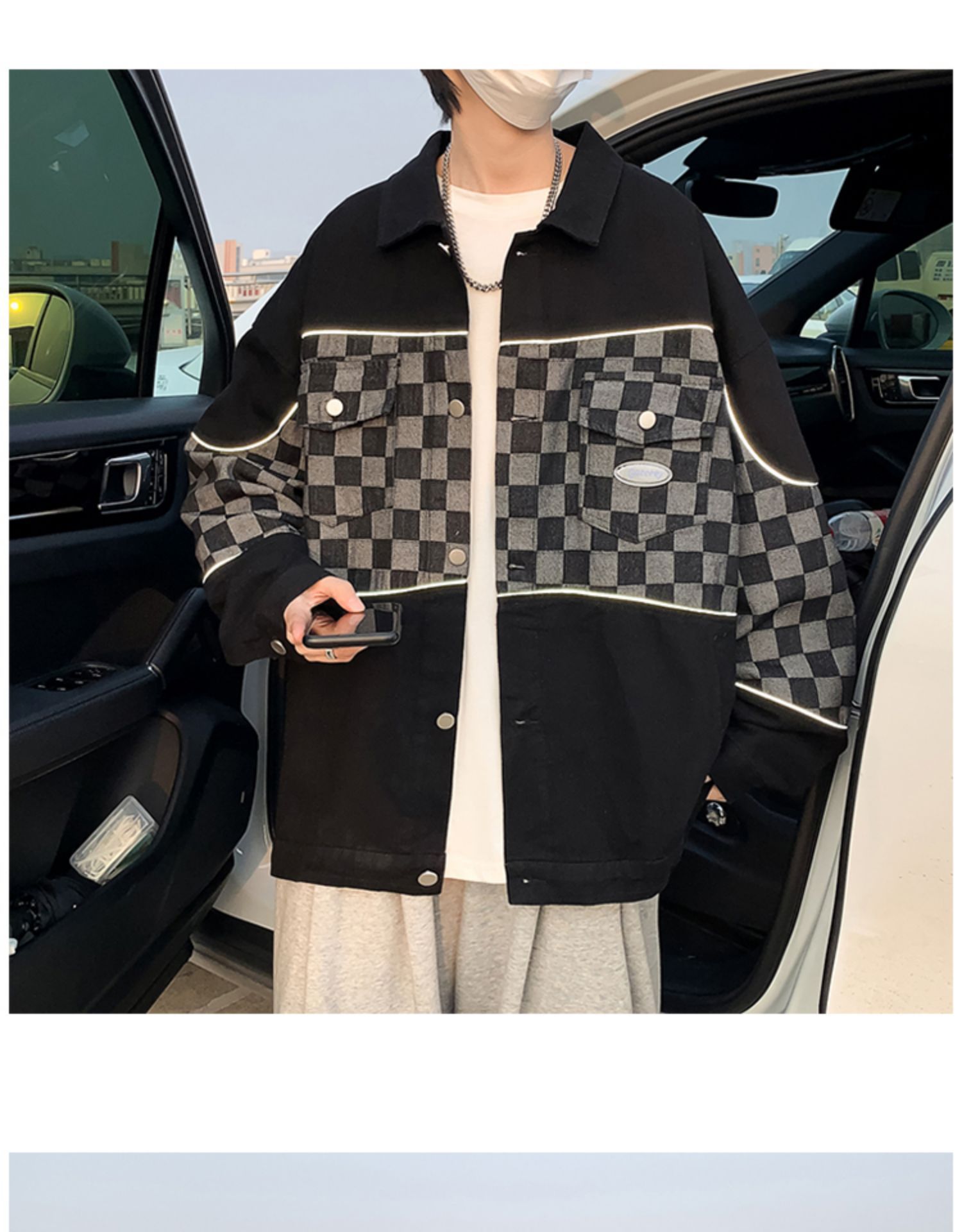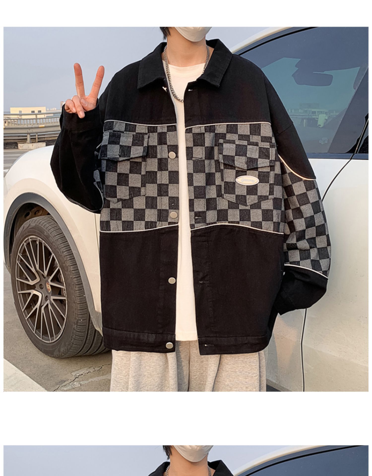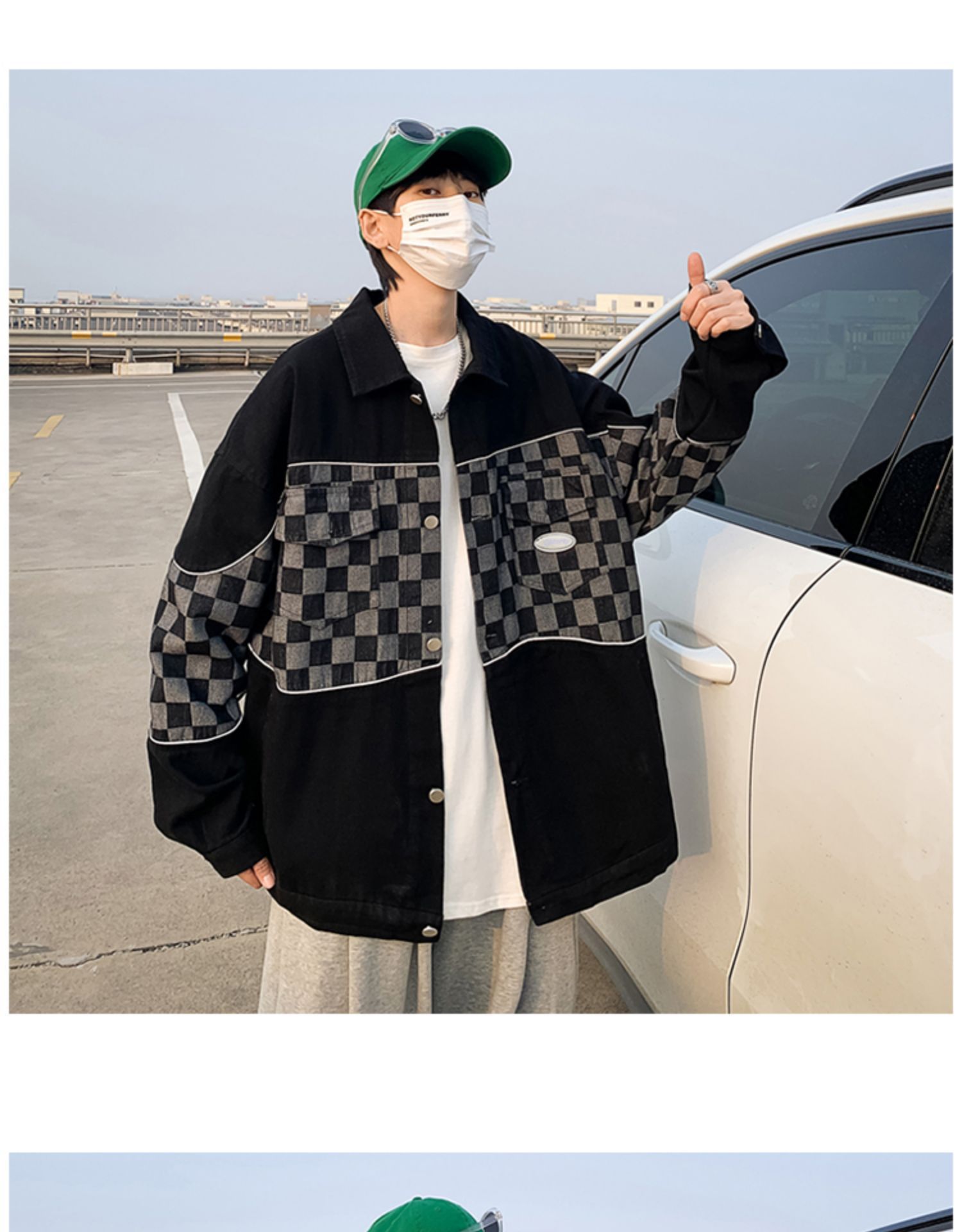 체커보드 스플라이스 데님 재킷 남성 일본 트렌디 브랜드 핸섬 루즈 캐주얼 커플 남성 워크 재킷 탑