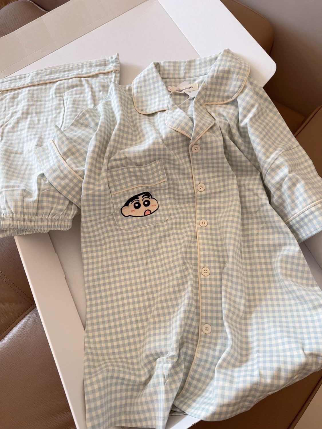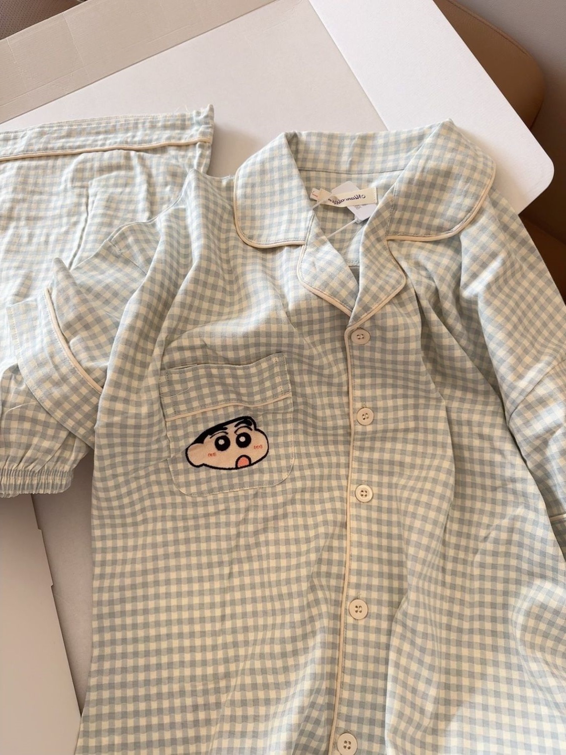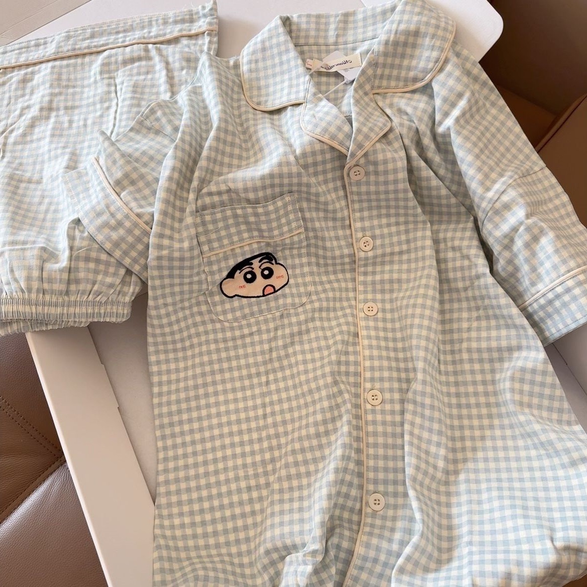 크레용 신 파자마 여성 여름 새 도착 격자 무늬 반소매 Ins 일본식 만화 학생 홈 의류 세트 외복스토어 가기