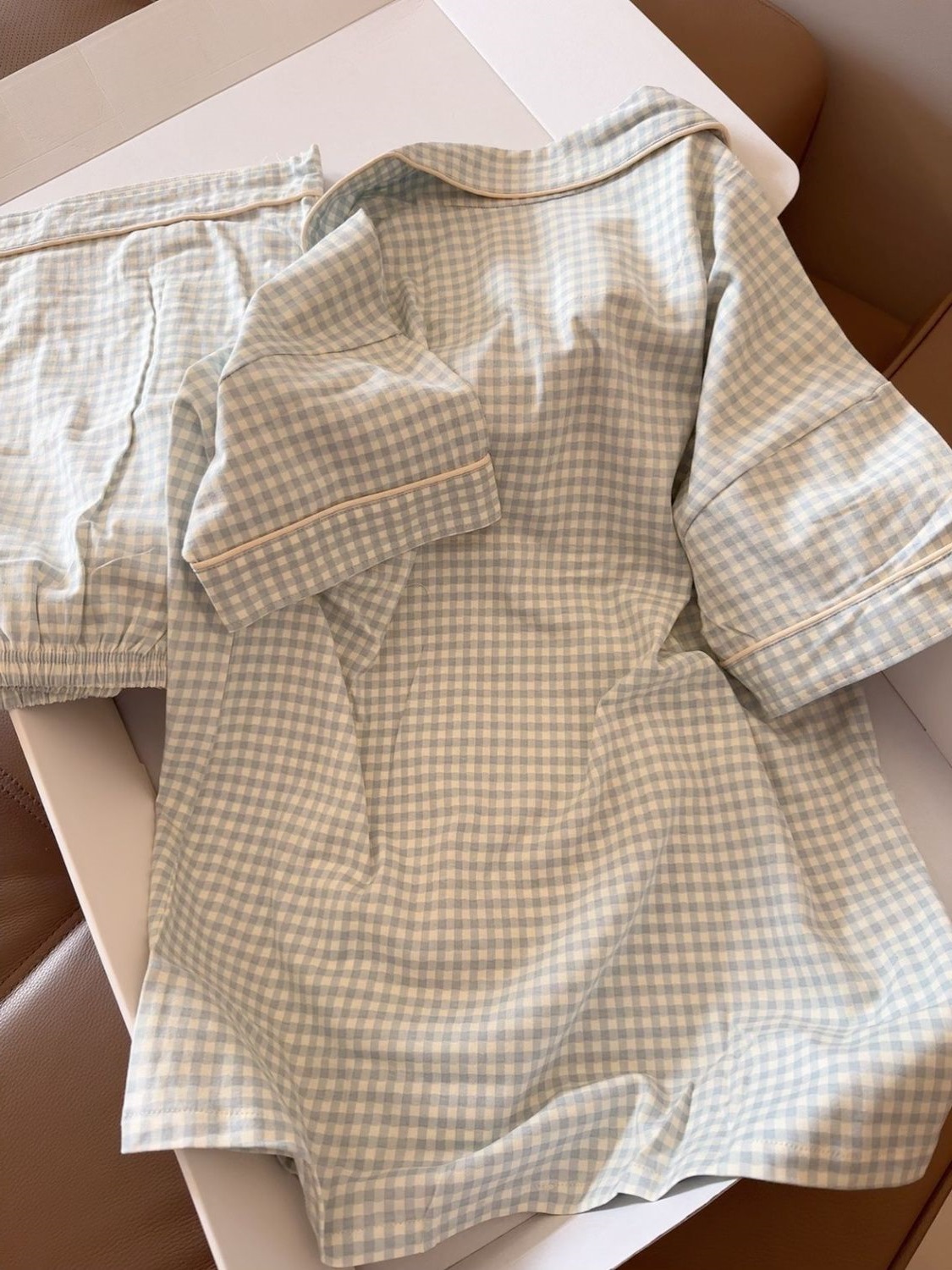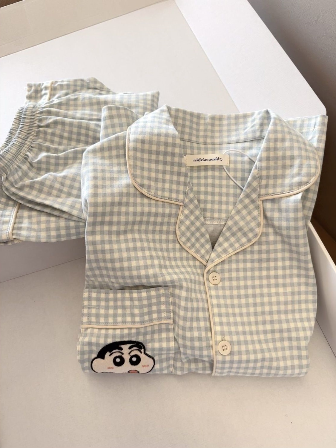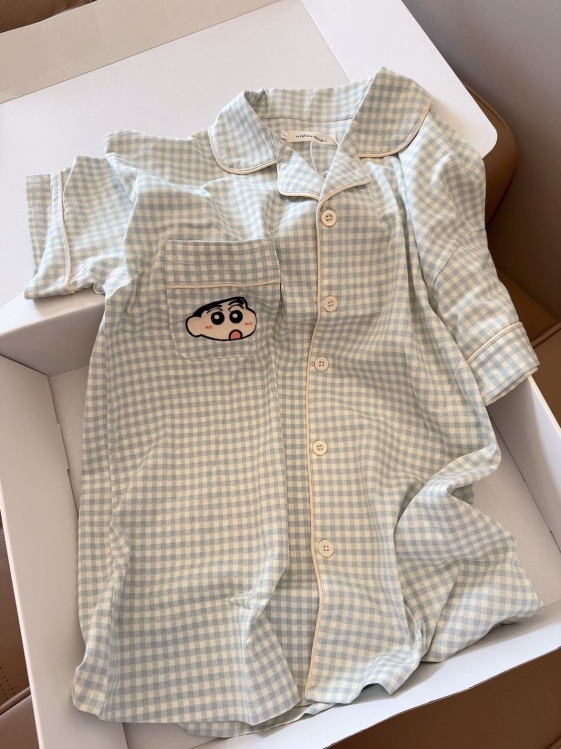 크레용 신 파자마 여성 여름 새 도착 격자 무늬 반소매 Ins 일본식 만화 학생 홈 의류 세트 외복스토어 가기