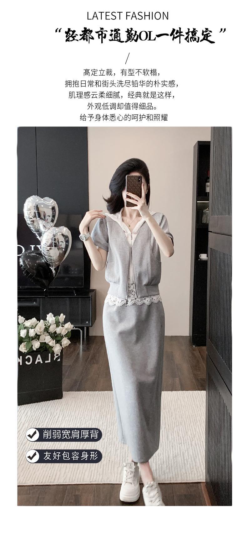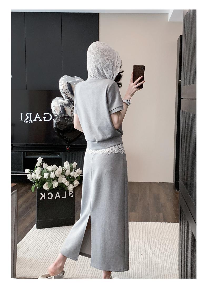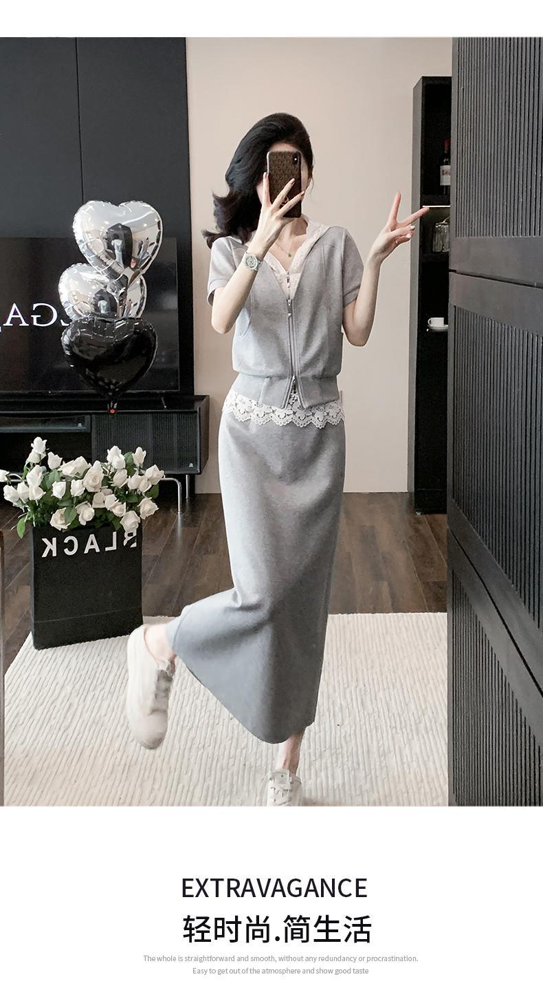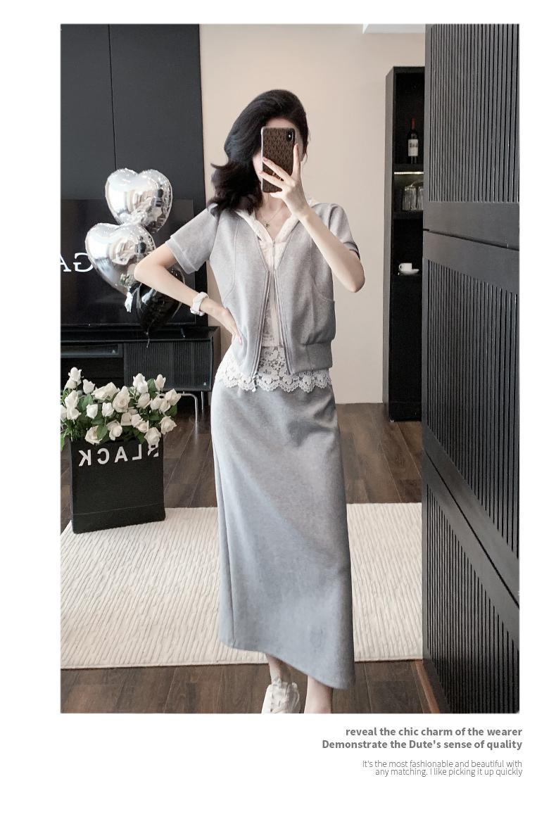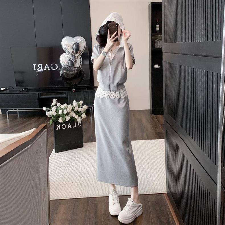 심천 난유 레저 스포츠 원피스 여성 여름 인기 스티칭 레이스 그레이 반팔 카디건 스커트 투피스 세트스토어 가기