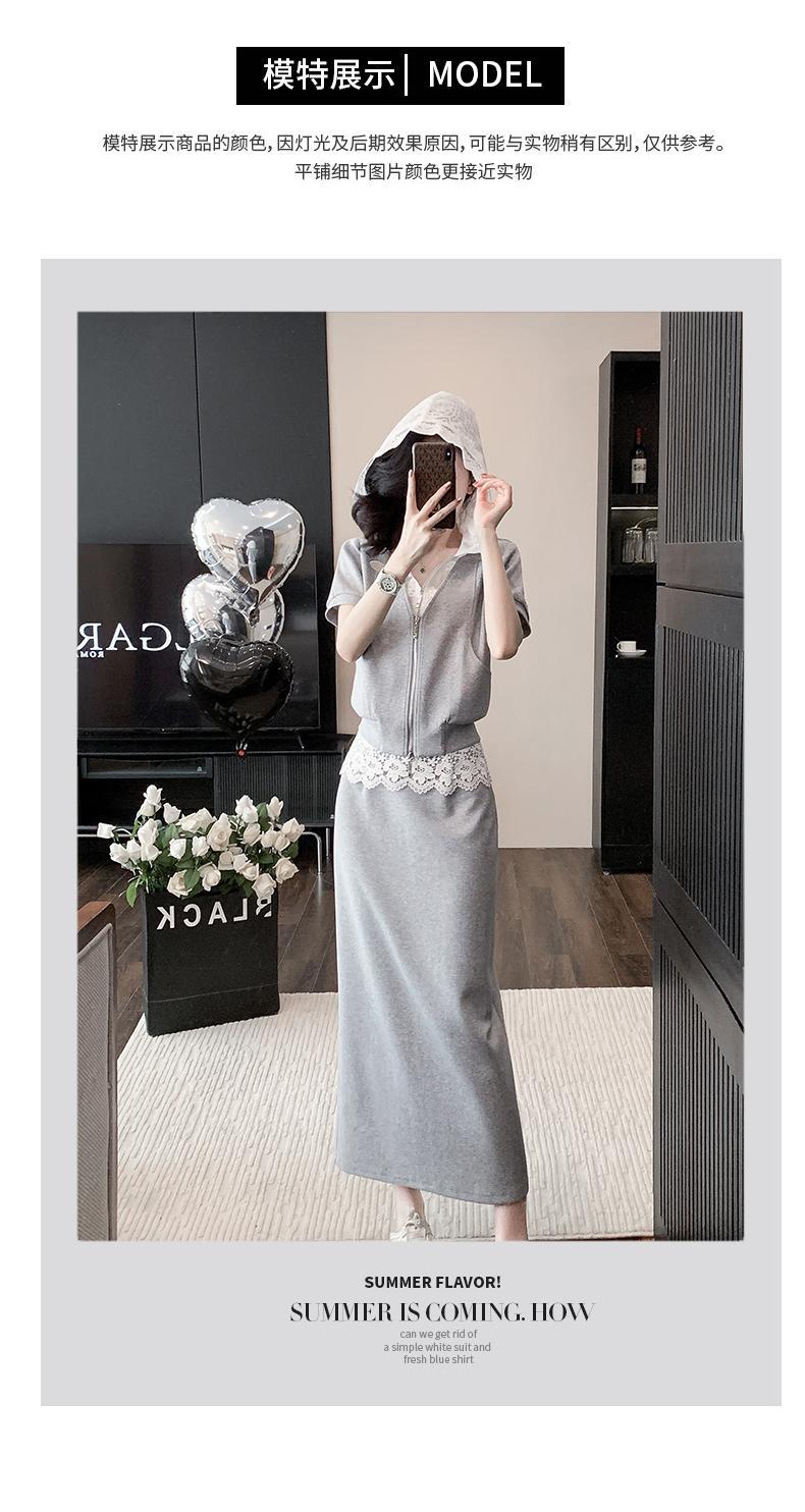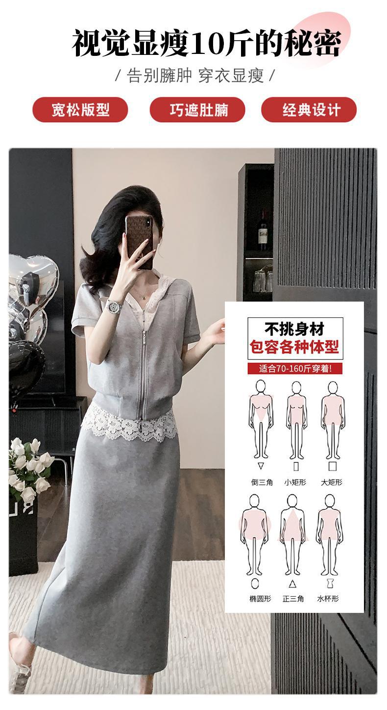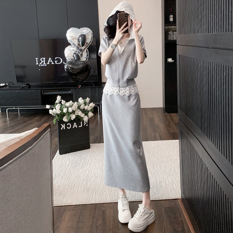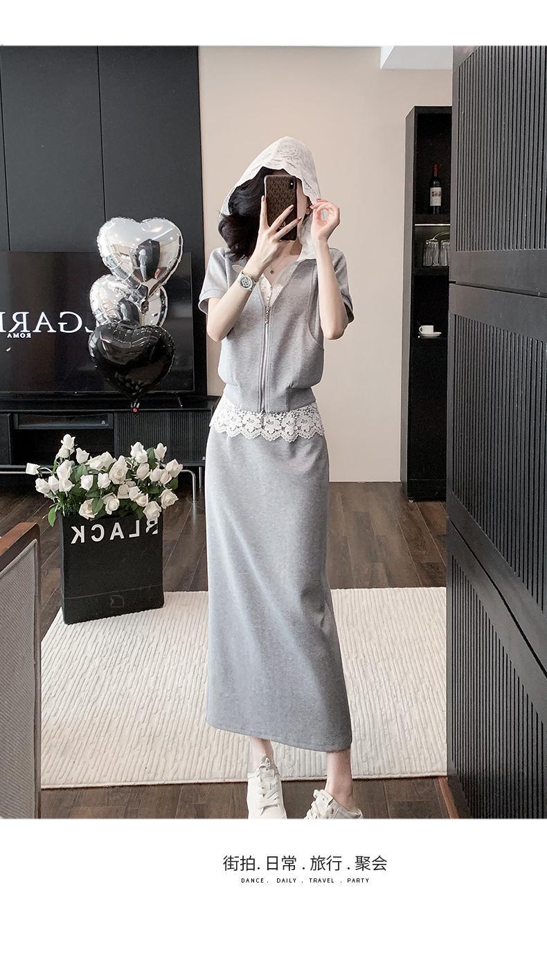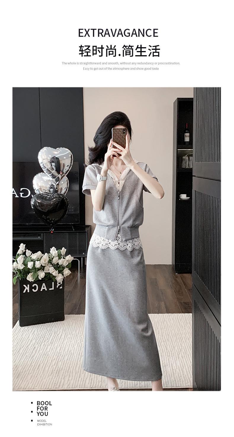 심천 난유 레저 스포츠 원피스 여성 여름 인기 스티칭 레이스 그레이 반팔 카디건 스커트 투피스 세트스토어 가기