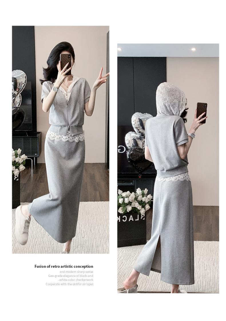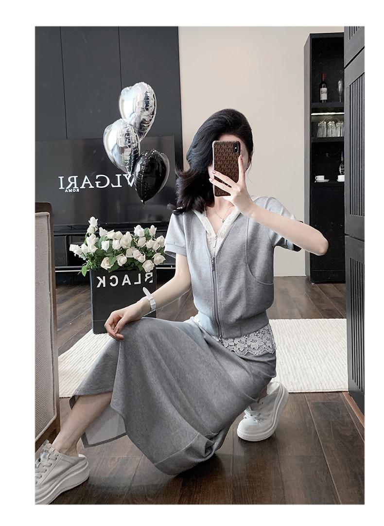 심천 난유 레저 스포츠 원피스 여성 여름 인기 스티칭 레이스 그레이 반팔 카디건 스커트 투피스 세트