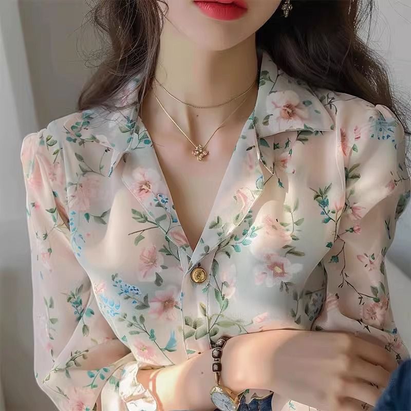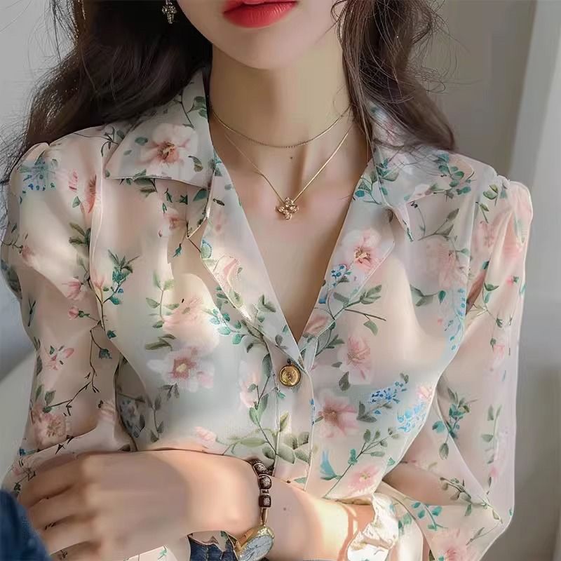 2025 여름 새로운 도착 프랑스 스타일 꽃 셔츠 여성의 긴 소매 느슨한 캐주얼 우아한 통근 전문 원피스 탑