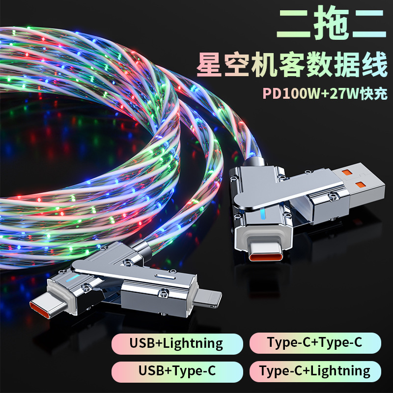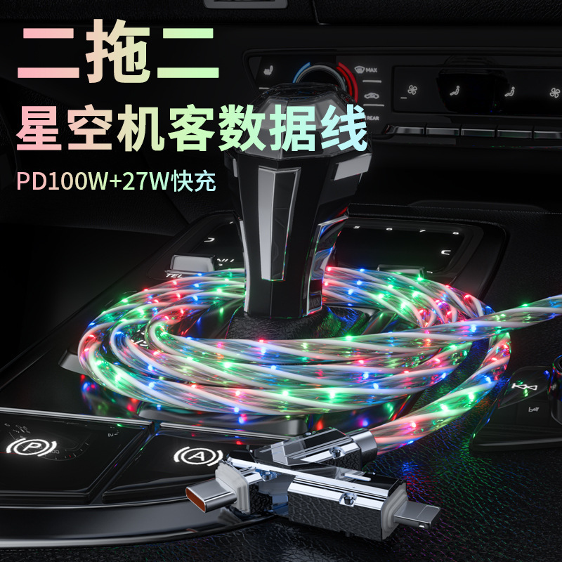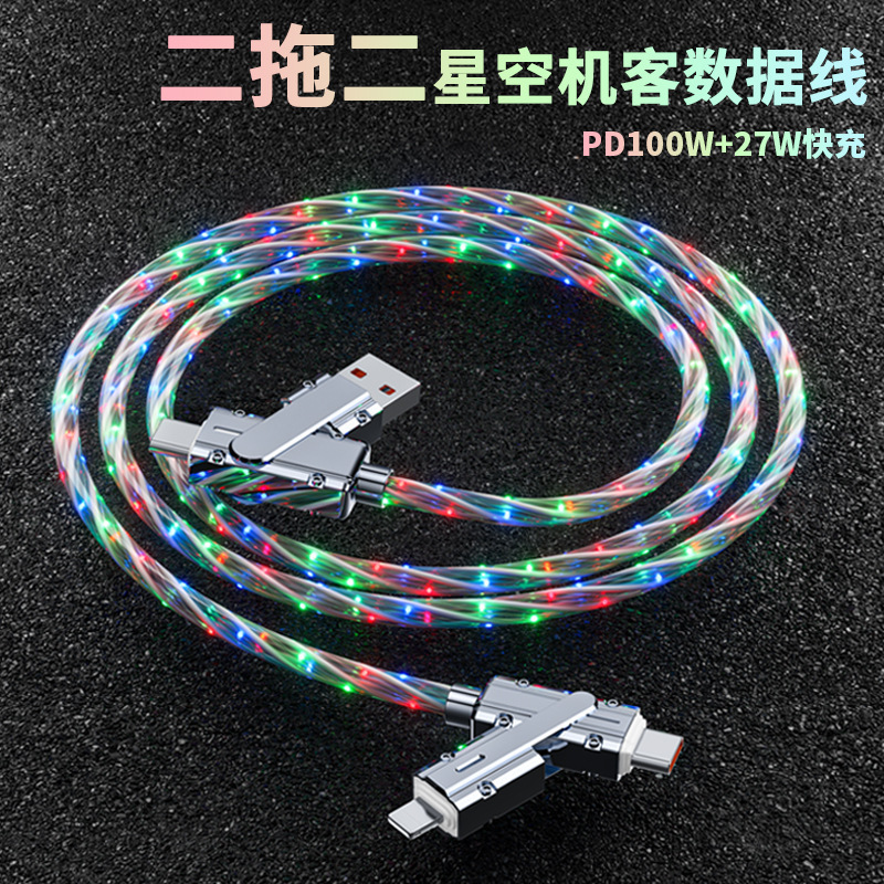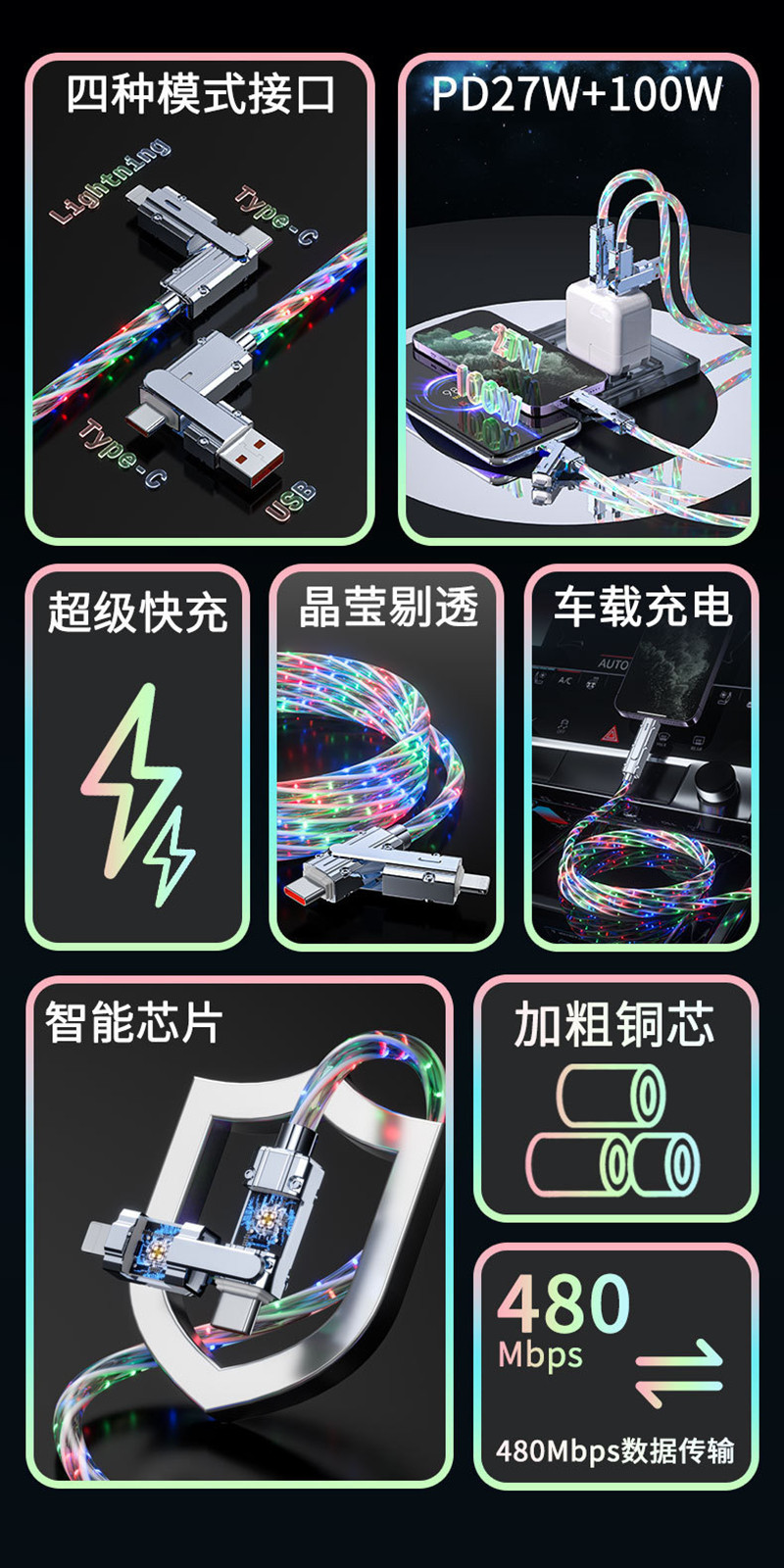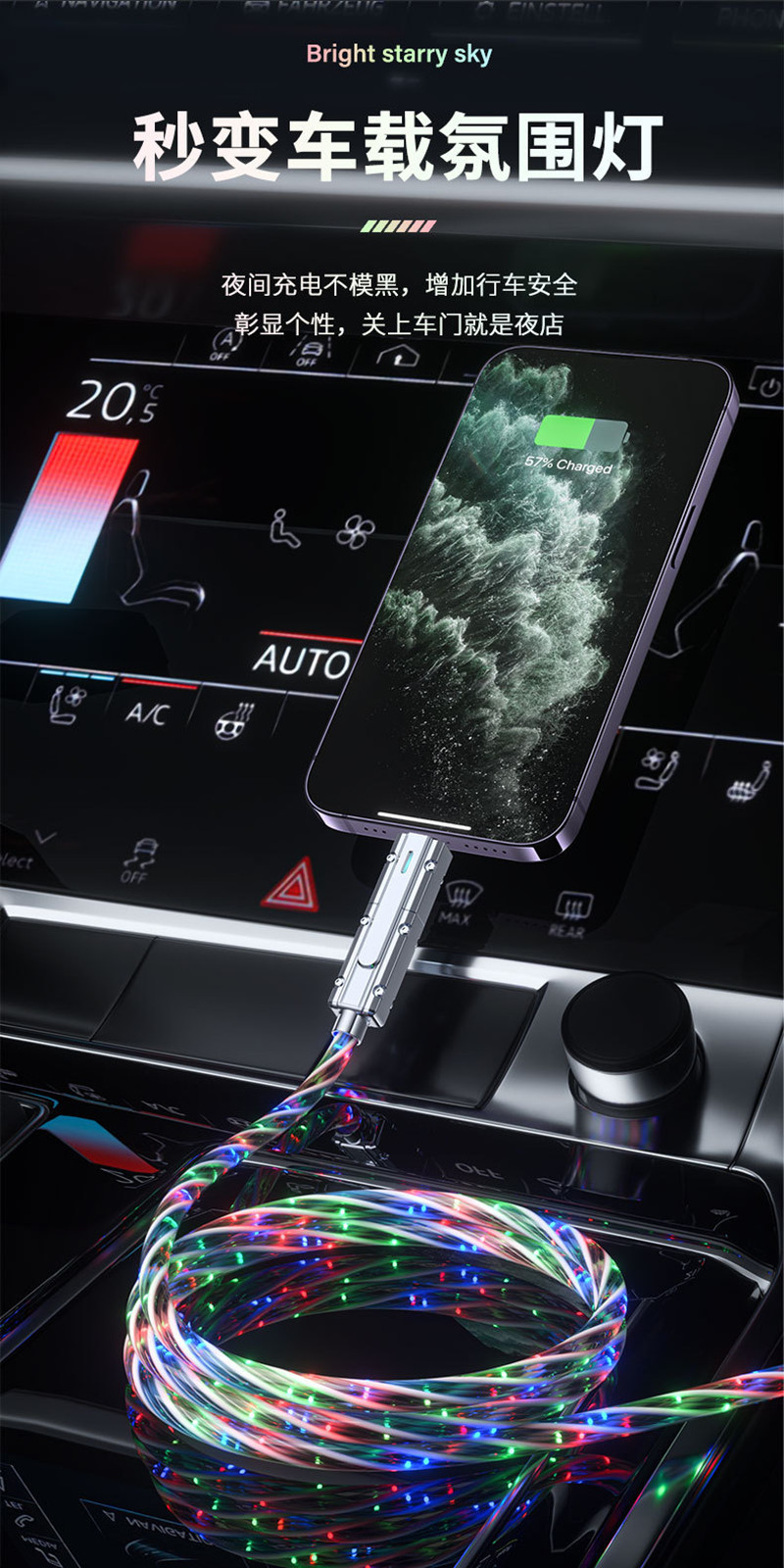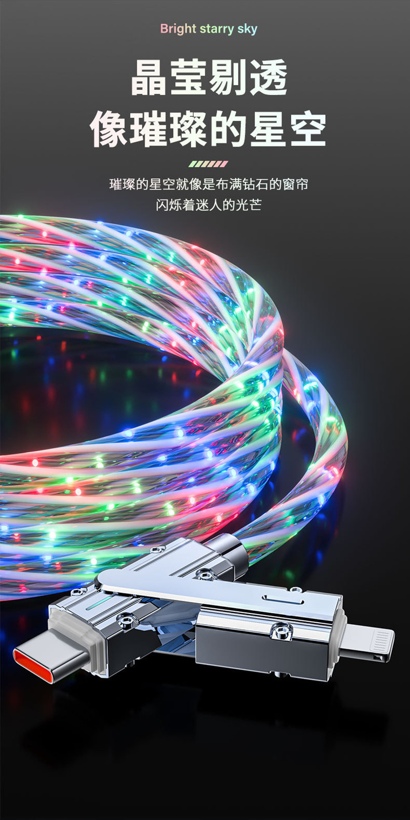 【필수품】별빛 4-in-1 데이터 케이블, 7색 라이트닝 자동차용 2-in-2 분위기 조명 고속 충전 케이블
