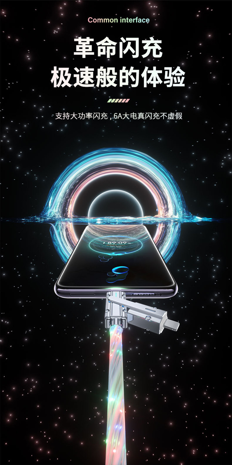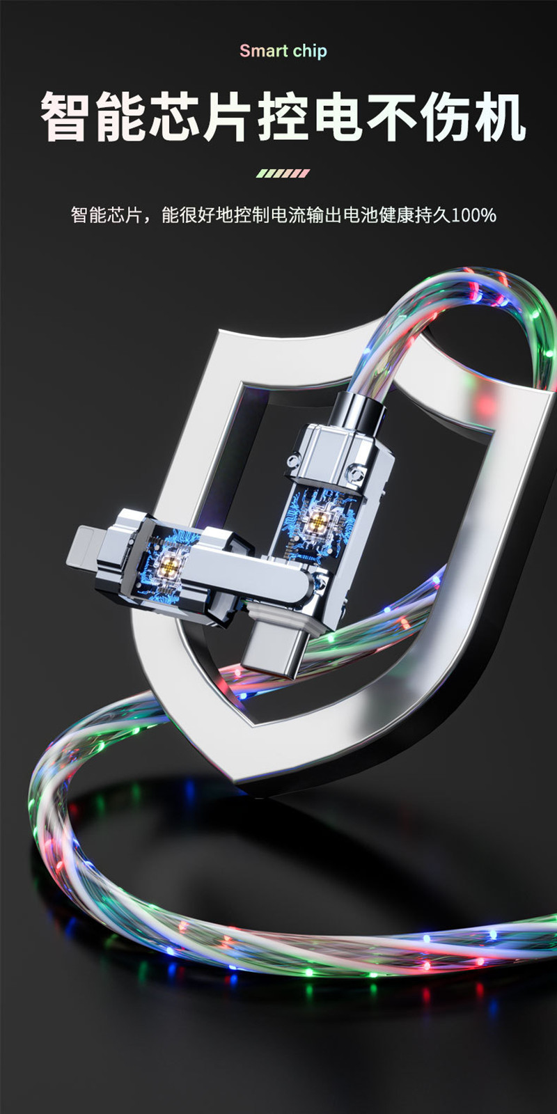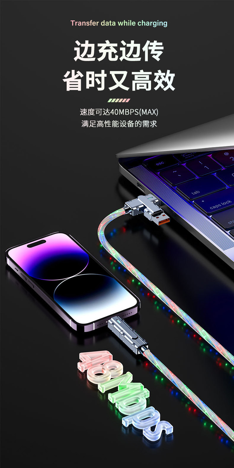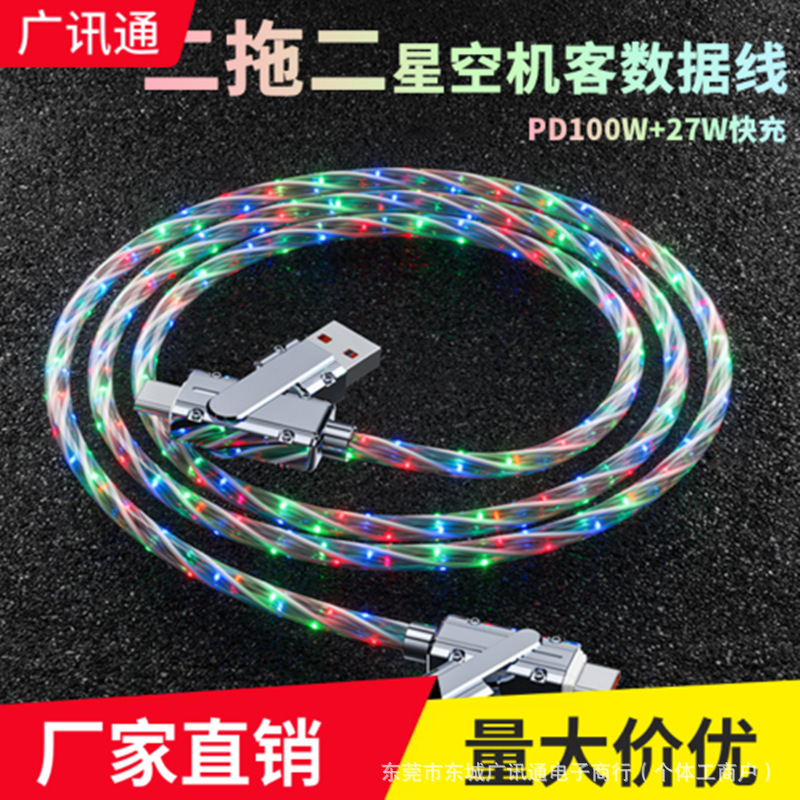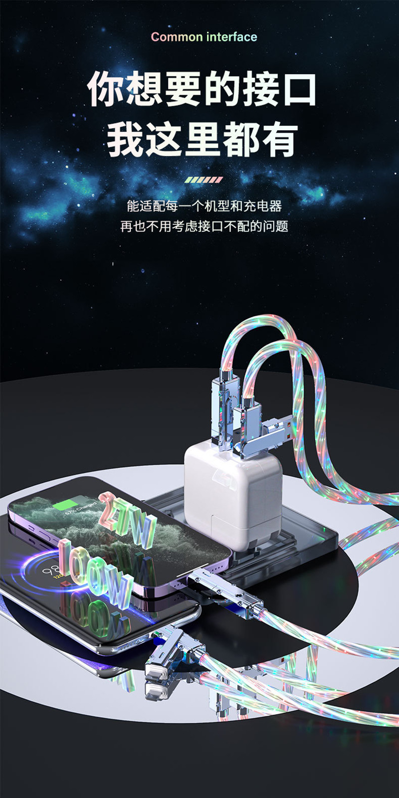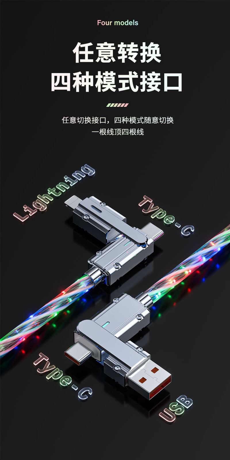【필수품】별빛 4-in-1 데이터 케이블, 7색 라이트닝 자동차용 2-in-2 분위기 조명 고속 충전 케이블