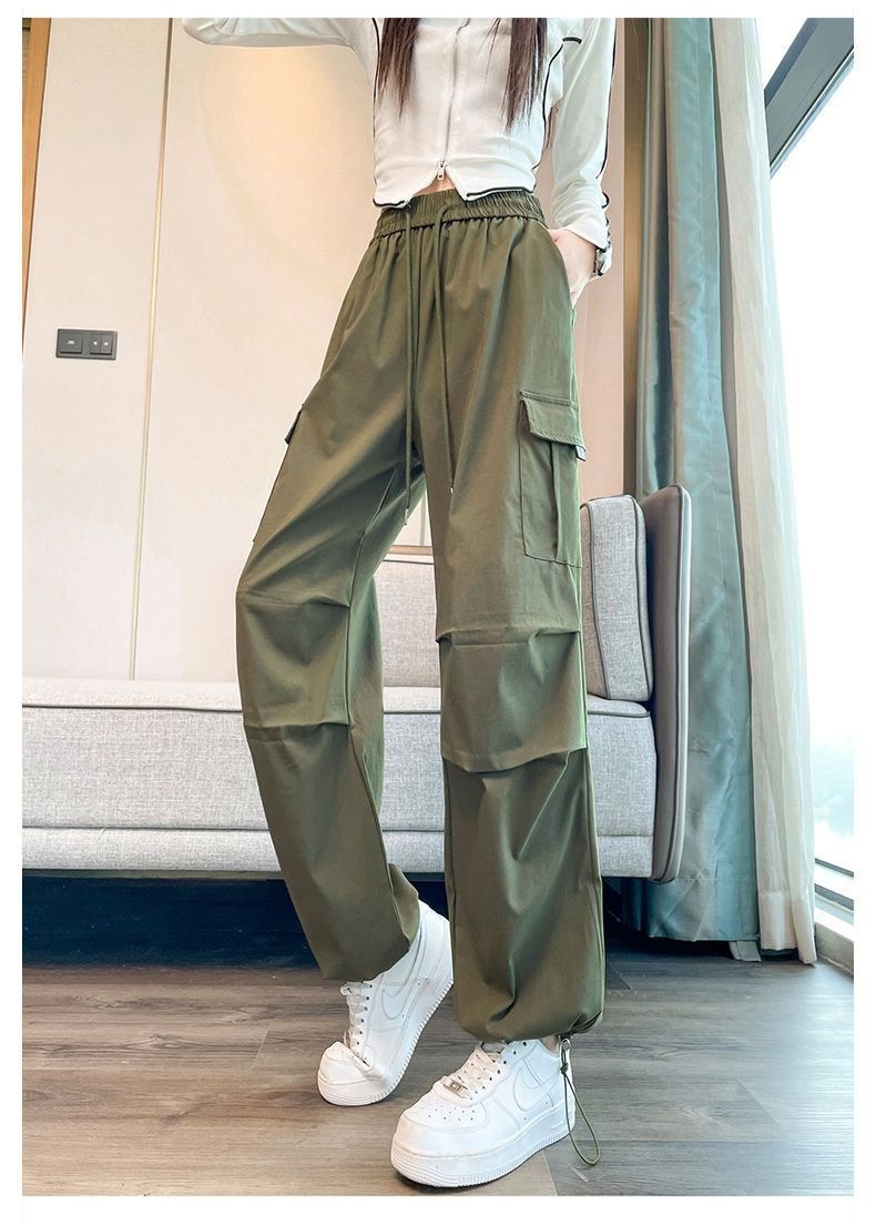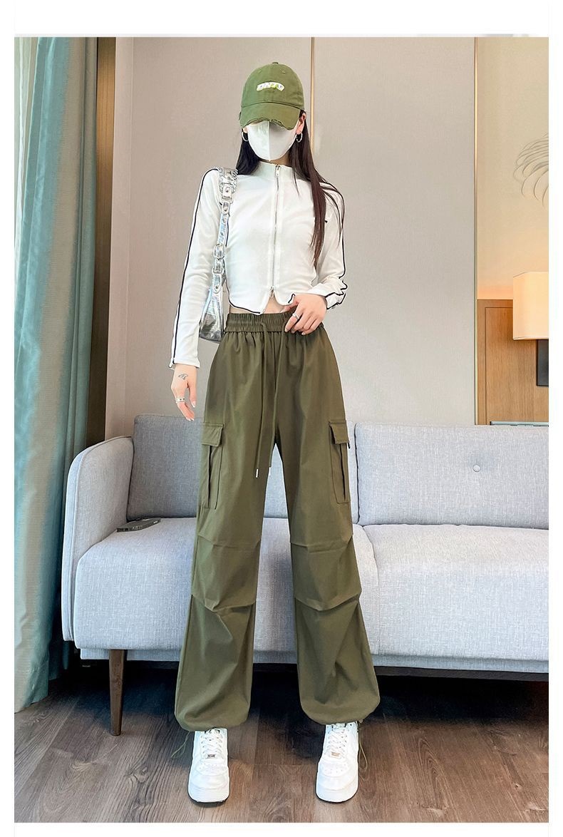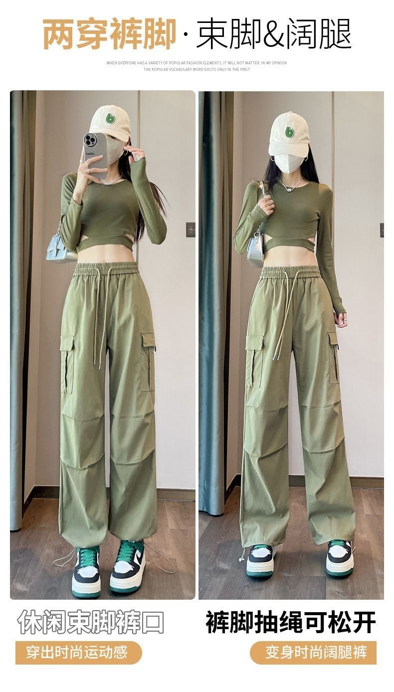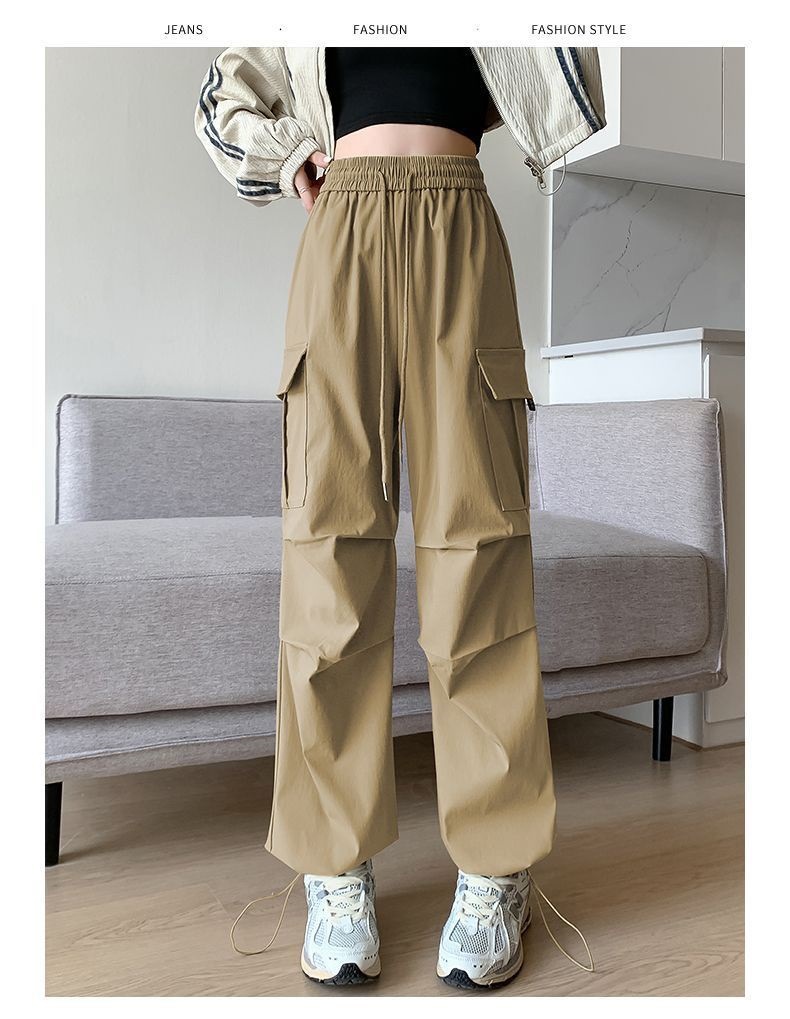 Douyin 품질의 새로운 미국식 작업복 여성용 슬리밍 드로스트링 하이킹 바지 하이 웨이스트 캐주얼 와이드 레그 팬츠
