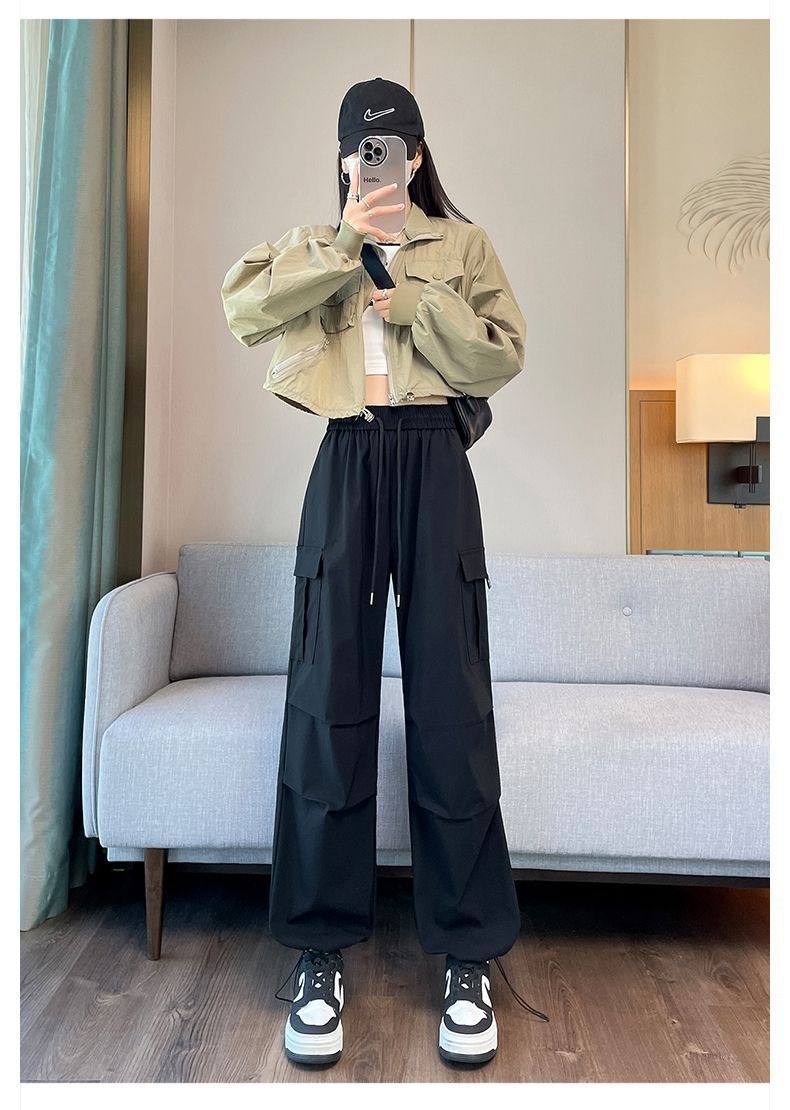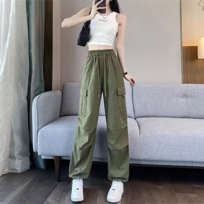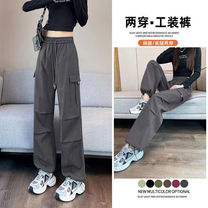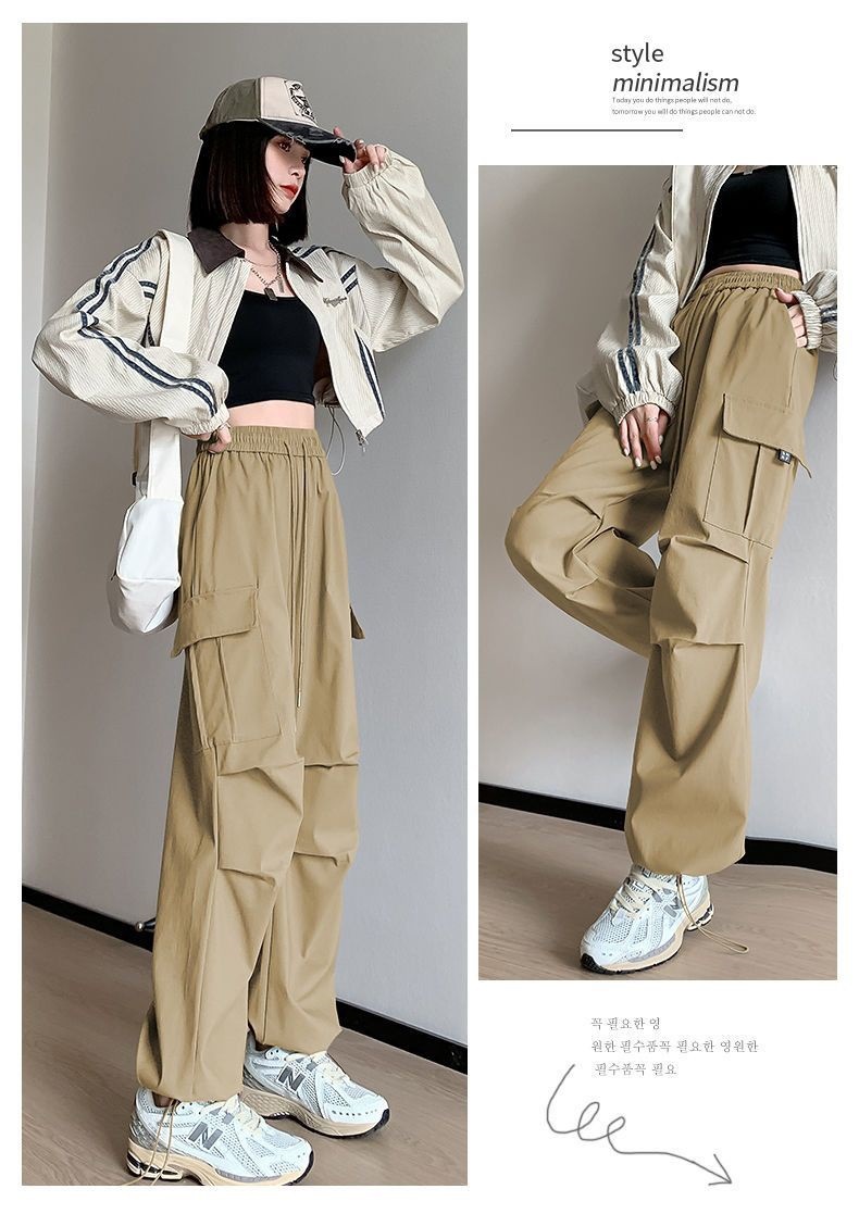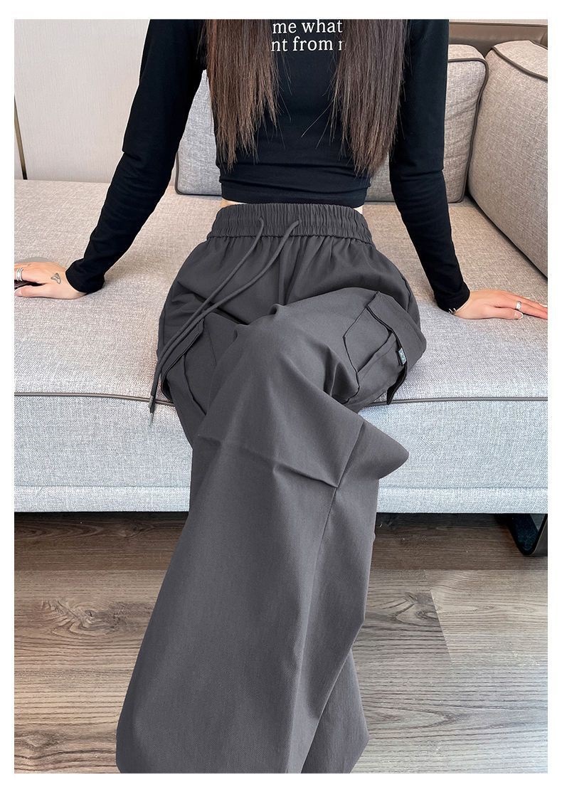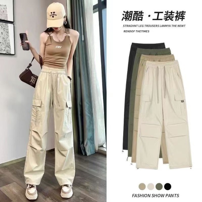 Douyin 품질의 새로운 미국식 작업복 여성용 슬리밍 드로스트링 하이킹 바지 하이 웨이스트 캐주얼 와이드 레그 팬츠