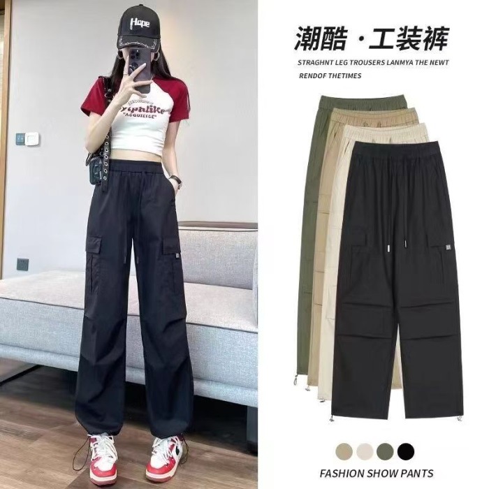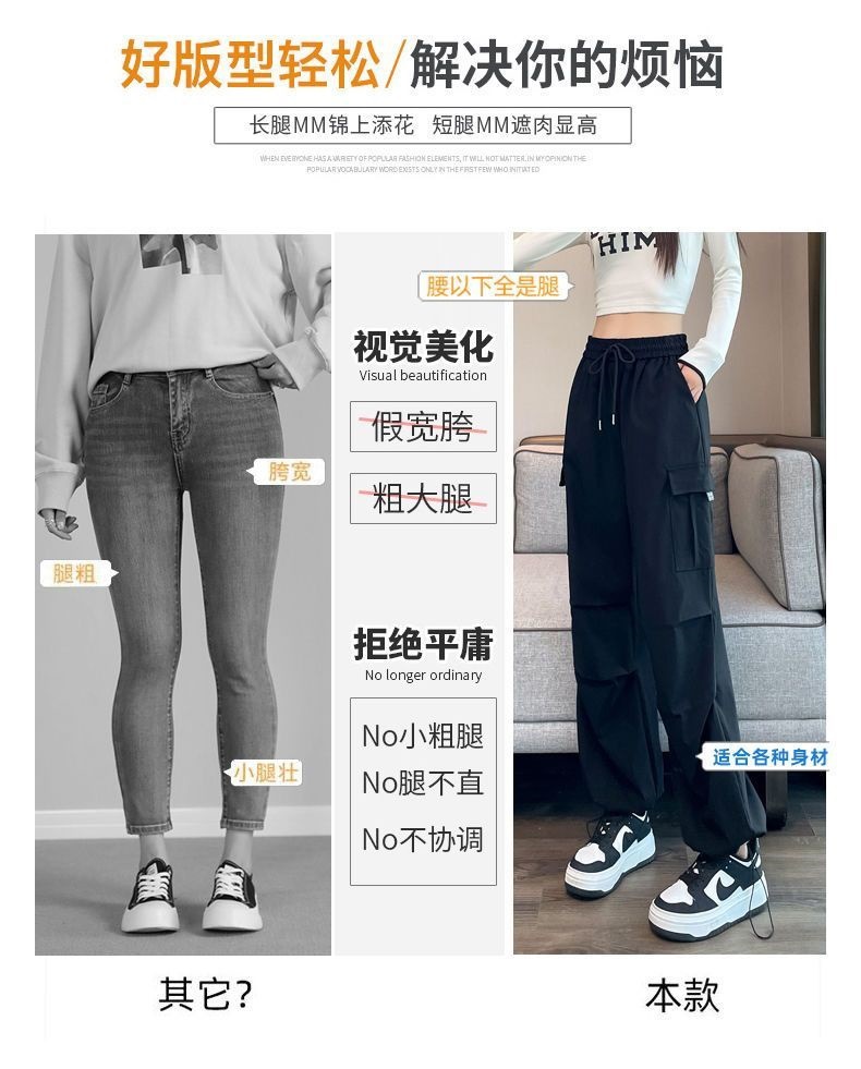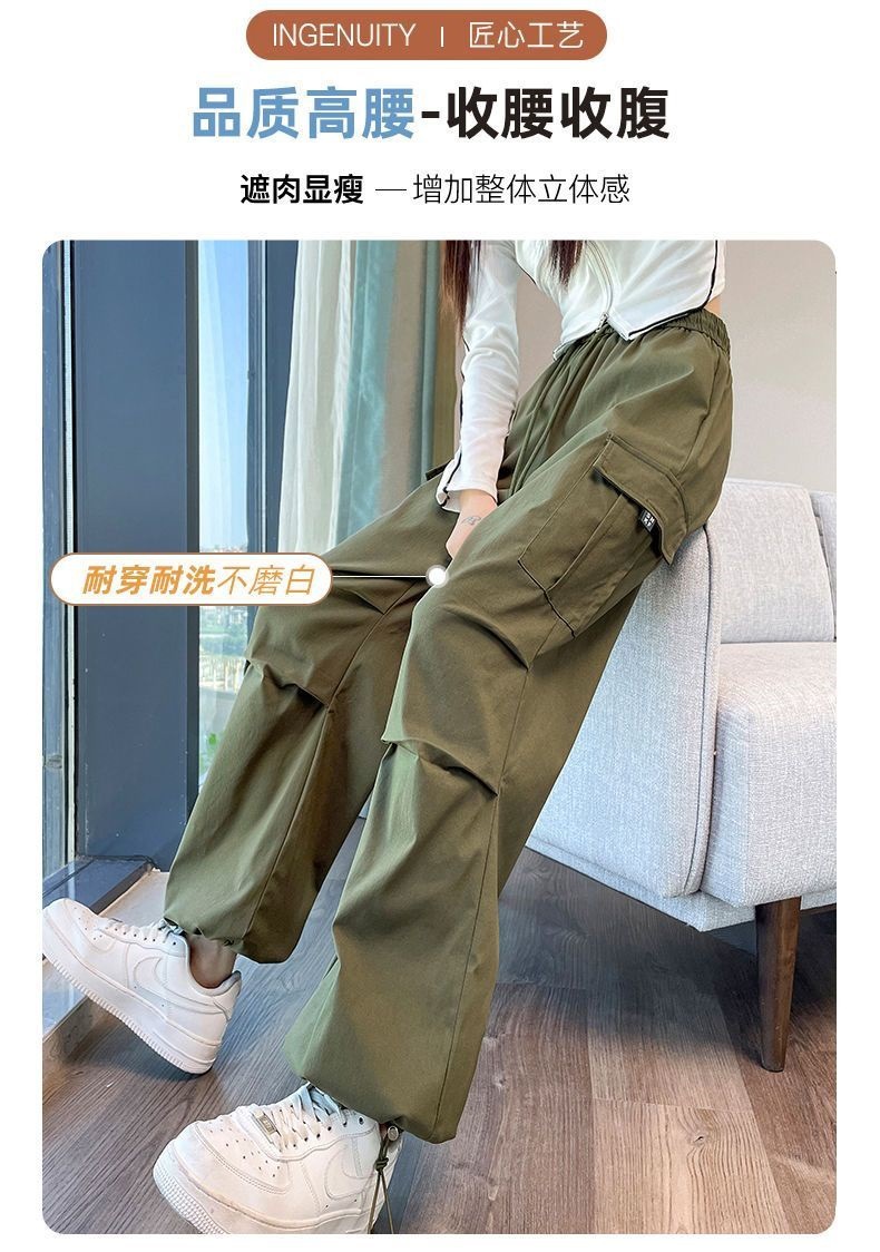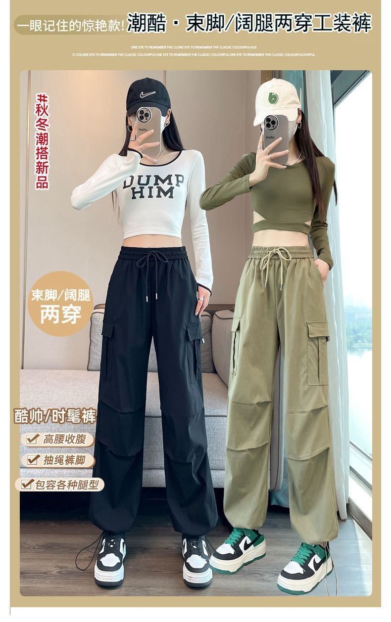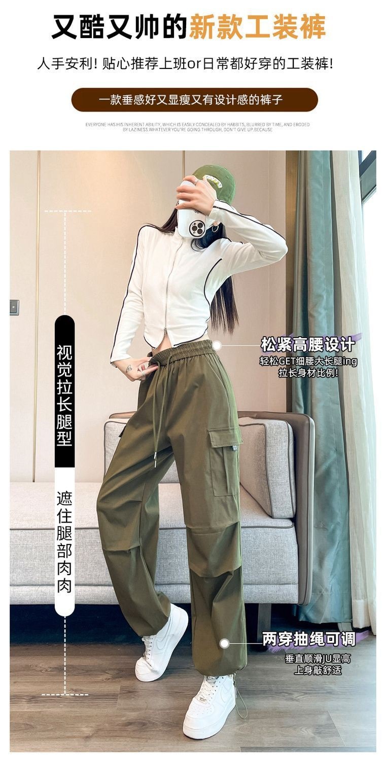 Douyin 품질의 새로운 미국식 작업복 여성용 슬리밍 드로스트링 하이킹 바지 하이 웨이스트 캐주얼 와이드 레그 팬츠스토어 가기