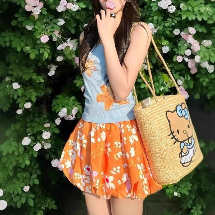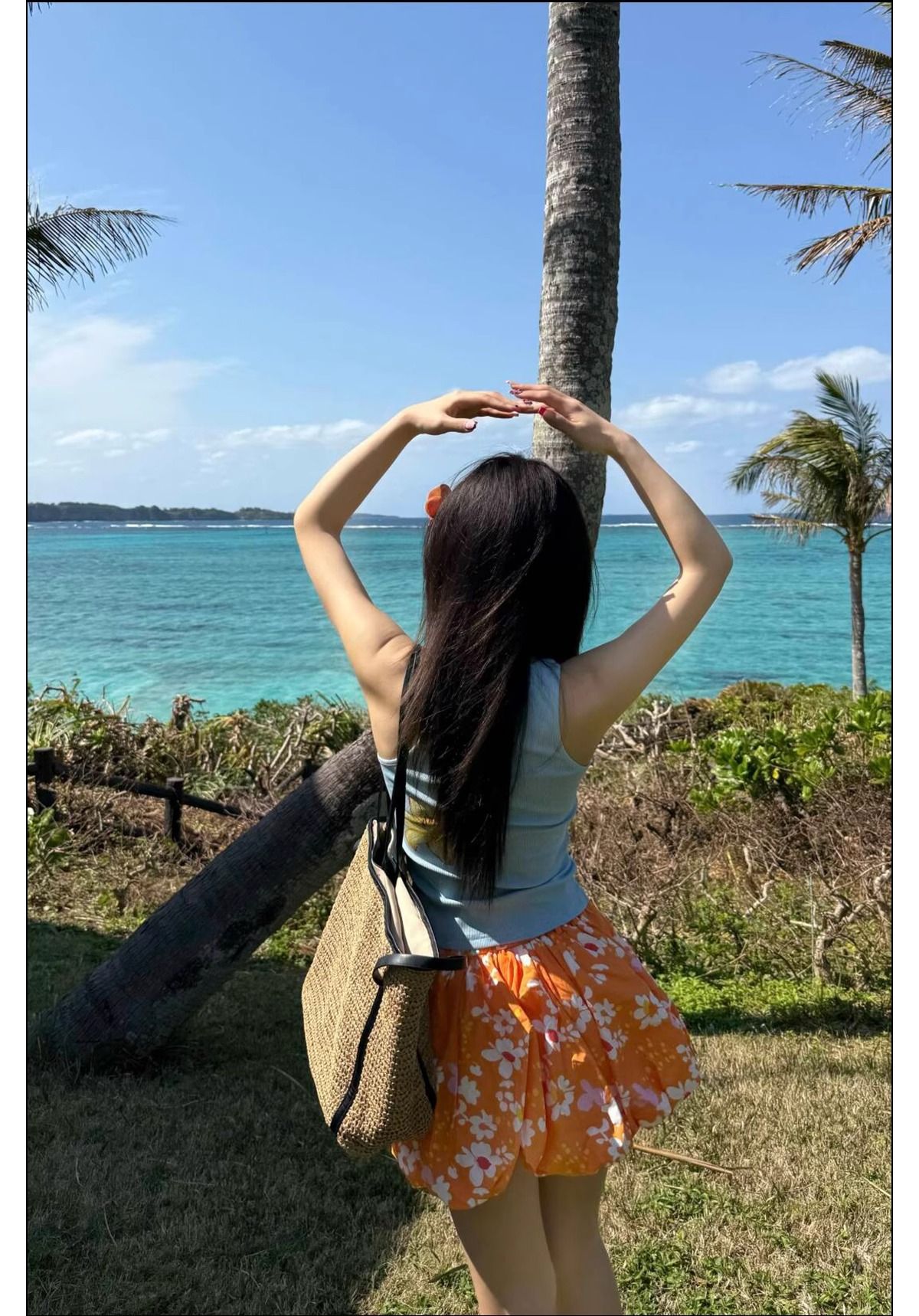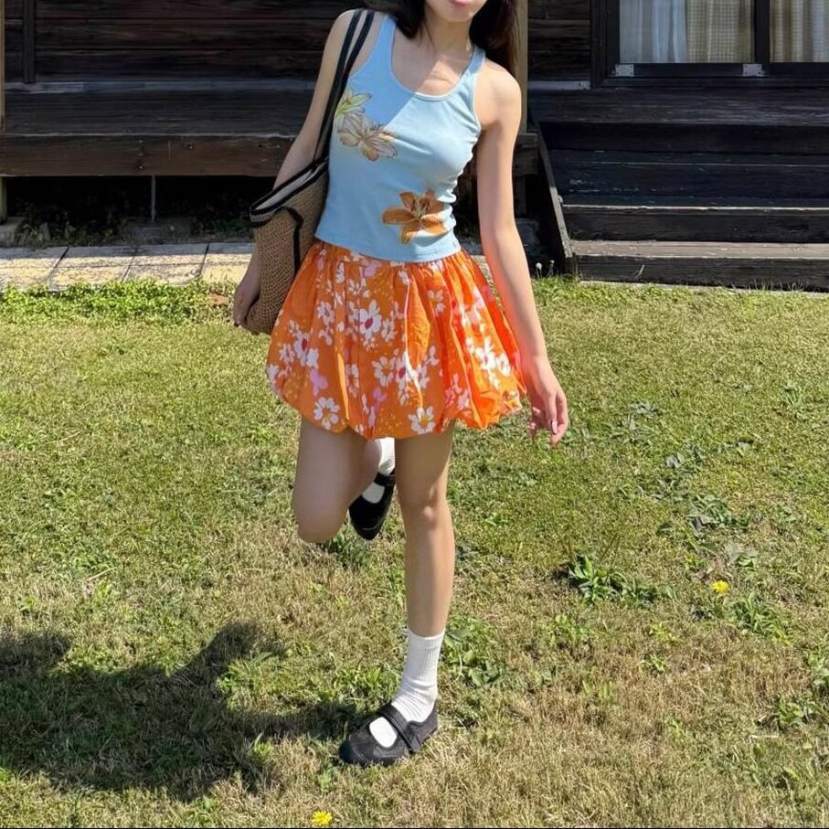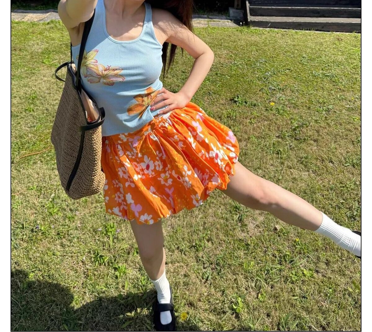 오렌지 해변 리조트 스타일 2025 새로운 여성 복고풍 꽃 스커트 여름 뜨거운 소녀 하이 웨이스트 캐주얼 스커트 짧은 스커트
