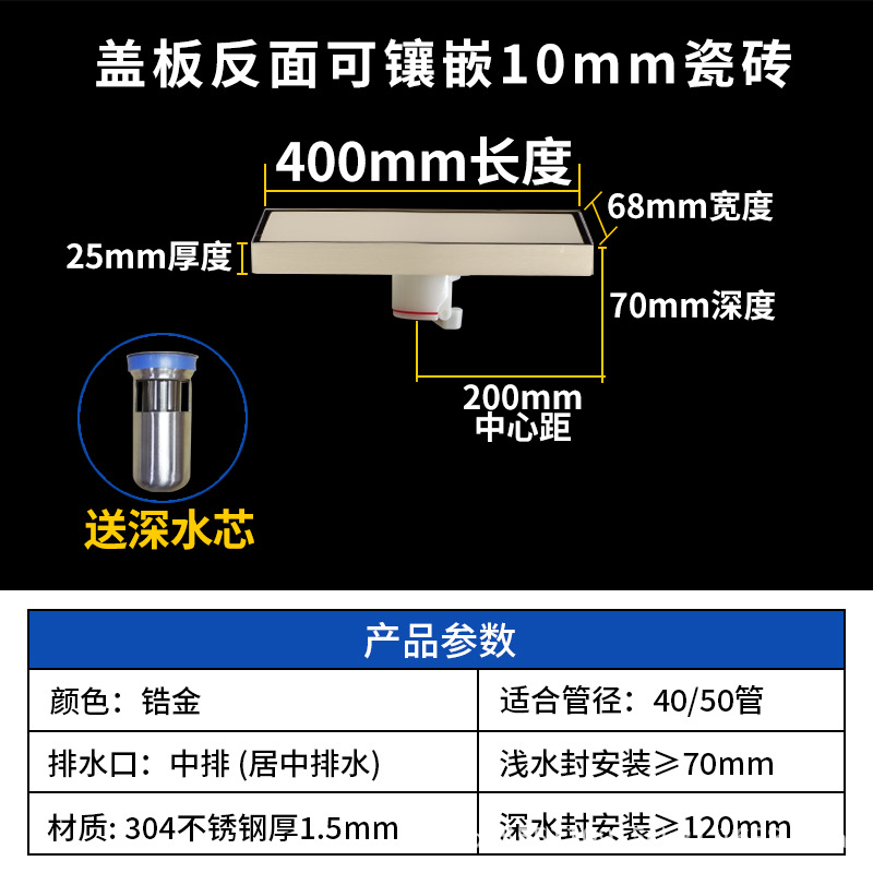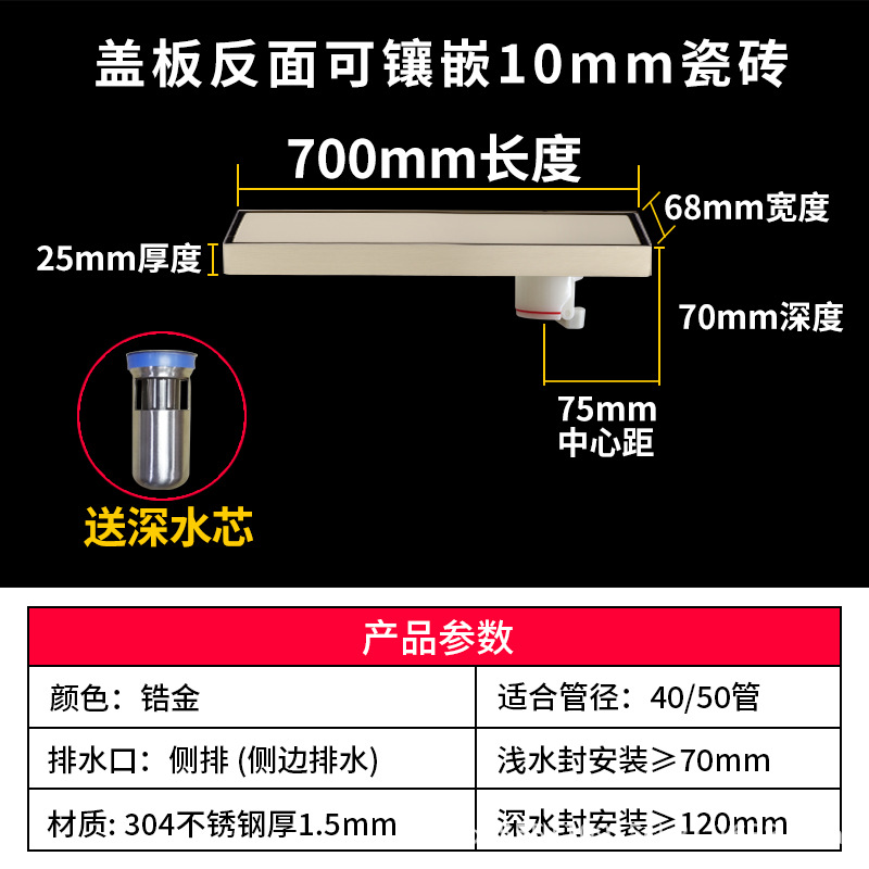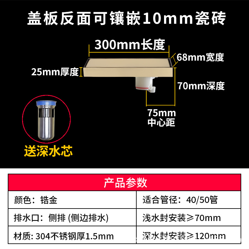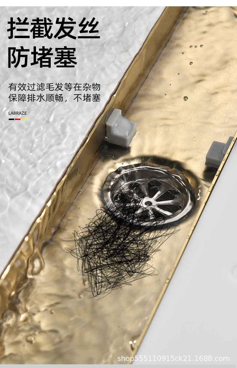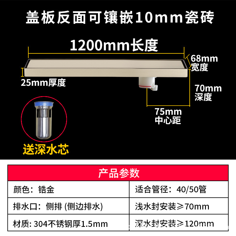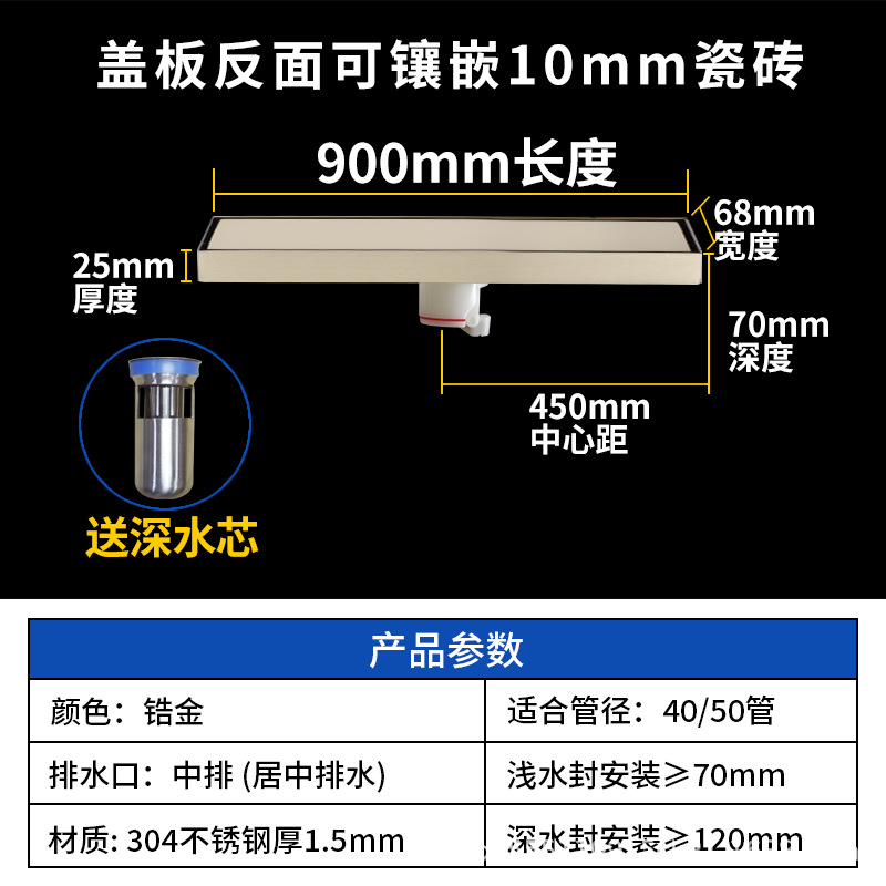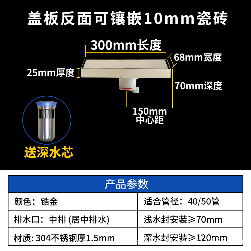 공장 직접 판매 보이지 않는 바닥 배수구 304 스테인레스 스틸 긴 스트립 지르코늄 골드 타일 방취 욕실스토어 가기