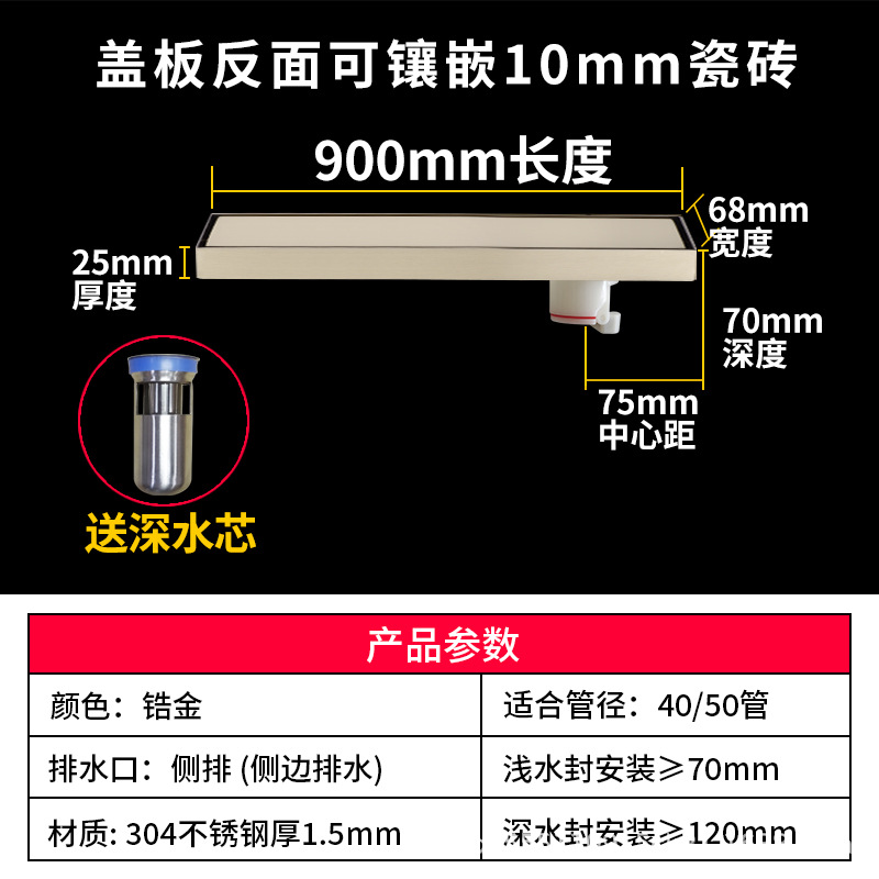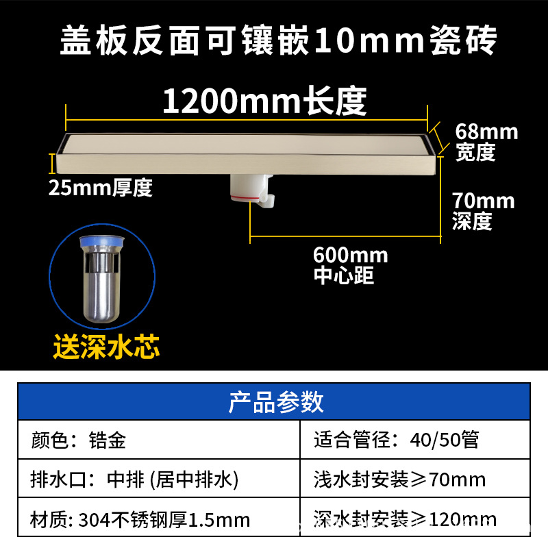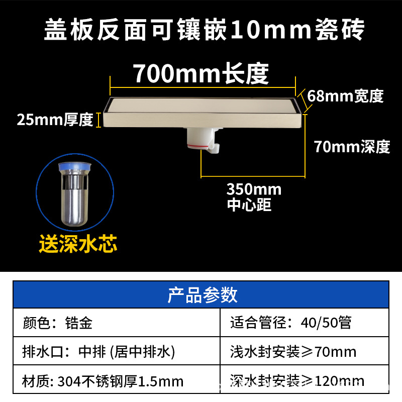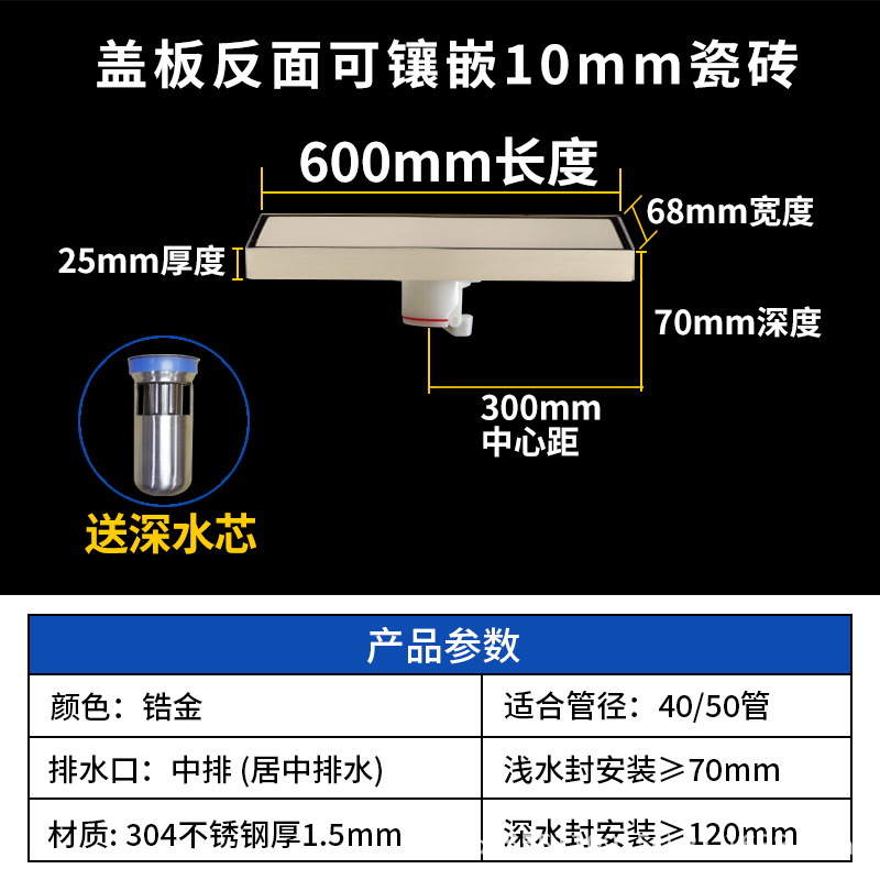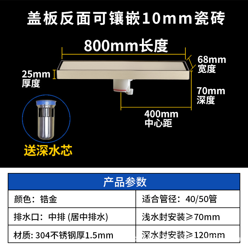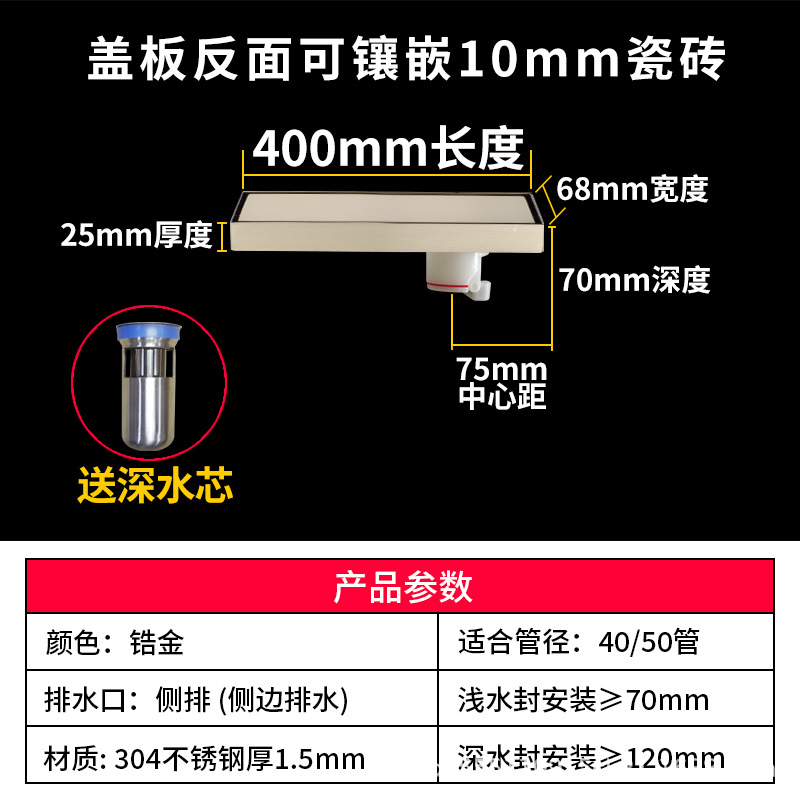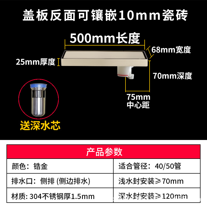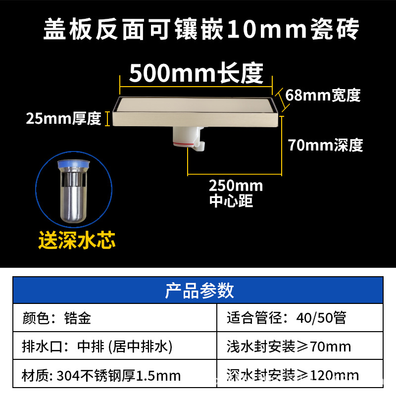 공장 직접 판매 보이지 않는 바닥 배수구 304 스테인레스 스틸 긴 스트립 지르코늄 골드 타일 방취 욕실스토어 가기