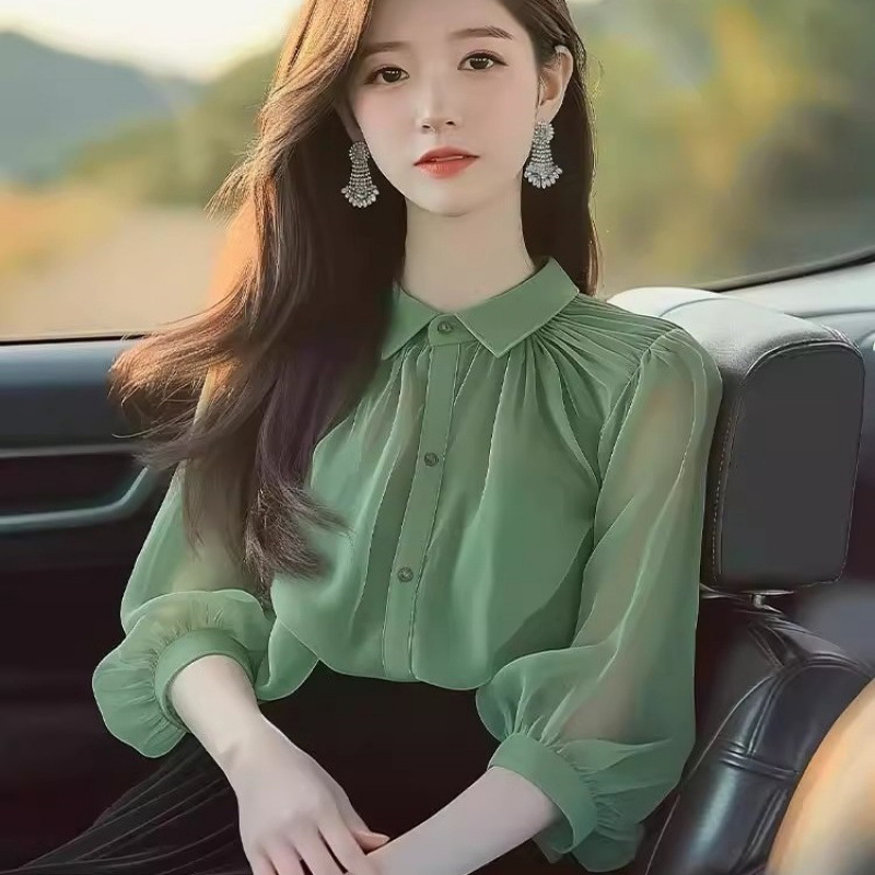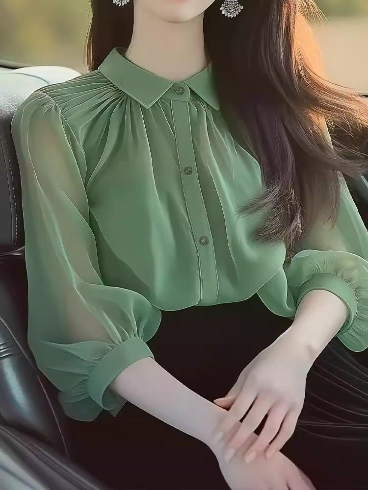 녹색 쉬폰 셔츠 여성의 2025 봄과 여름 서양 스타일 작은 셔츠 프랑스 우아한 선 스크린 슈퍼 아름다운 독특한 탑