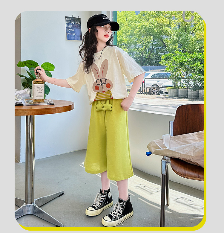 큰 어린이를위한 여름 얇은 반팔 티셔츠 정장 2025 여름 새로운 유행 7 점 바지 투피스 세트