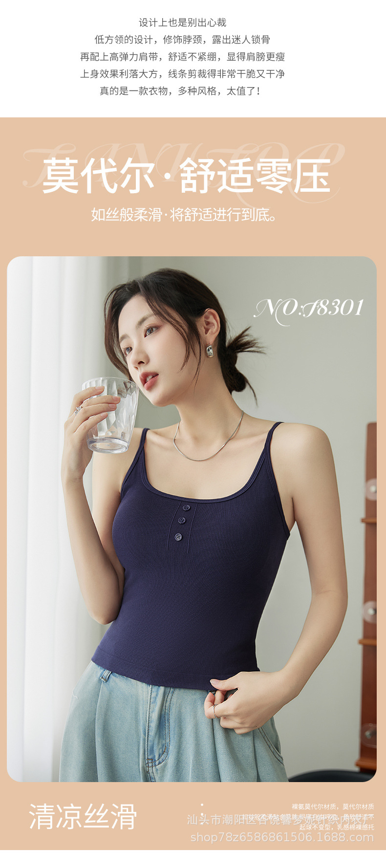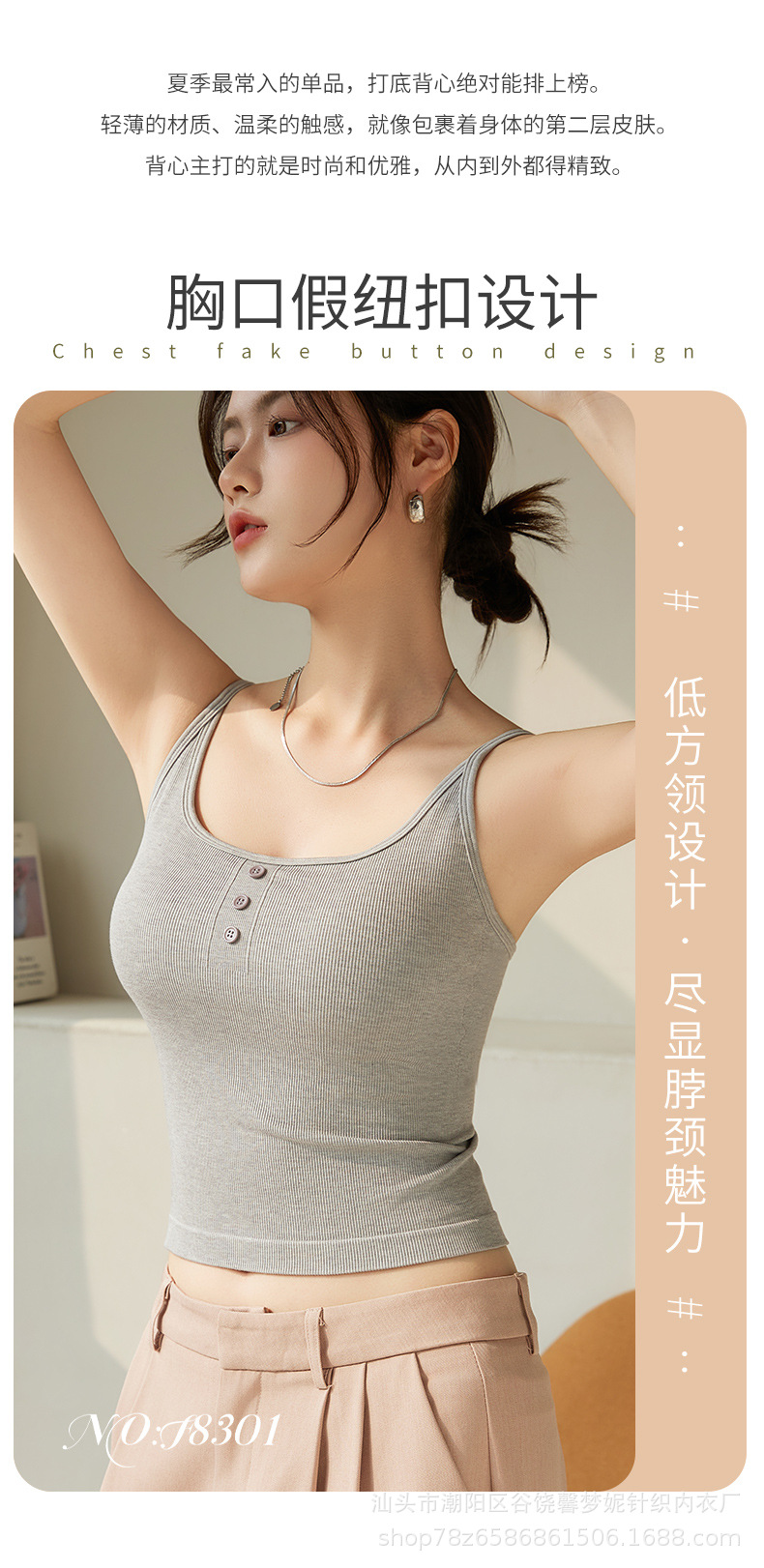섹시한 스퀘어 넥 스파게티 스트랩 캐미솔, 가슴 패드 포함, 여성용 아우터웨어, 아름다운 등, 다용도 슬리밍 탑, 가짜 버튼