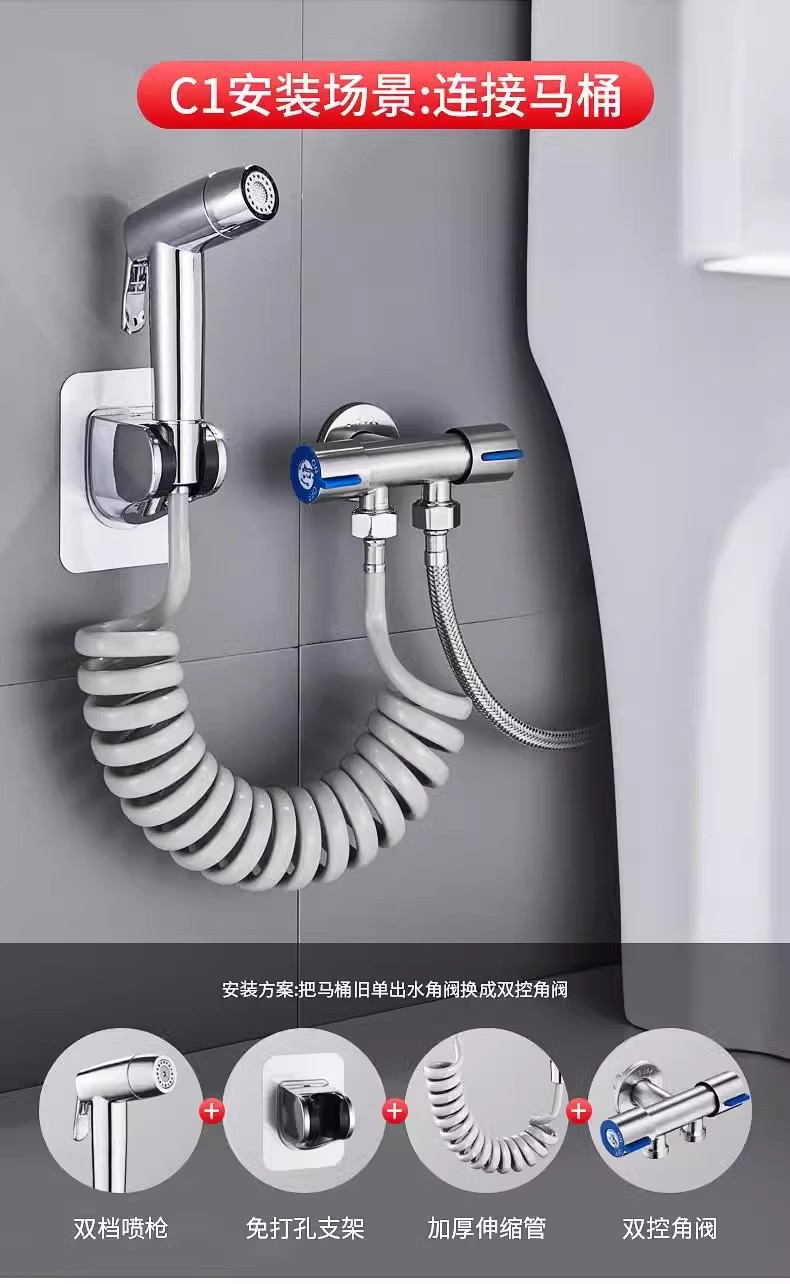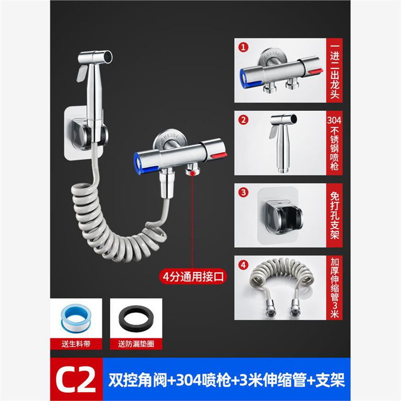 • [화장실 연결 C2] 이중 제어 앵글 밸브 + 304 스프레이 건 + 3m 텔레스코픽 튜브 + 브래킷