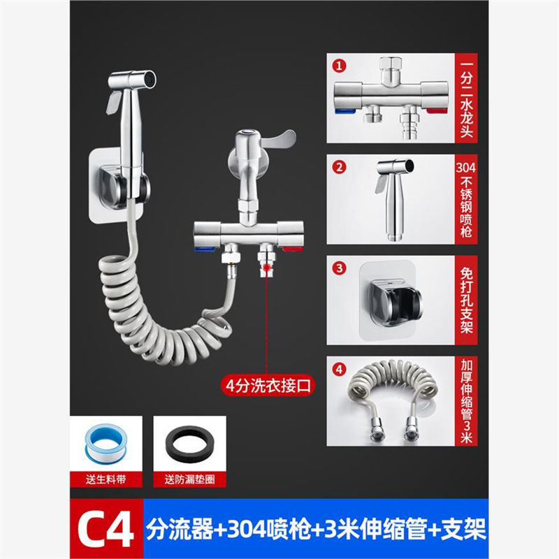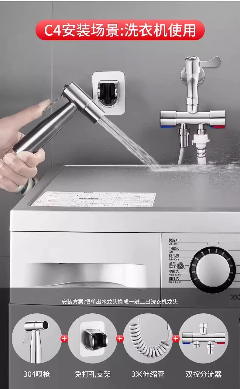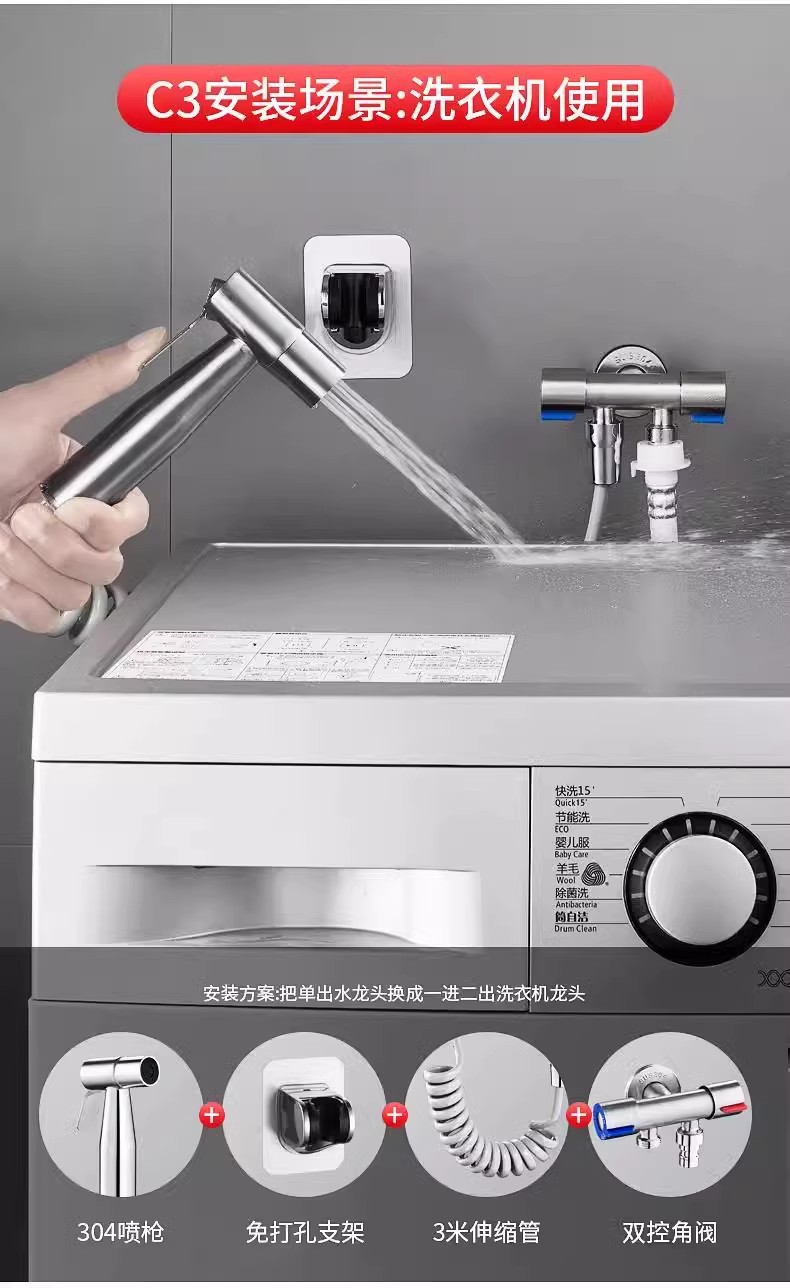 • [세탁기 C3 연결] 이중 조절 앵글 밸브 + 304 스프레이 건 + 3m 텔레스코픽 튜브 + 브래킷